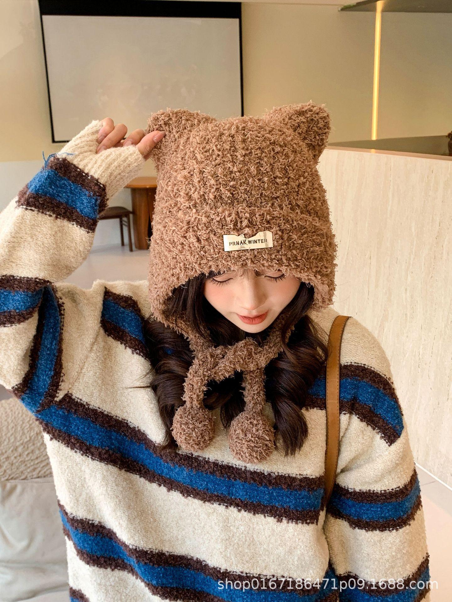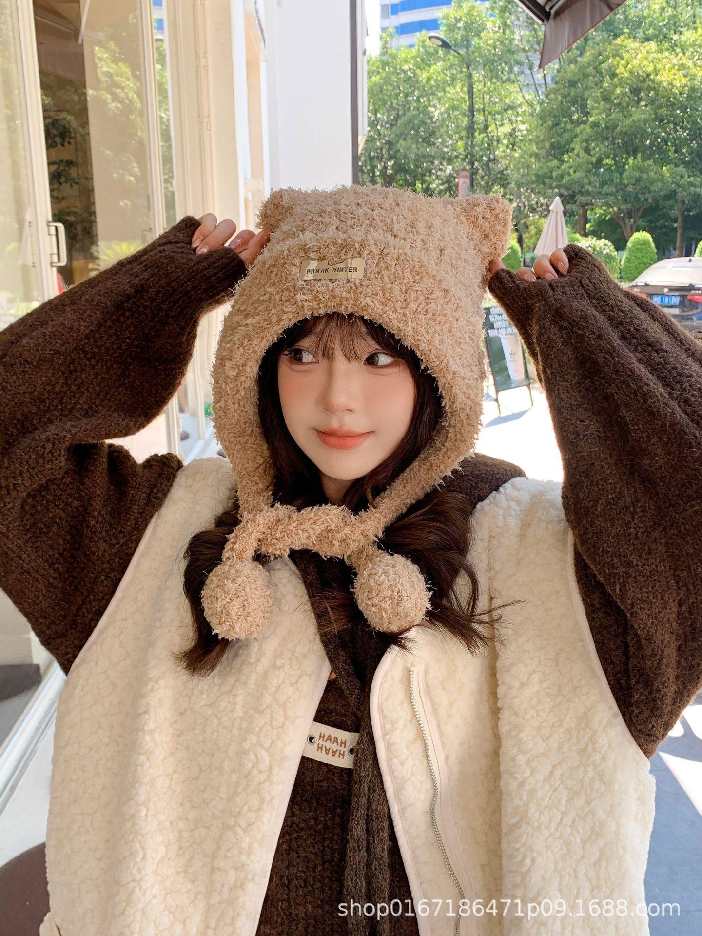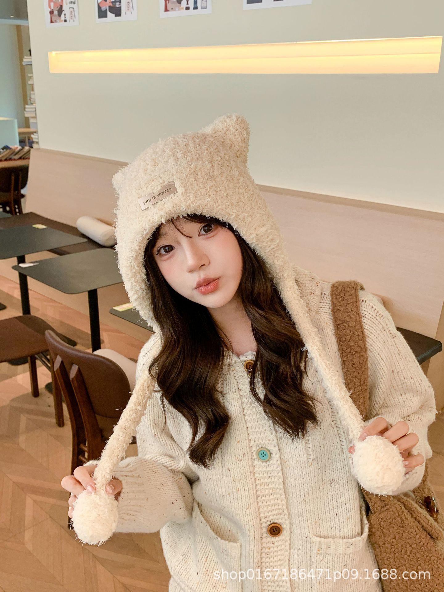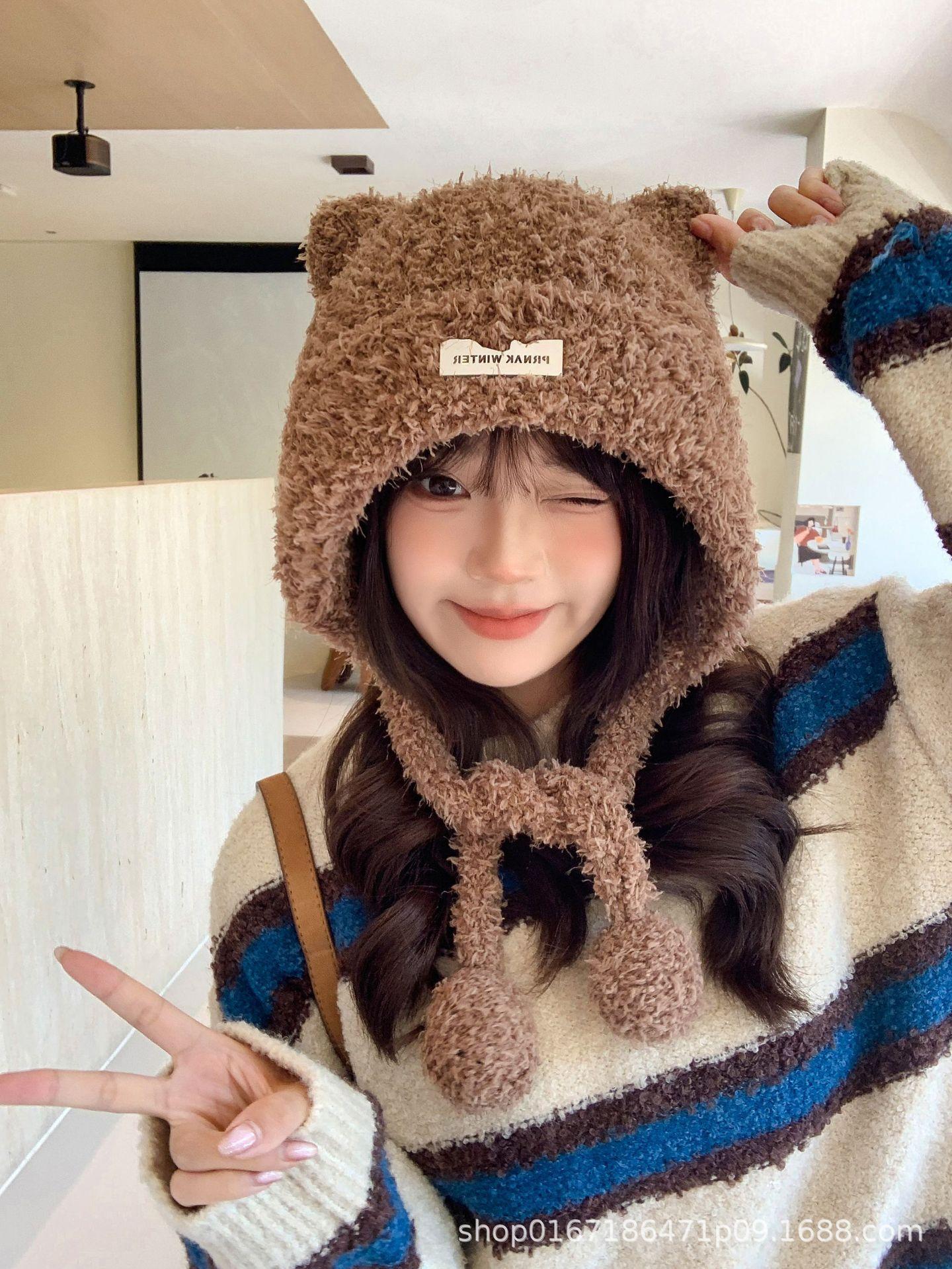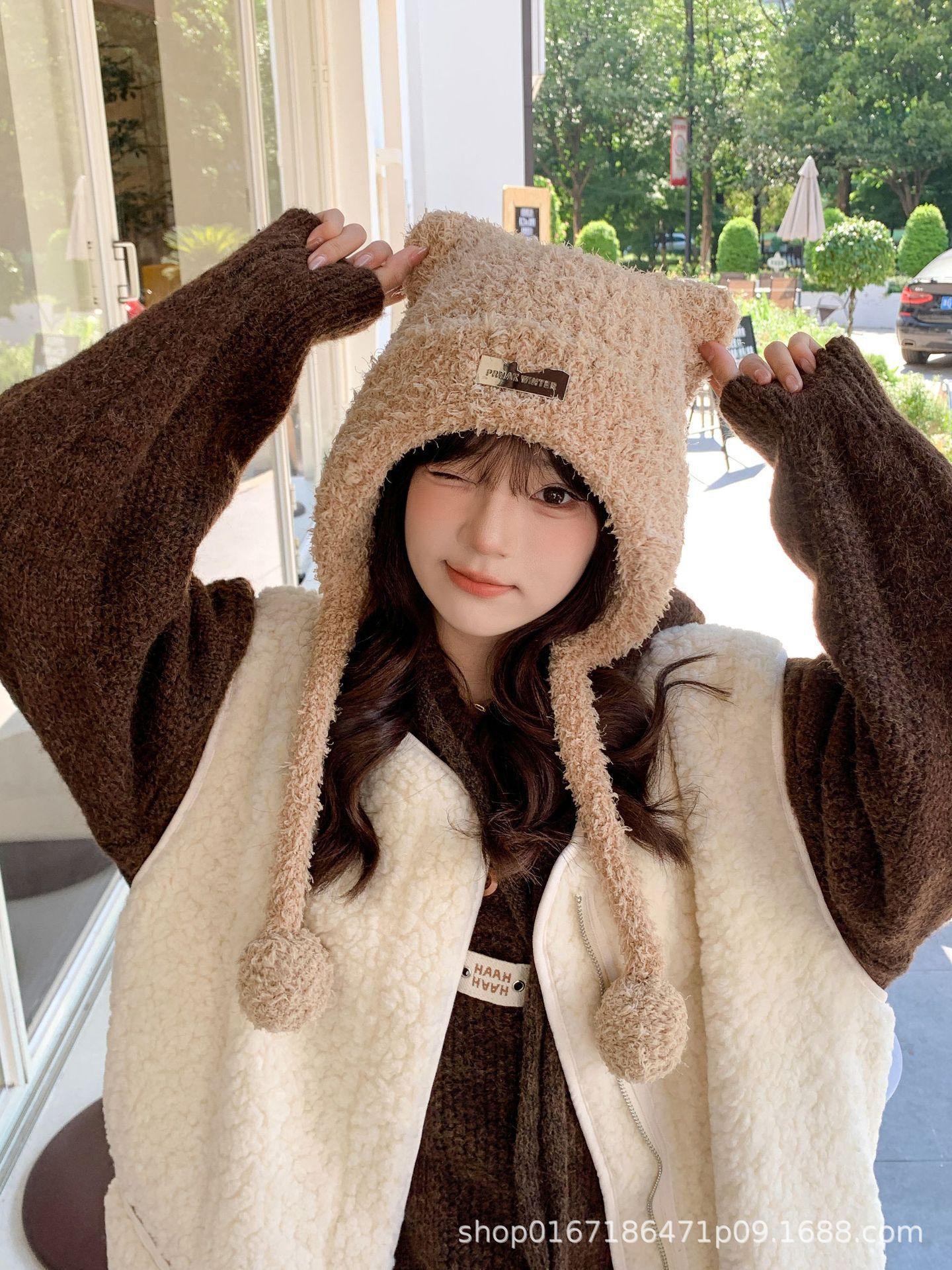 Gorro de oso bonito de otoño e invierno para mujer, de felpa, nuevo gorro de punto coreano, cálido y combinable con protección para las orejas, grueso y moderno.