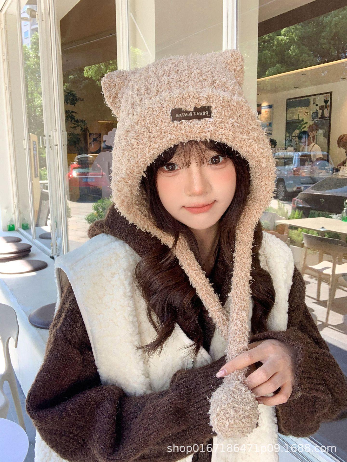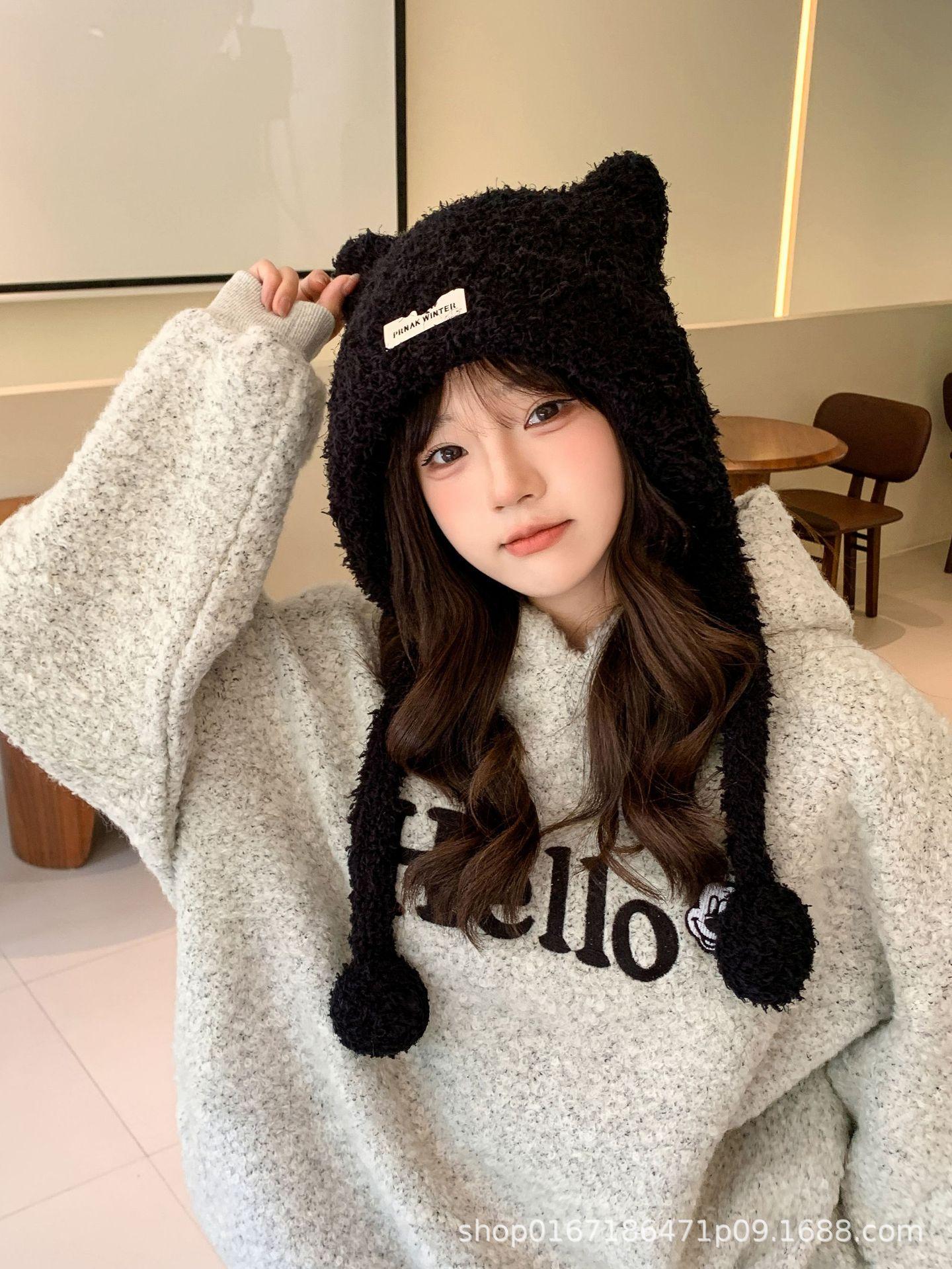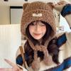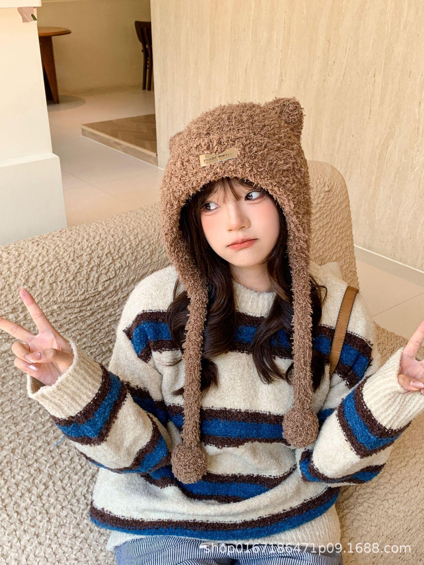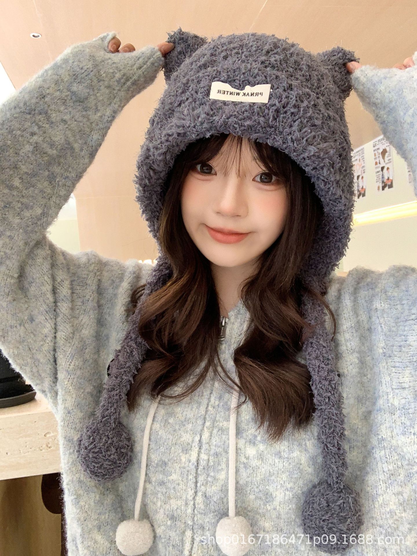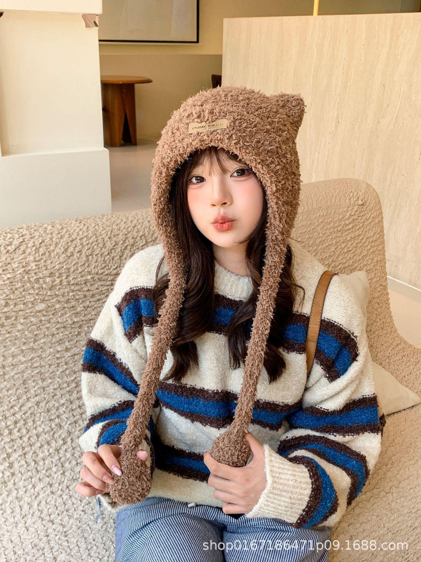 Gorro de oso bonito de otoño e invierno para mujer, de felpa, nuevo gorro de punto coreano, cálido y combinable con protección para las orejas, grueso y moderno.