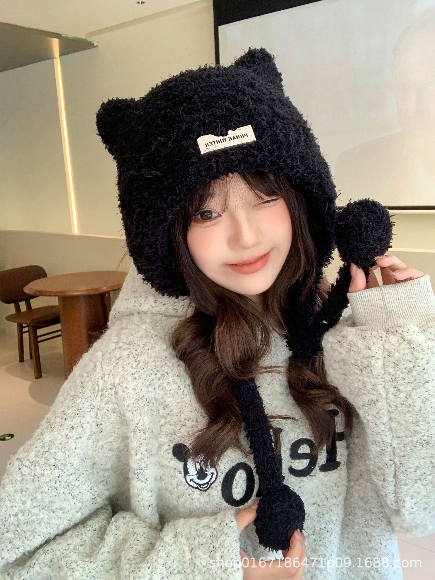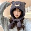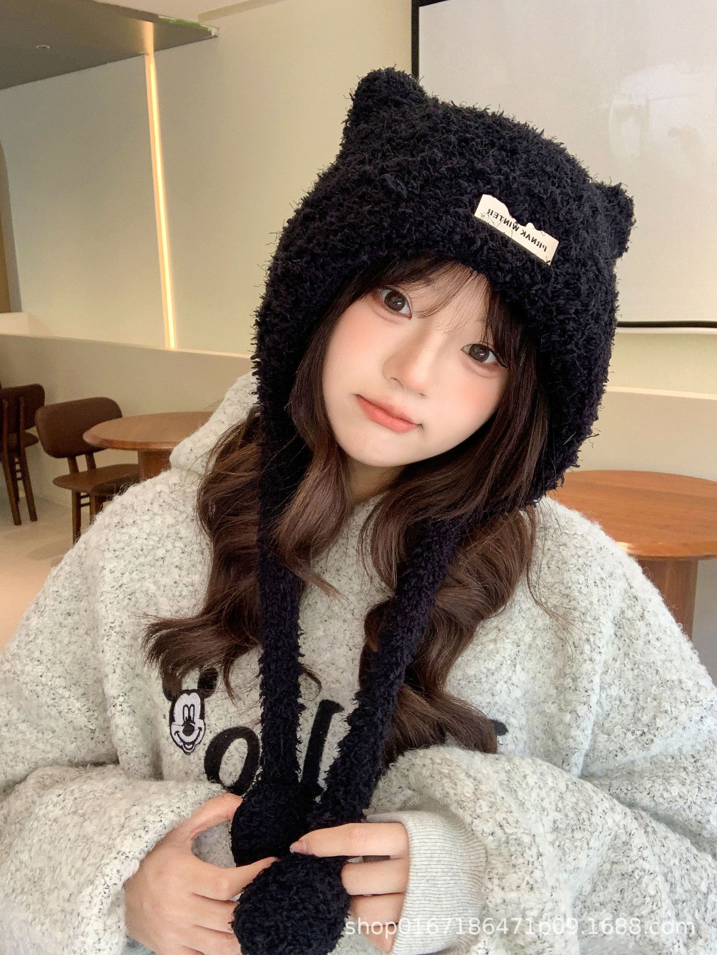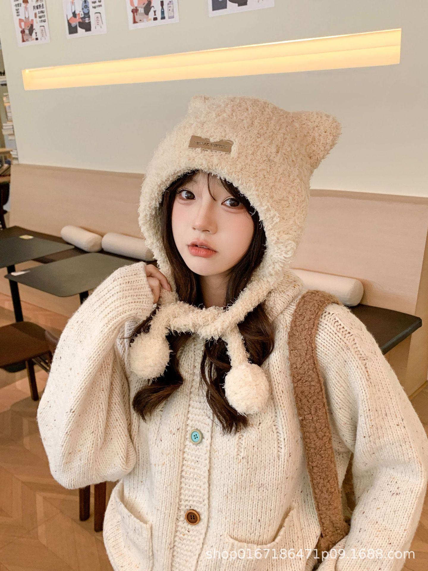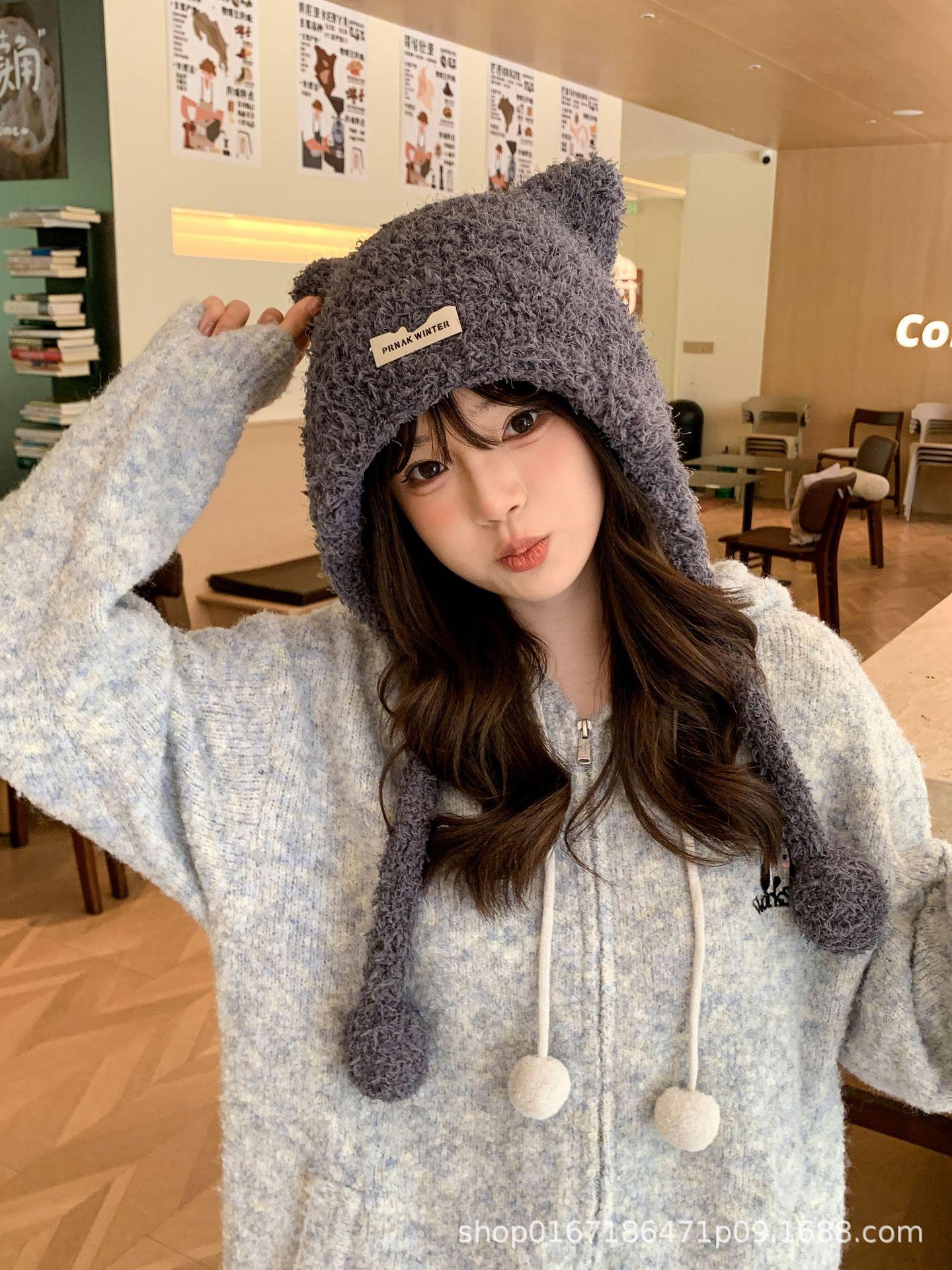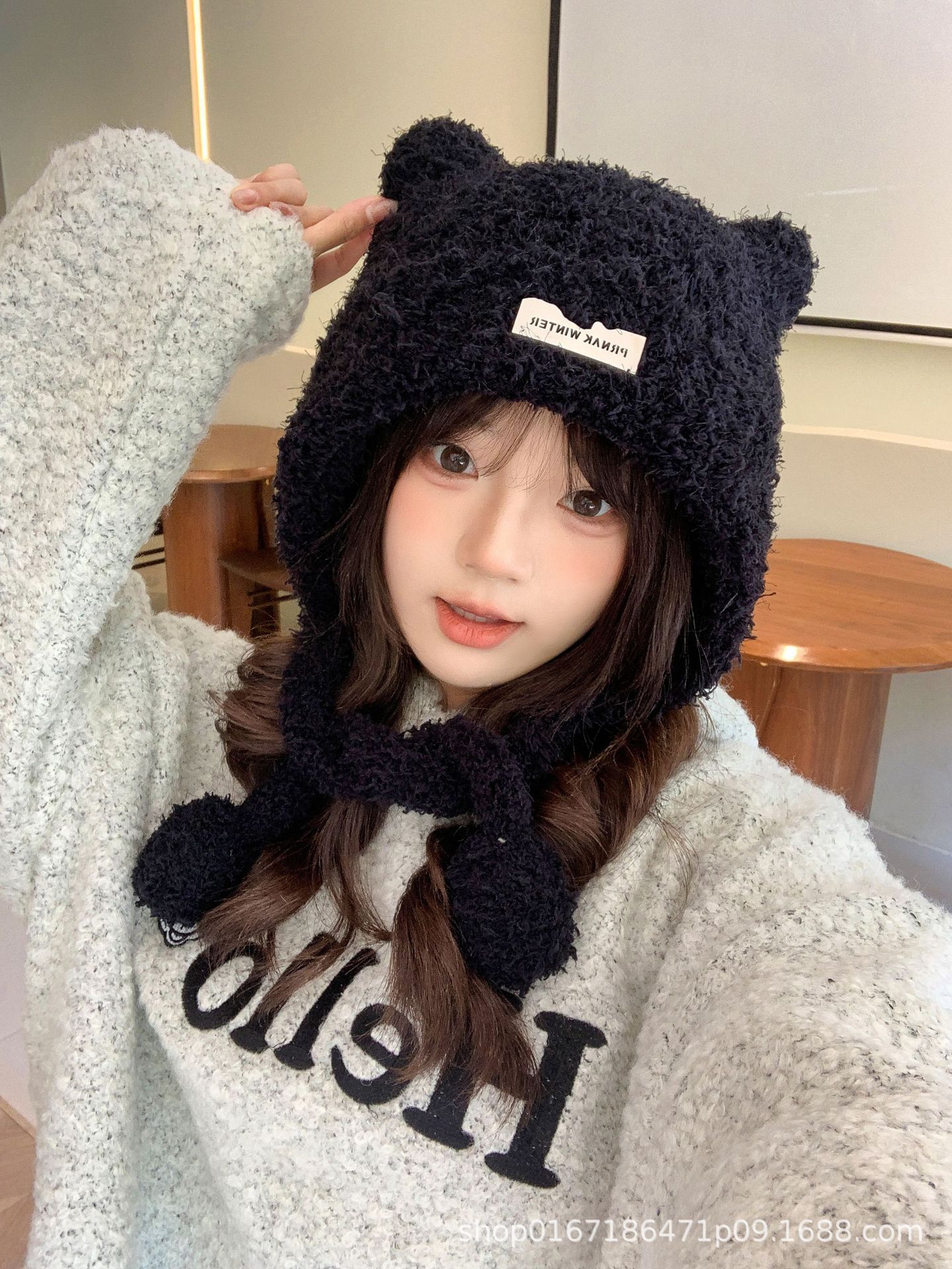 Gorro de oso bonito de otoño e invierno para mujer, de felpa, nuevo gorro de punto coreano, cálido y combinable con protección para las orejas, grueso y moderno.