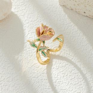 Exquisito anillo abierto de rosa con goteo de aceite de esmalte, nicho de alta gama, súper hada floral, anillo ajustable, anillo para mujer