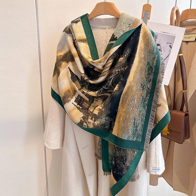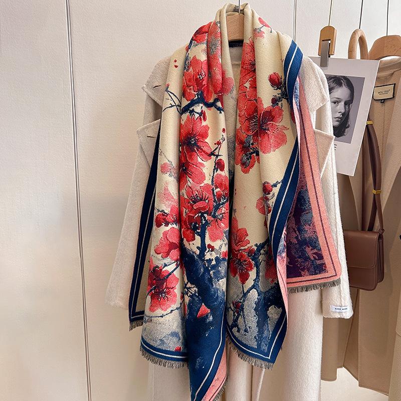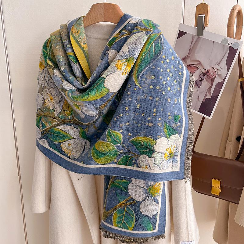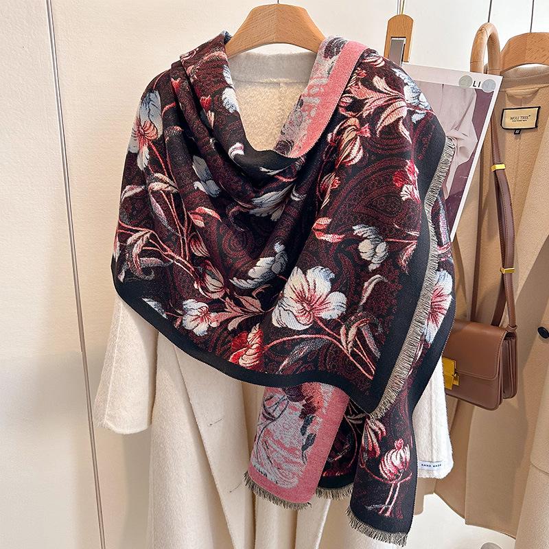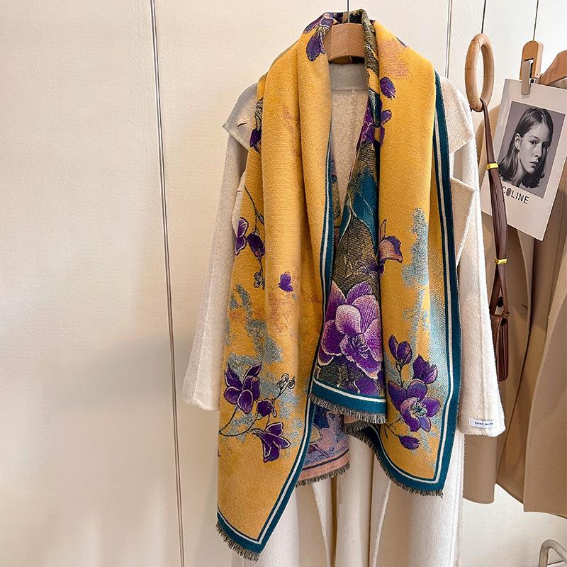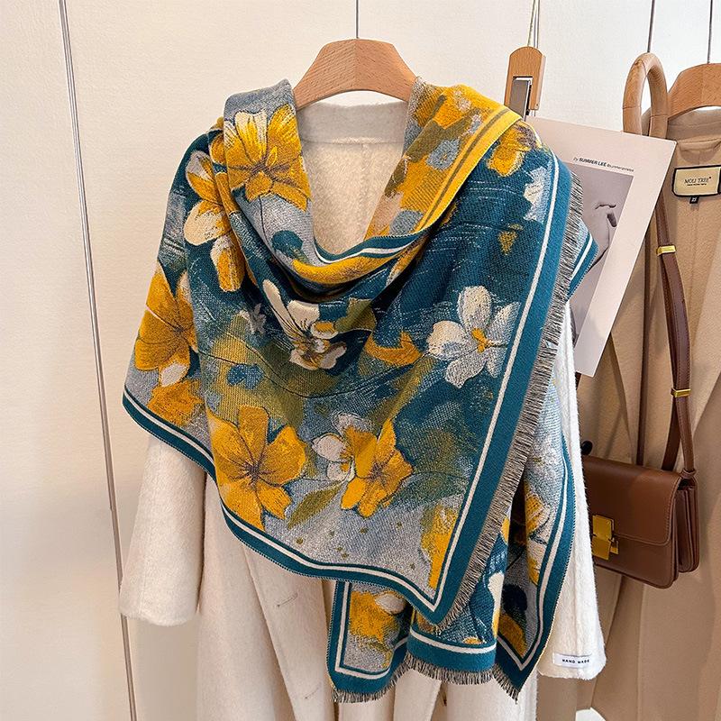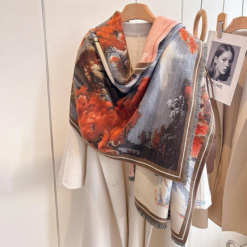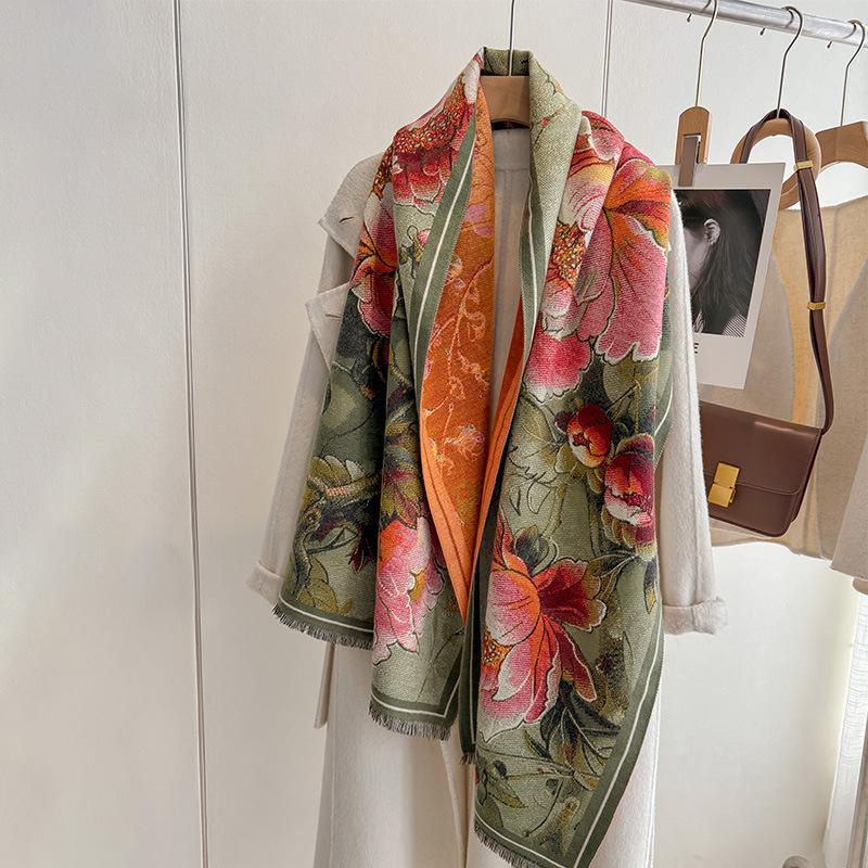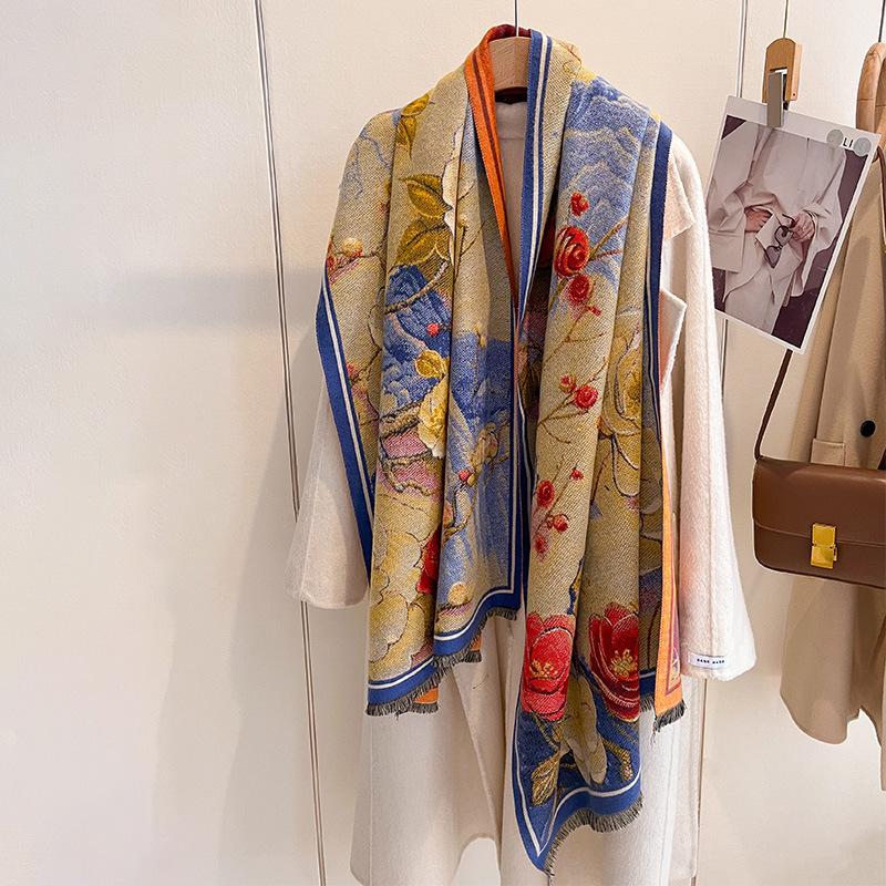 Otoño e Invierno Estilo Nacional Planta Flor Nuevo Estilo Pintura de Paisaje Elegante Bufanda Cálida de Imitación Cachemira para Mujer Moda Chal Vintage