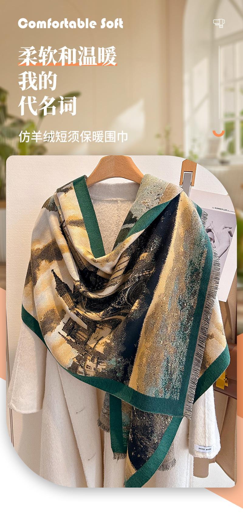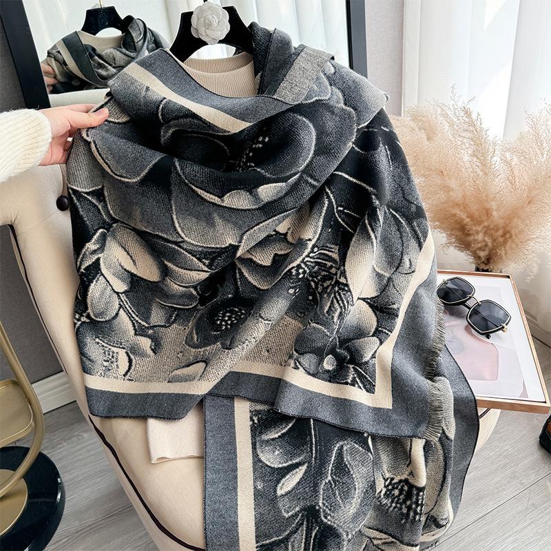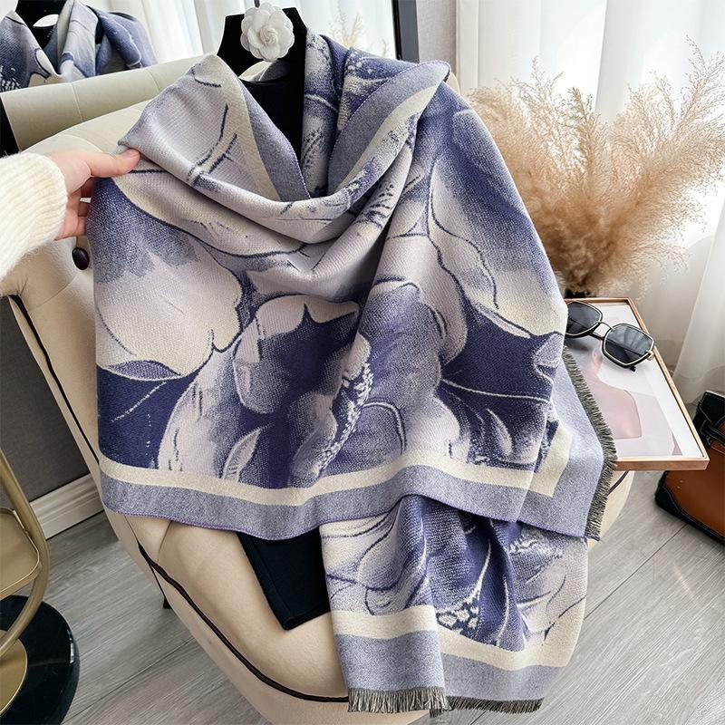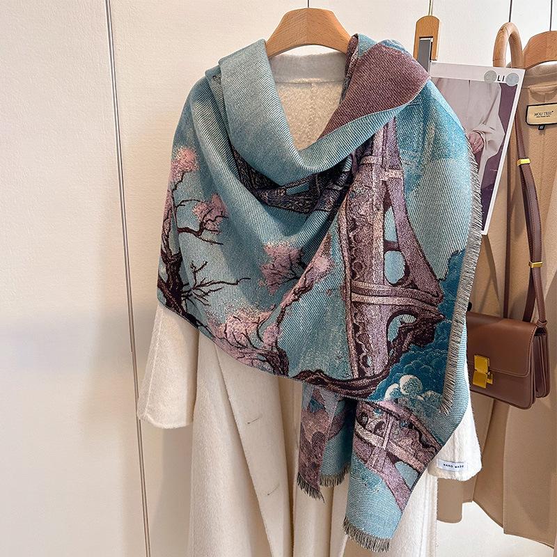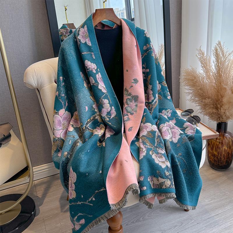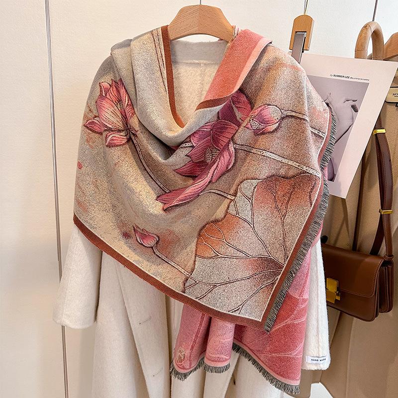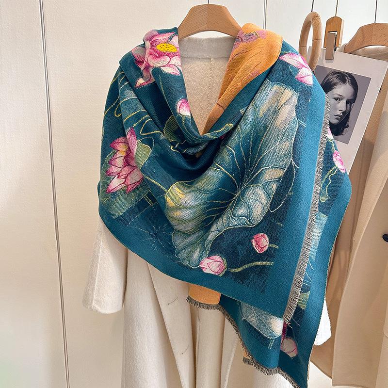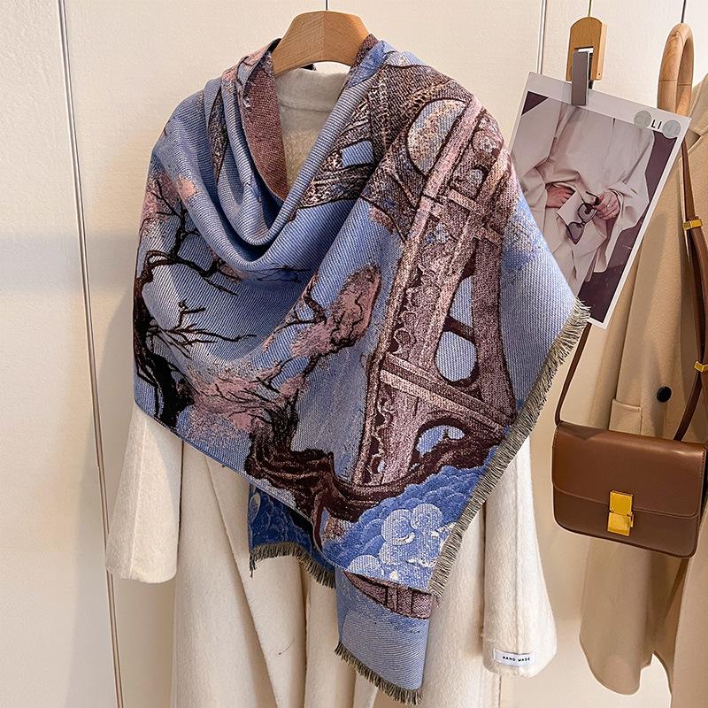 Otoño e Invierno Estilo Nacional Planta Flor Nuevo Estilo Pintura de Paisaje Elegante Bufanda Cálida de Imitación Cachemira para Mujer Moda Chal Vintage
