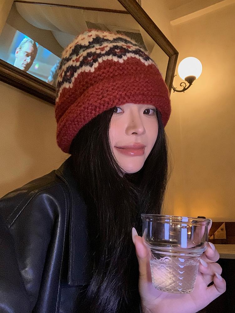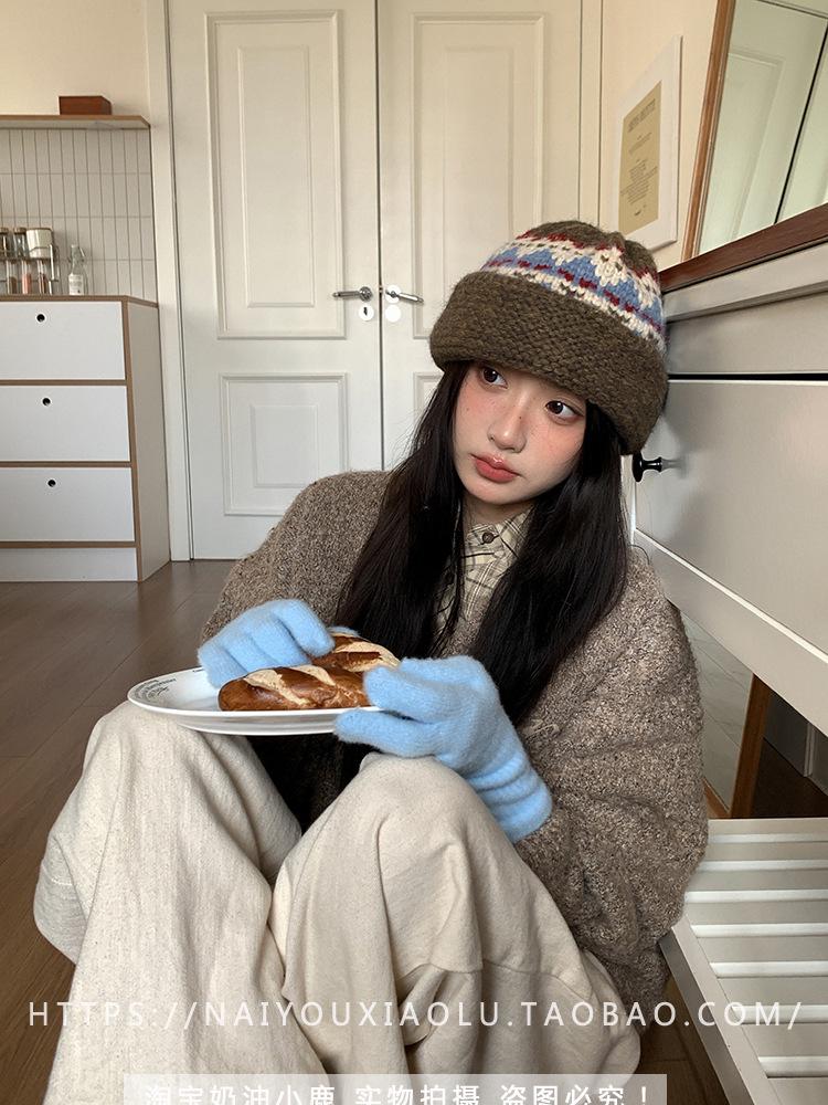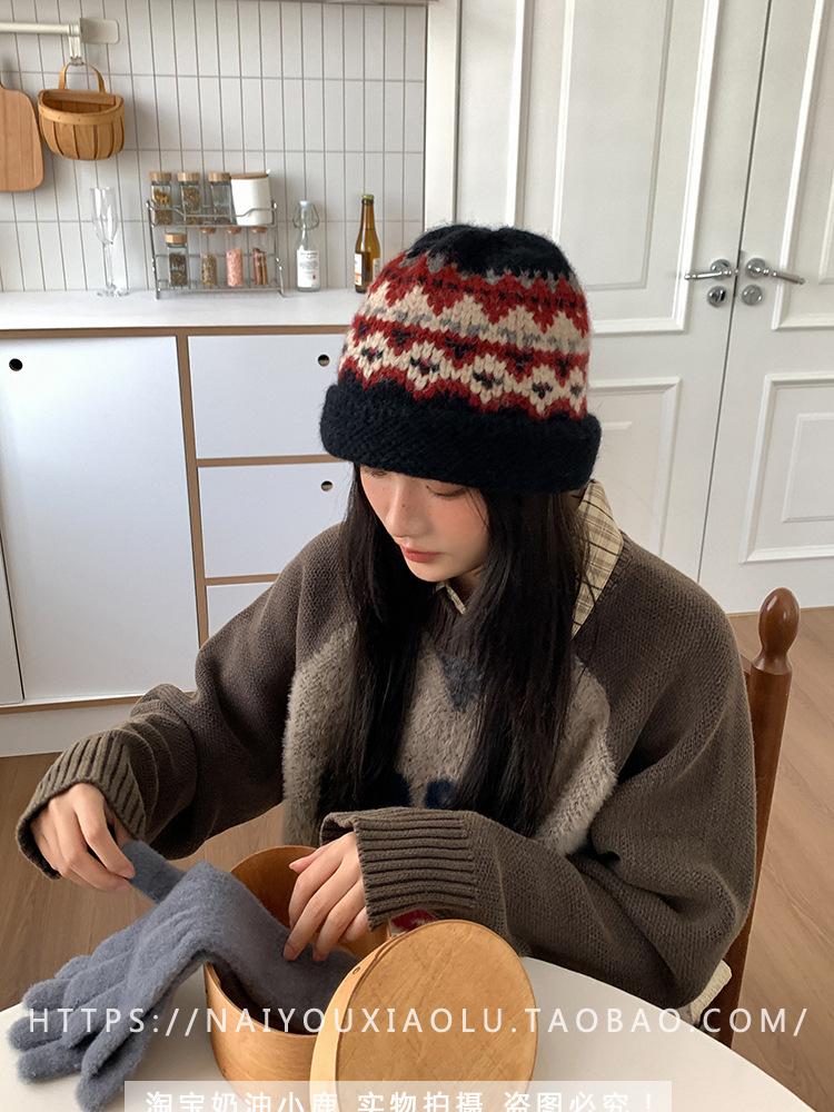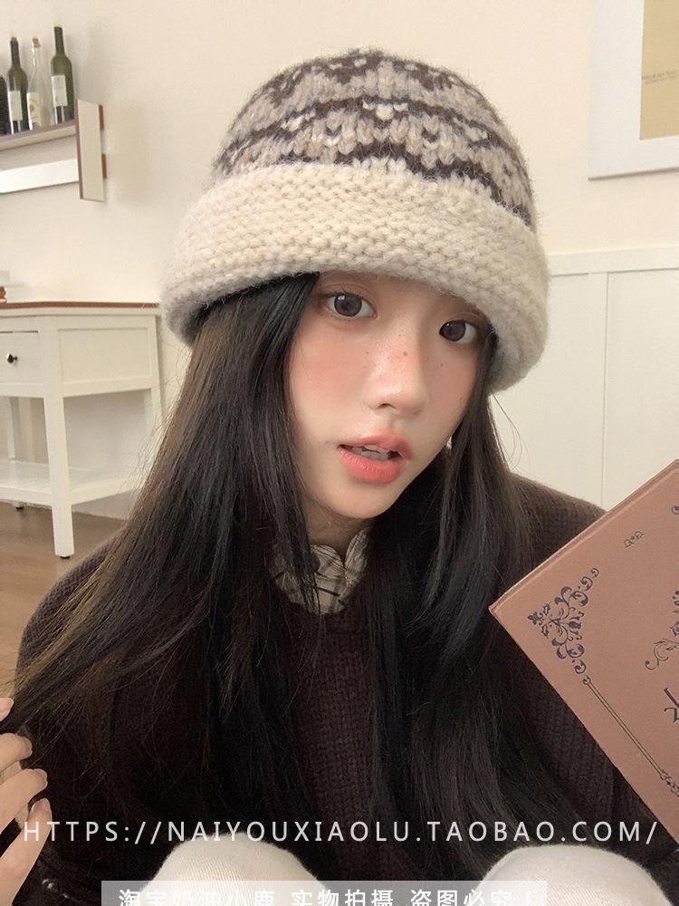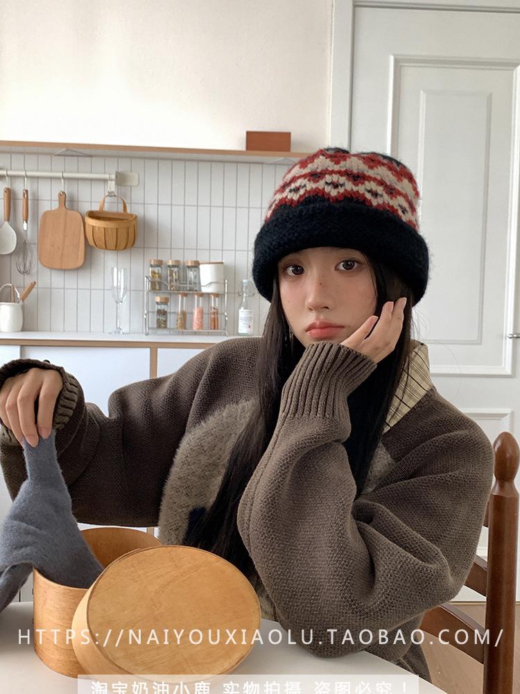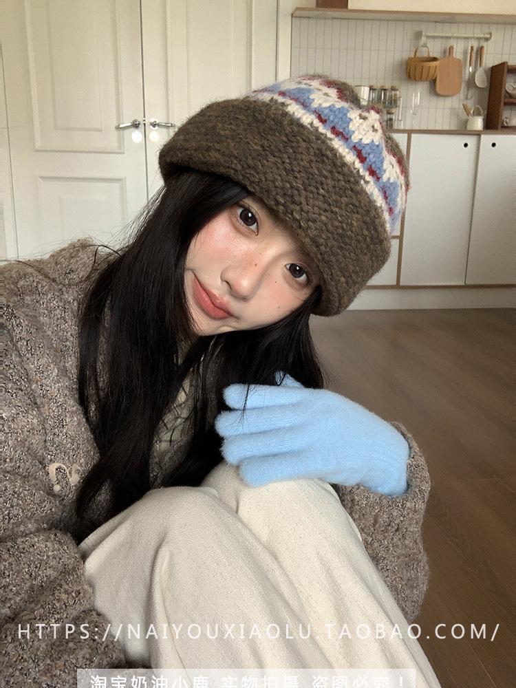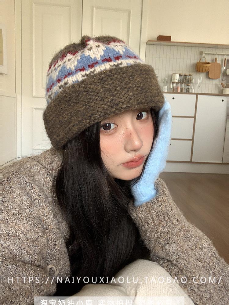 Gorro de punto estilo Fairisland para mujer, otoño e invierno, estilo vintage, con protección para las orejas, de lana, grueso y cálido, Baotou.