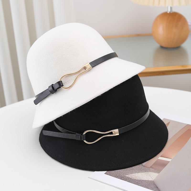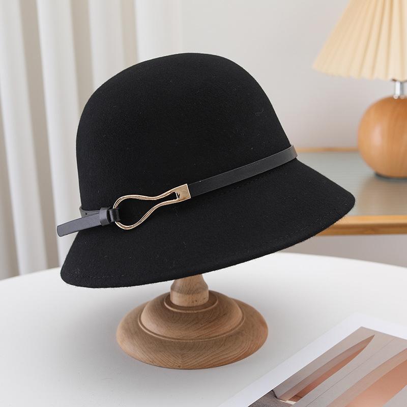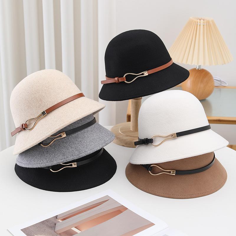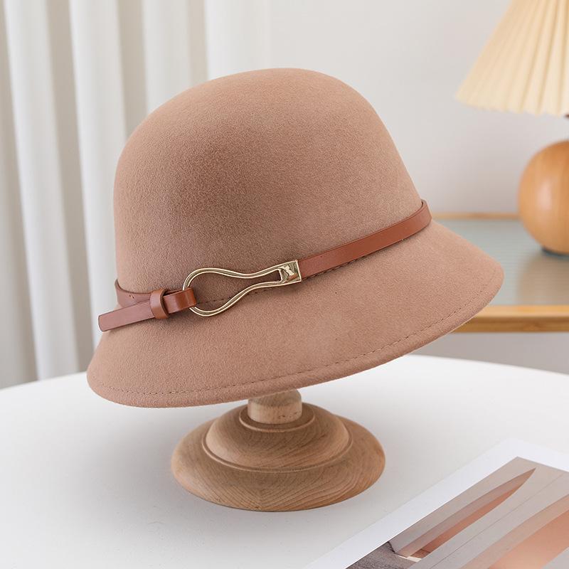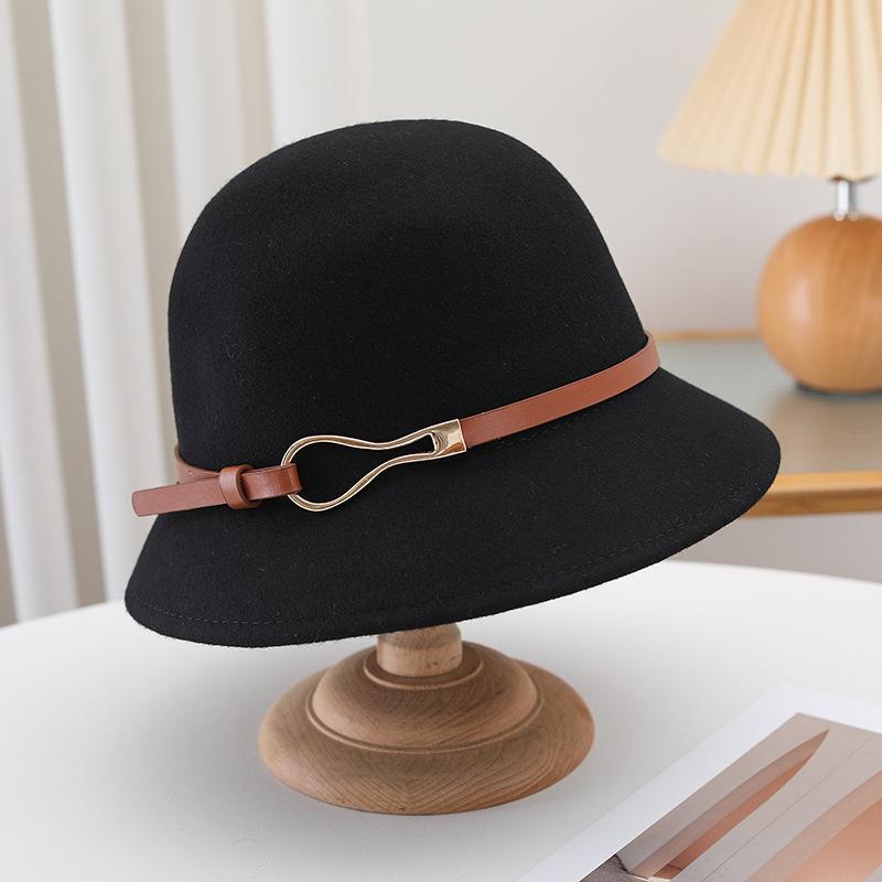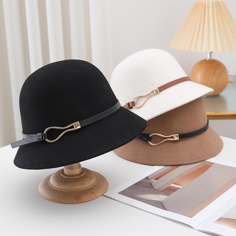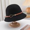 Sombrero de copa de lana con hebilla de cinturón para mujer, estilo Hepburn de otoño e invierno, sensación de rostro pequeño, sombrero de pescador de cúpula vintage