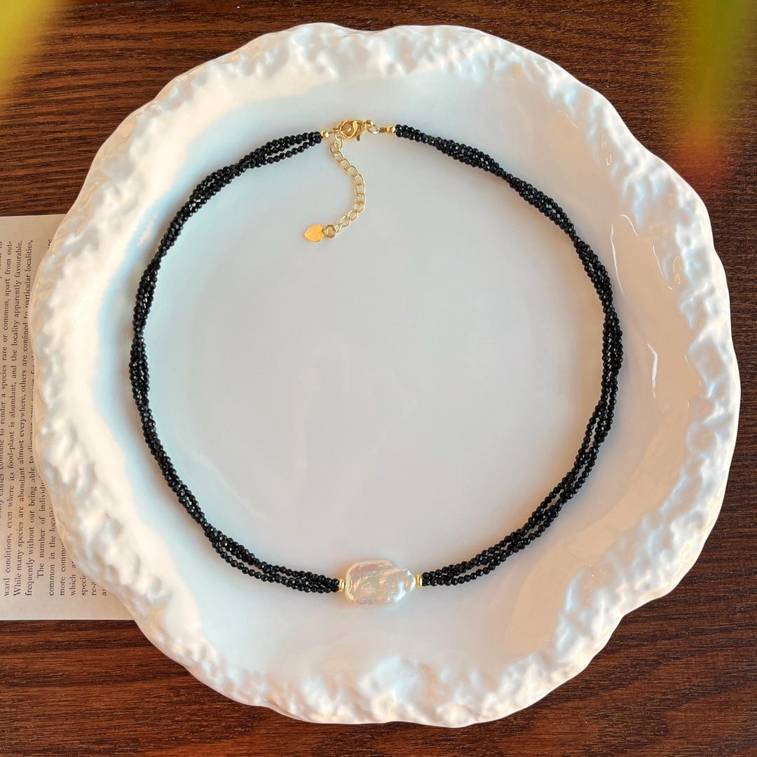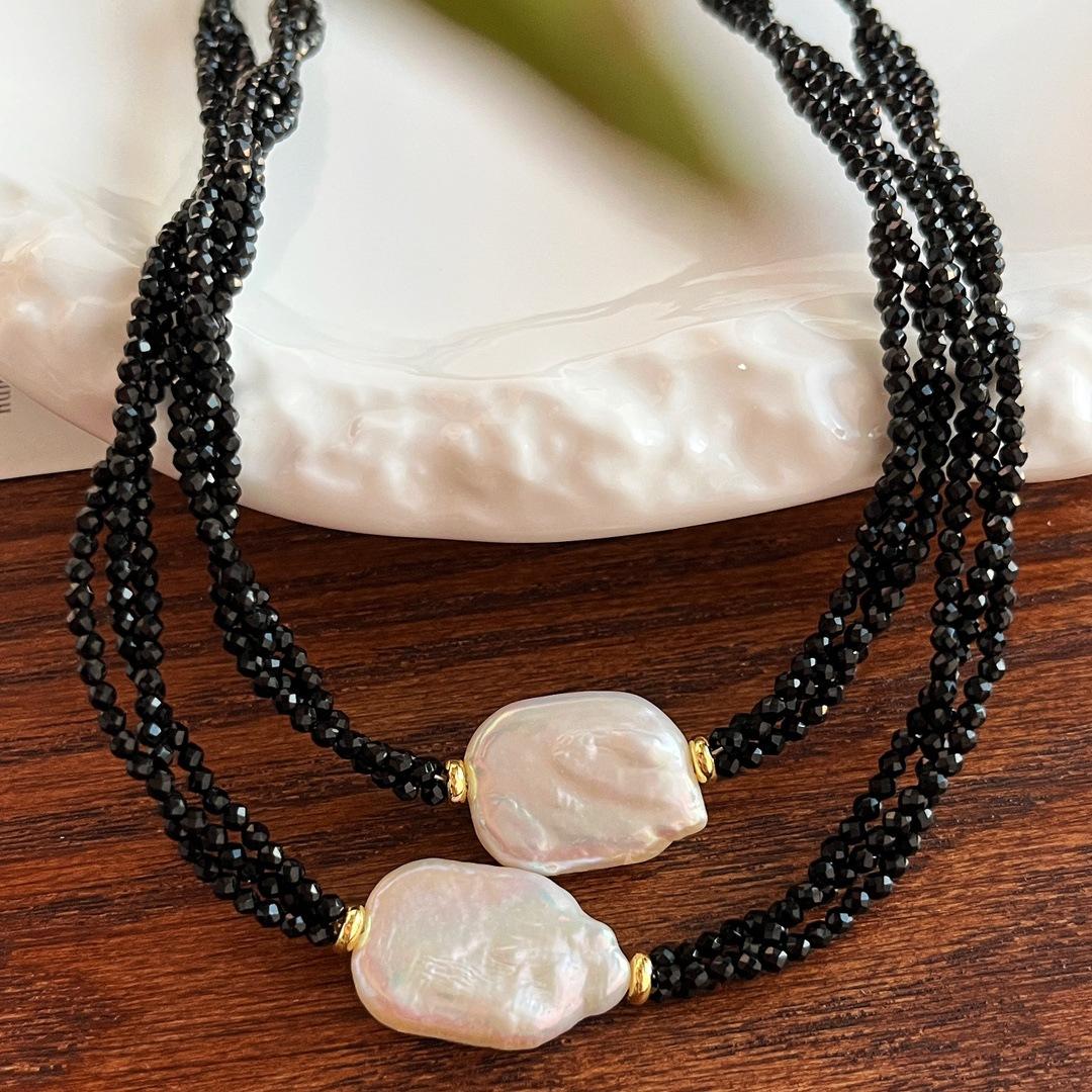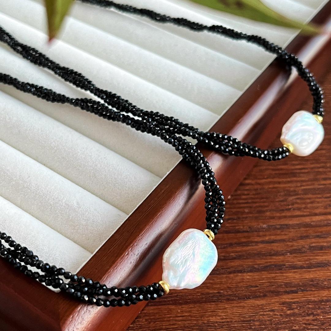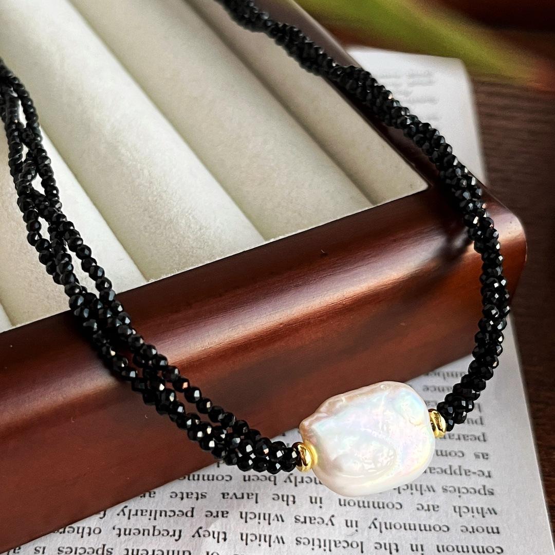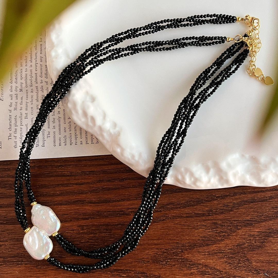 Collar Guofeng Vintage Perla Barroca Natural Espinela Negra Imitación Enrollado Multicapa Cruz Cadena Clavícula