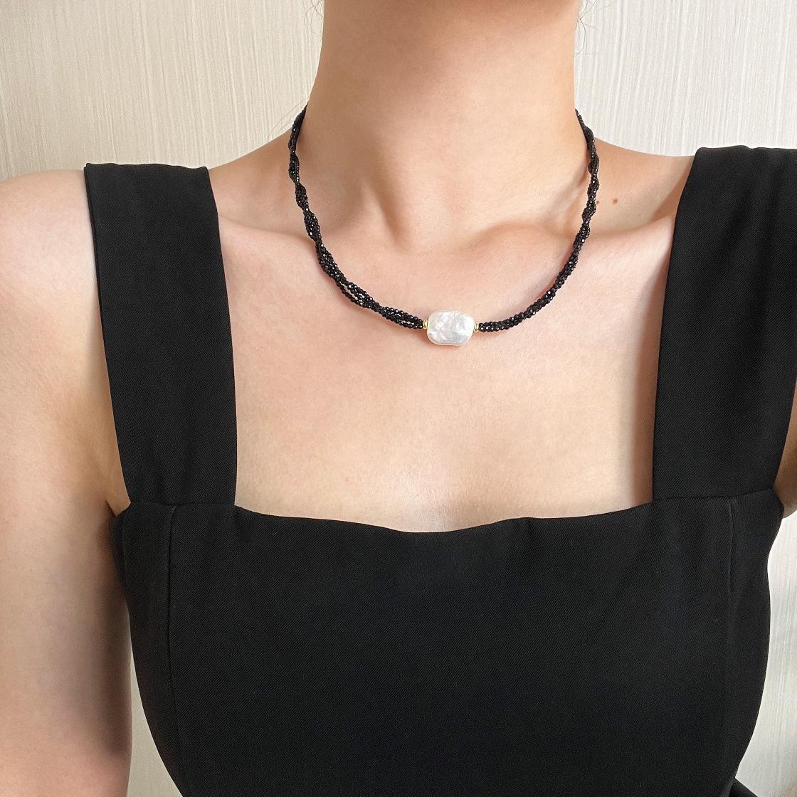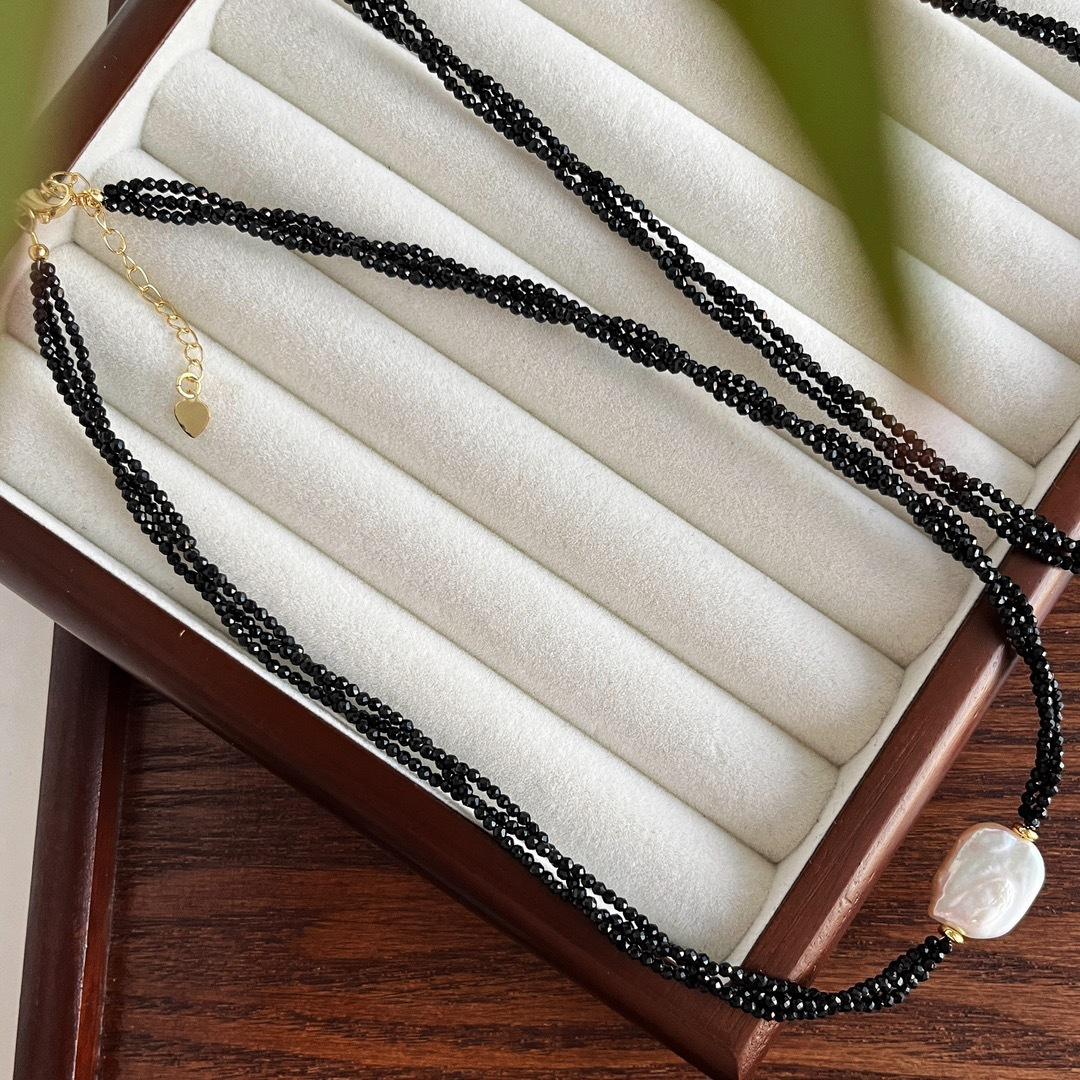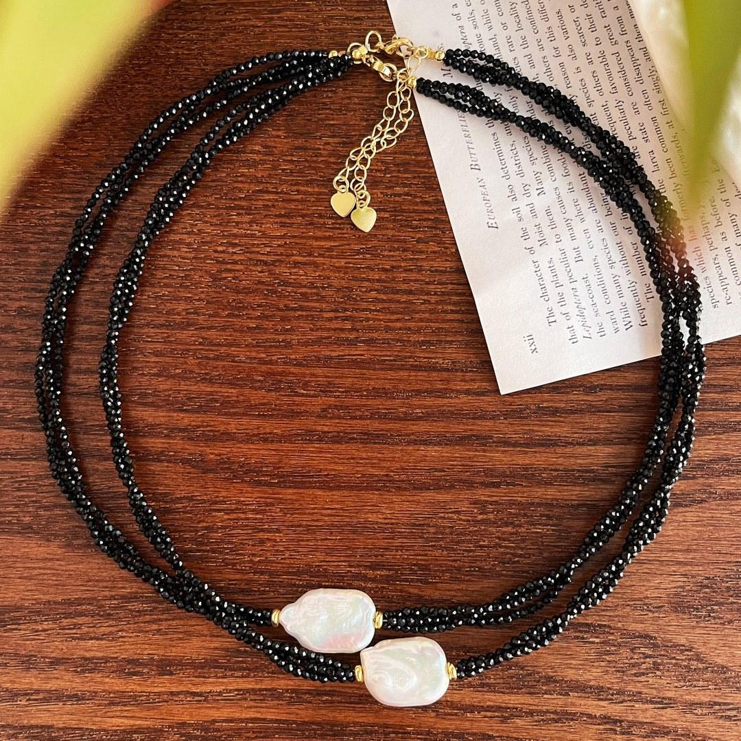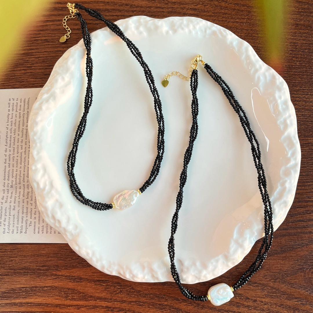 Collar Guofeng Vintage Perla Barroca Natural Espinela Negra Imitación Enrollado Multicapa Cruz Cadena Clavícula