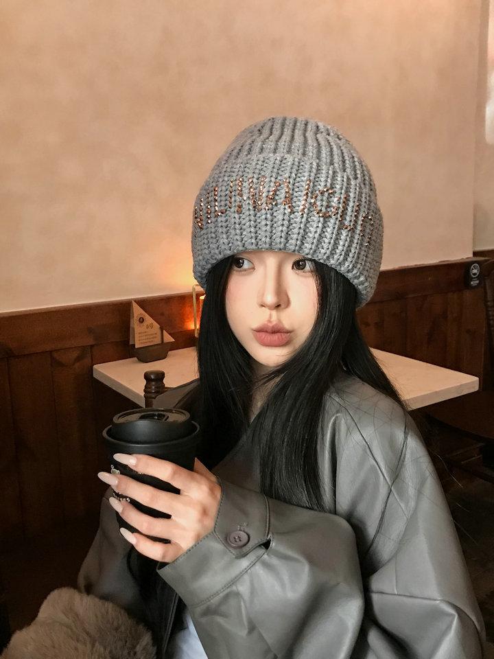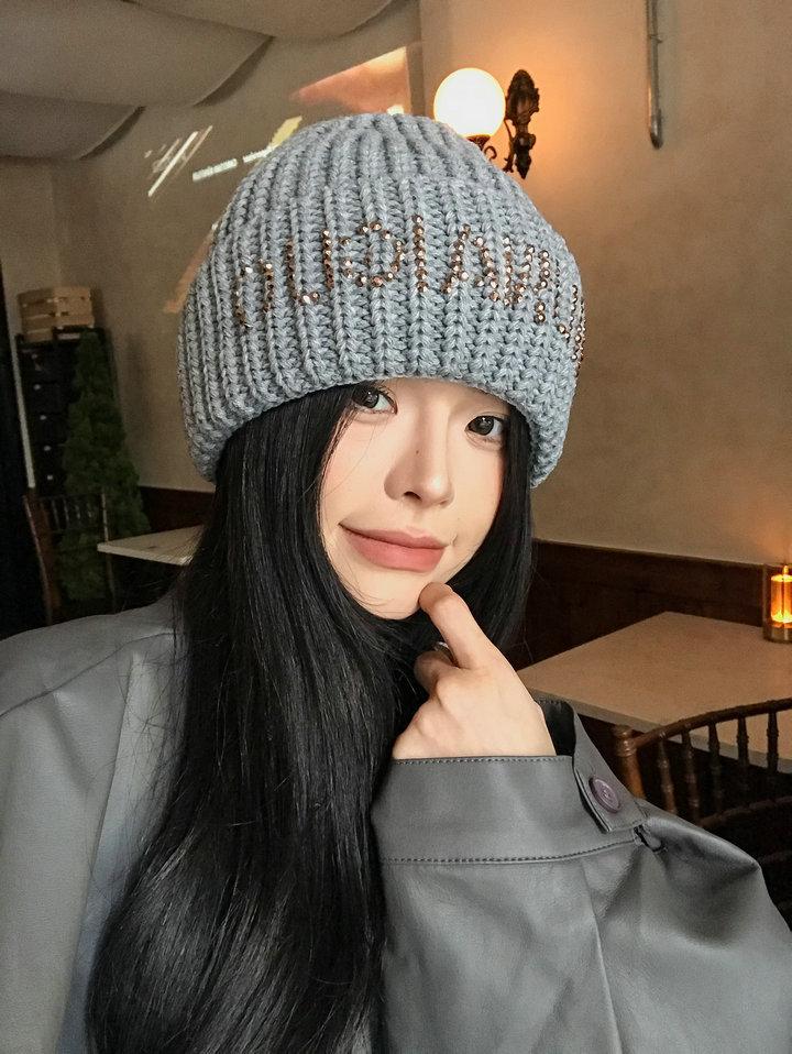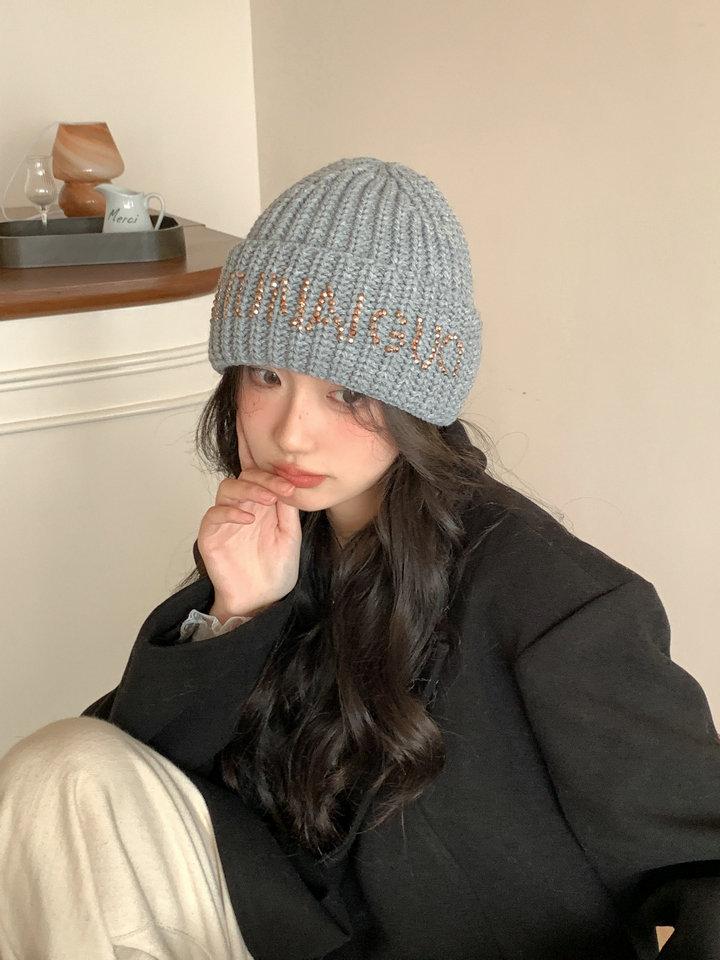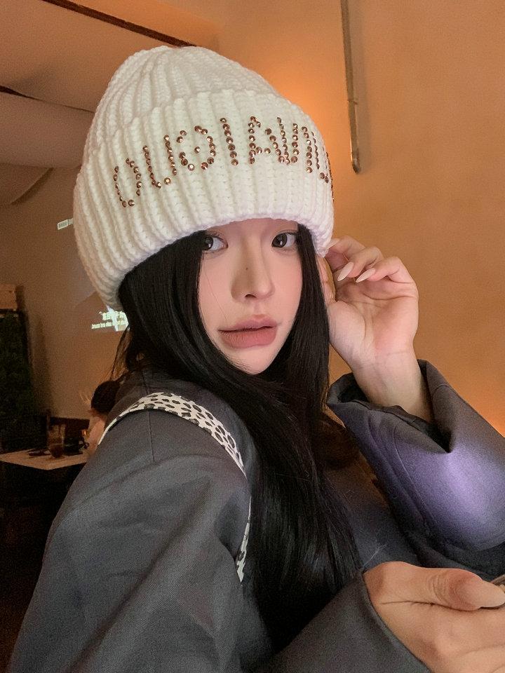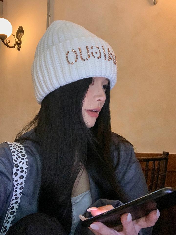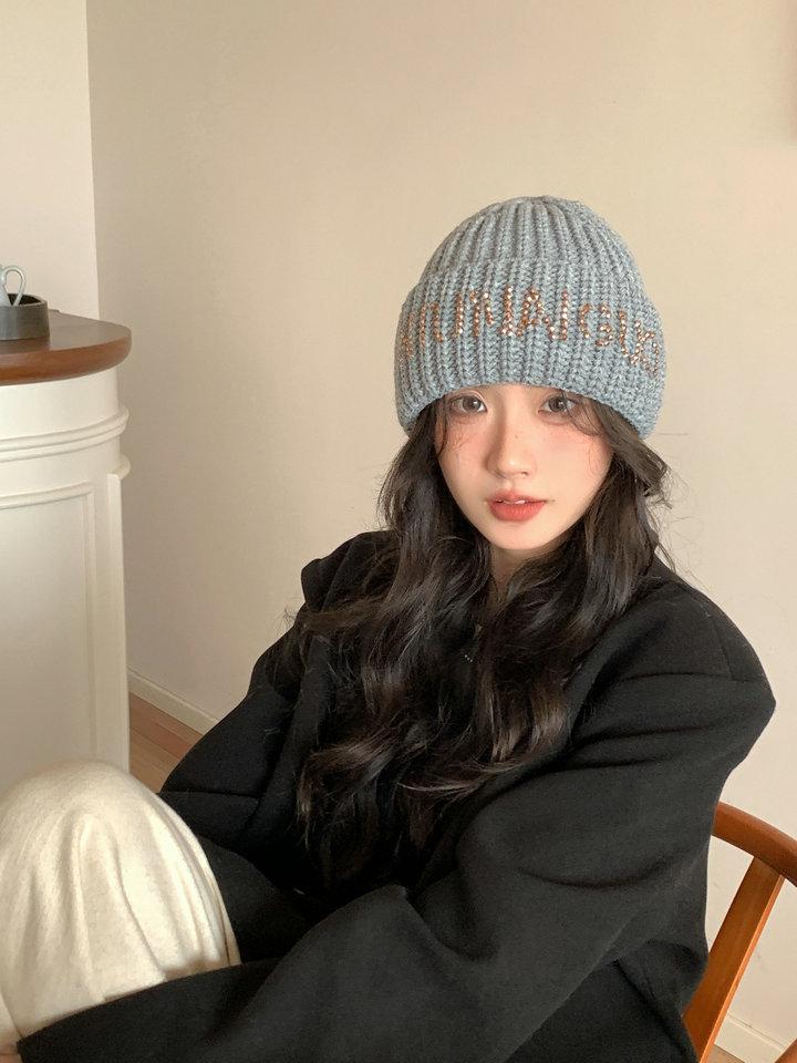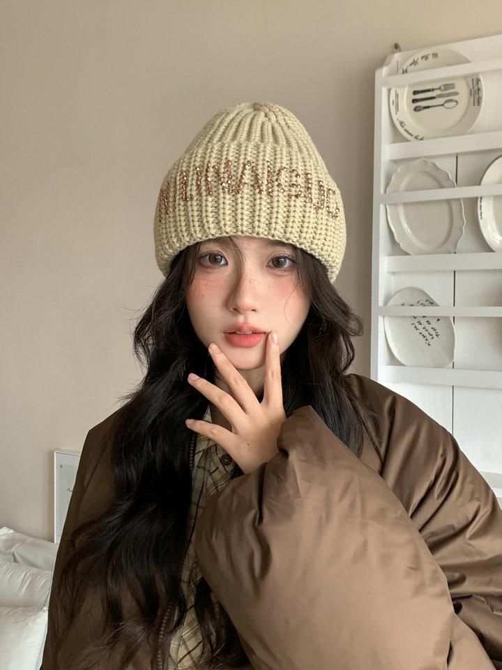 Gorro de lana con letras de diamante para mujer, cálido gorro de protección auditiva para otoño e invierno, estilo coreano, gorro de punto de moda Wai con cabeza grande, gorro frío