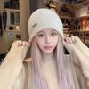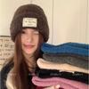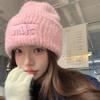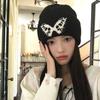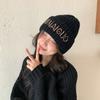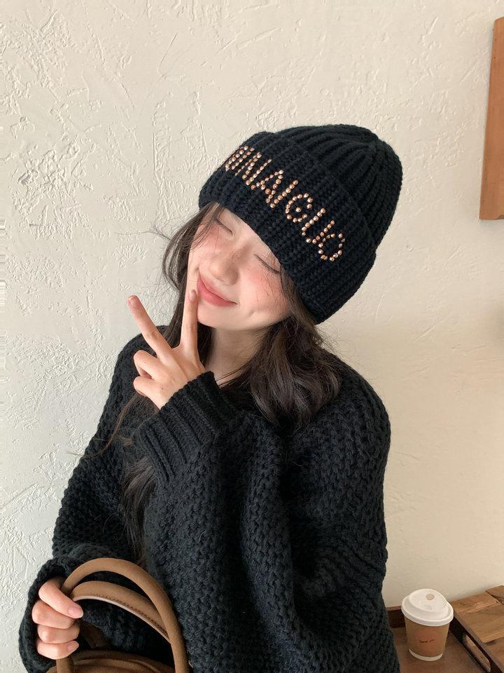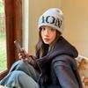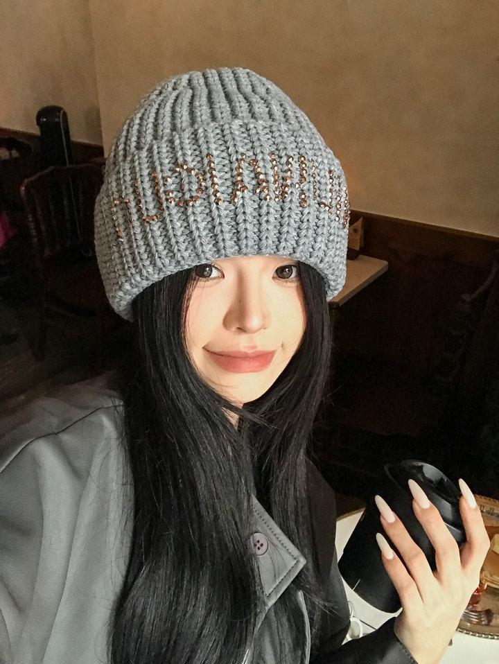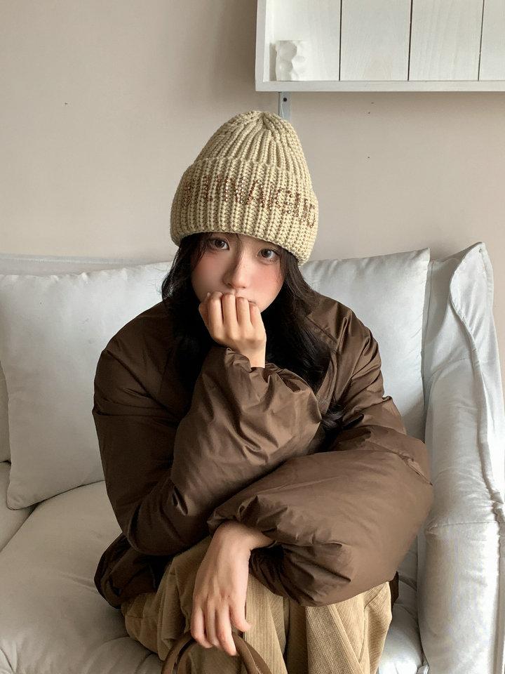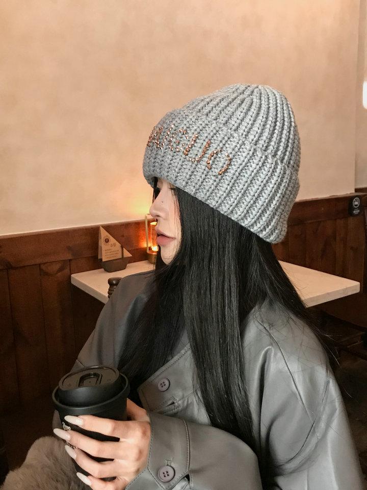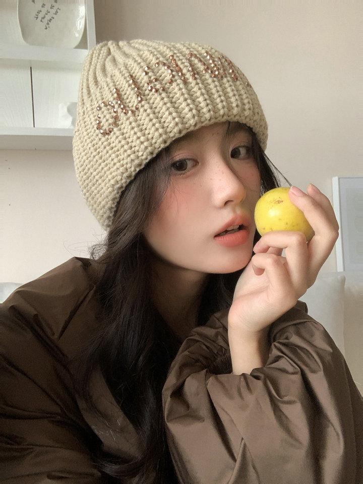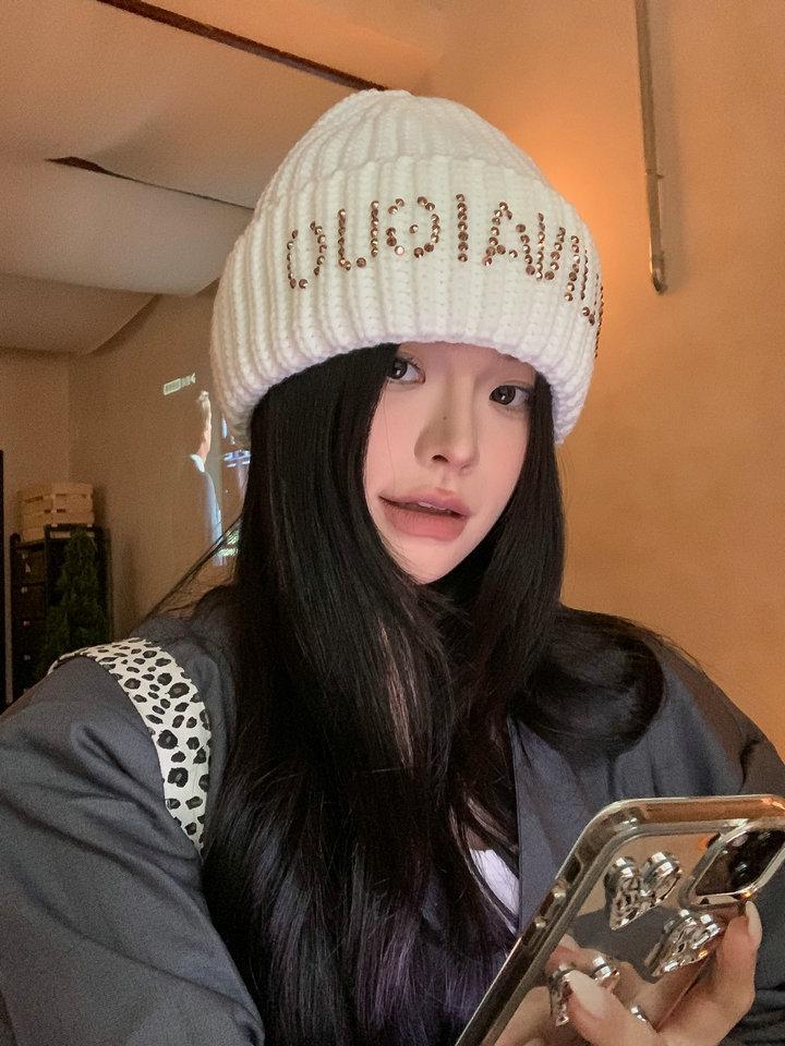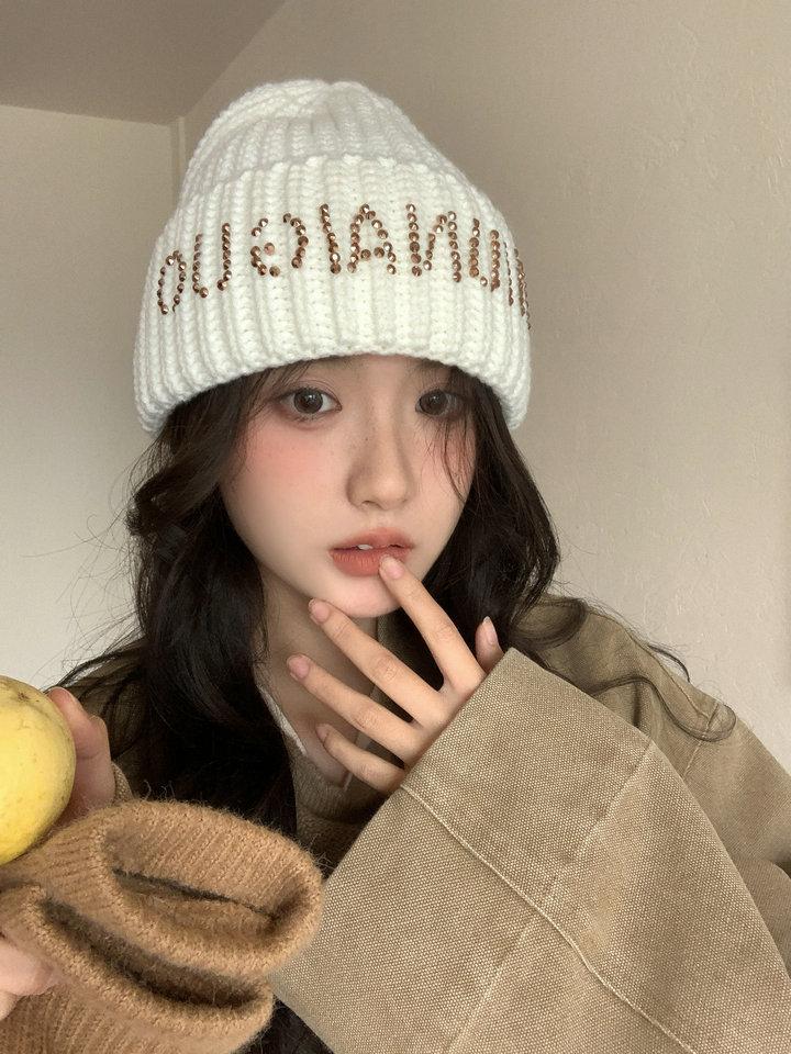 Gorro de lana con letras de diamante para mujer, cálido gorro de protección auditiva para otoño e invierno, estilo coreano, gorro de punto de moda Wai con cabeza grande, gorro frío