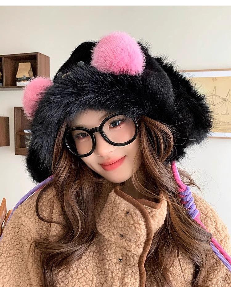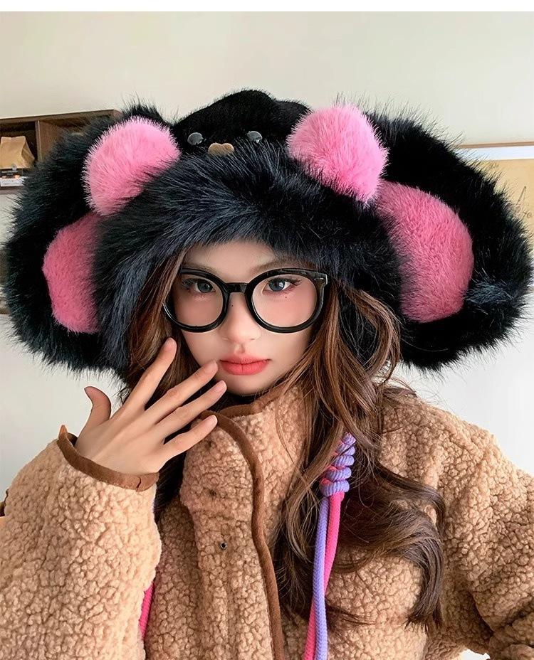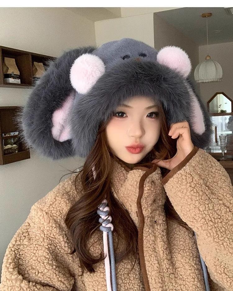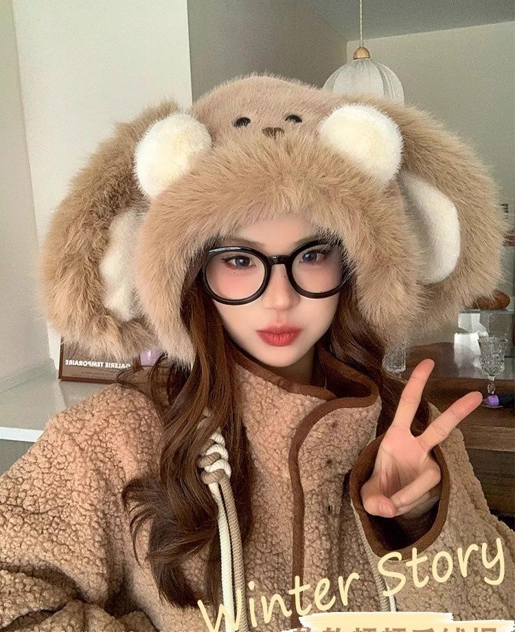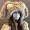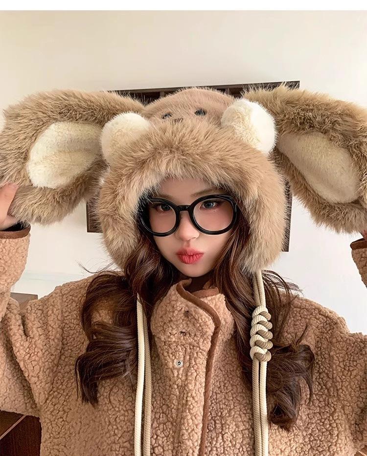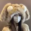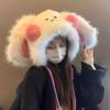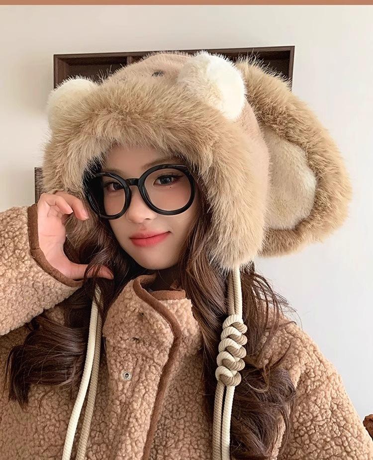 Lindo gorro Lei Feng de peluche con orejas grandes para mujer, cálido gorro de esquí con protección para las orejas para invierno, gorro pequeño con cabeza grande y cara grande.