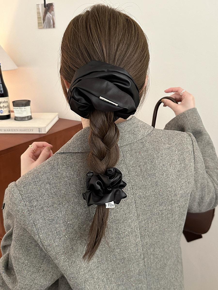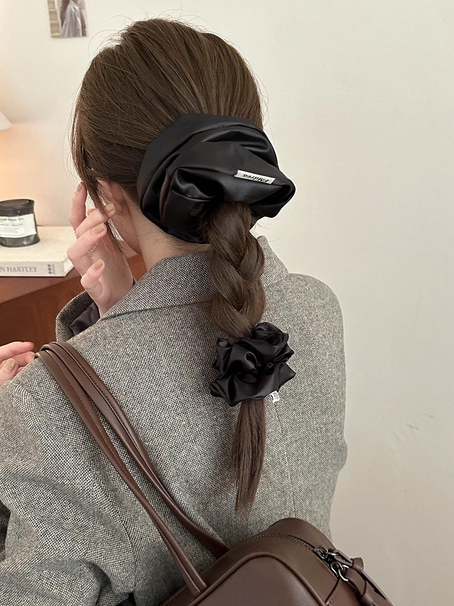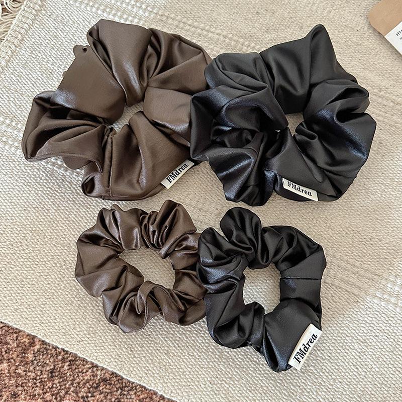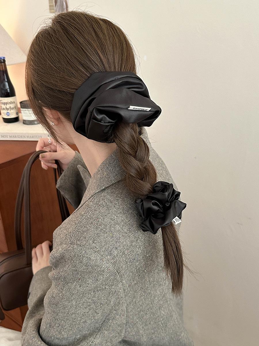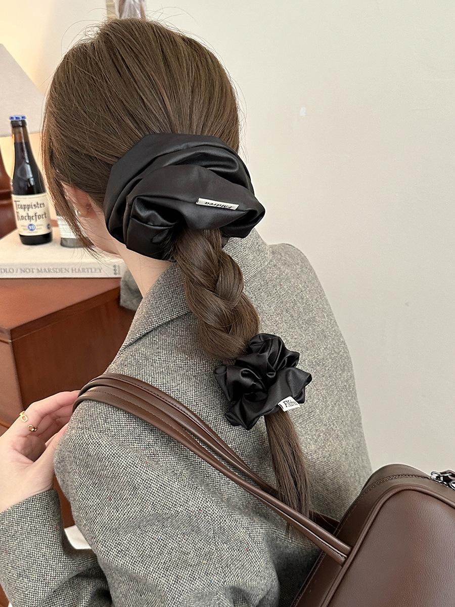 4551-1-black satin scrunchie with label large, 4551-2-brown satin hair tie with label large, 4551-3-black sati...