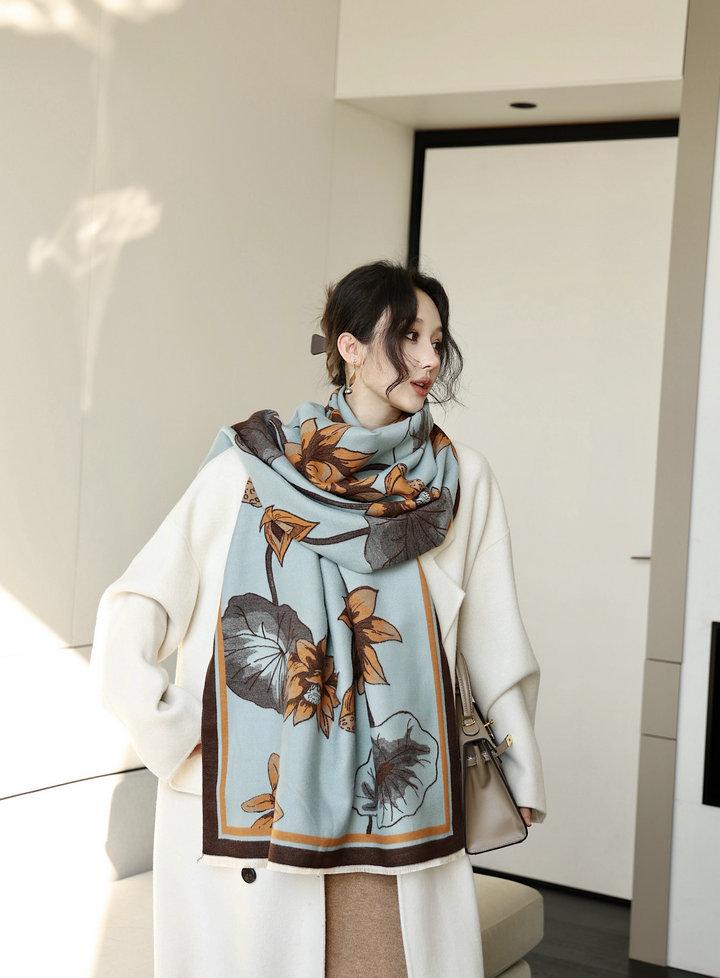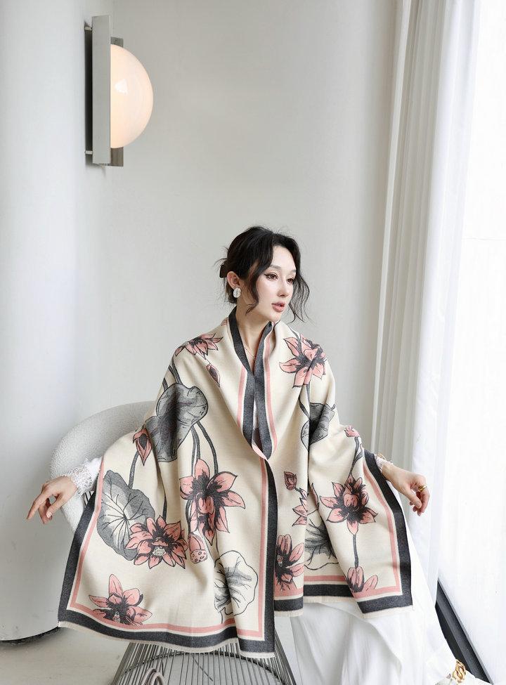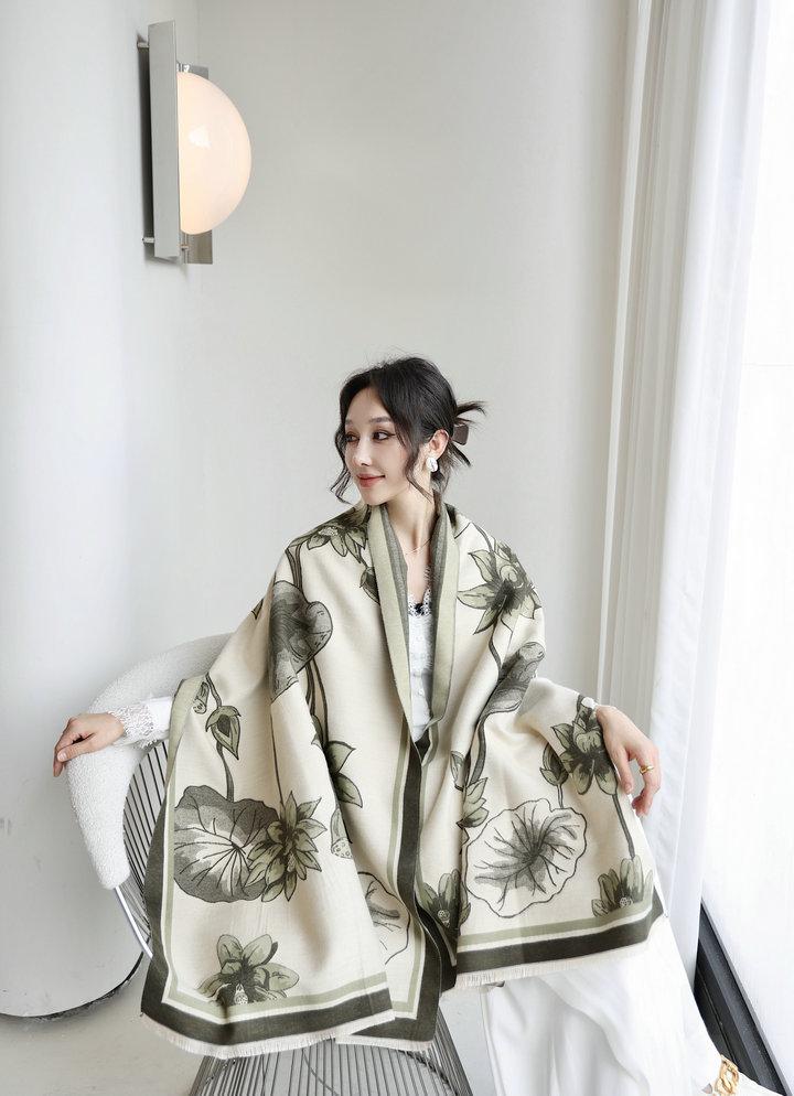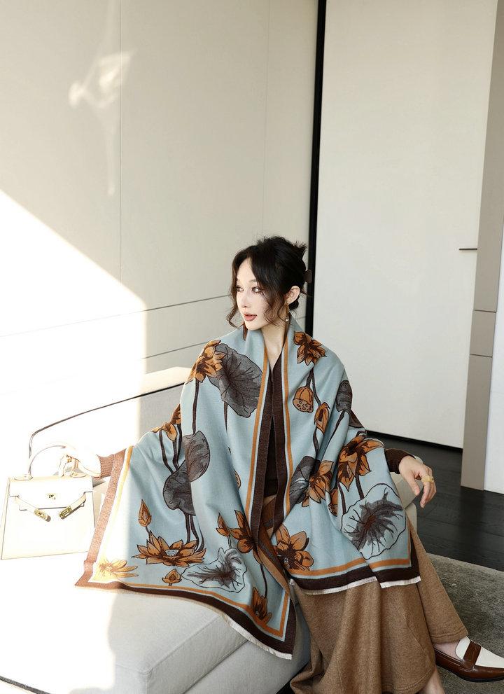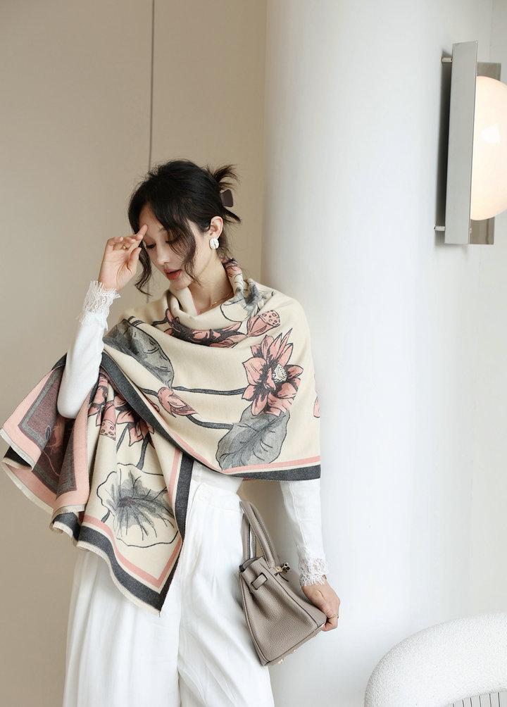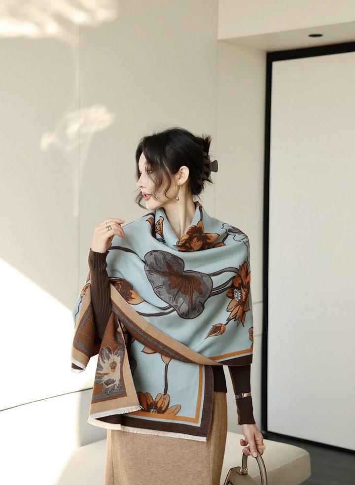 Bufanda cálida elegante de alta gama con estampado de loto para otoño e invierno, ideal para reducir el envejecimiento y el desgaste, chal retro de doble uso.