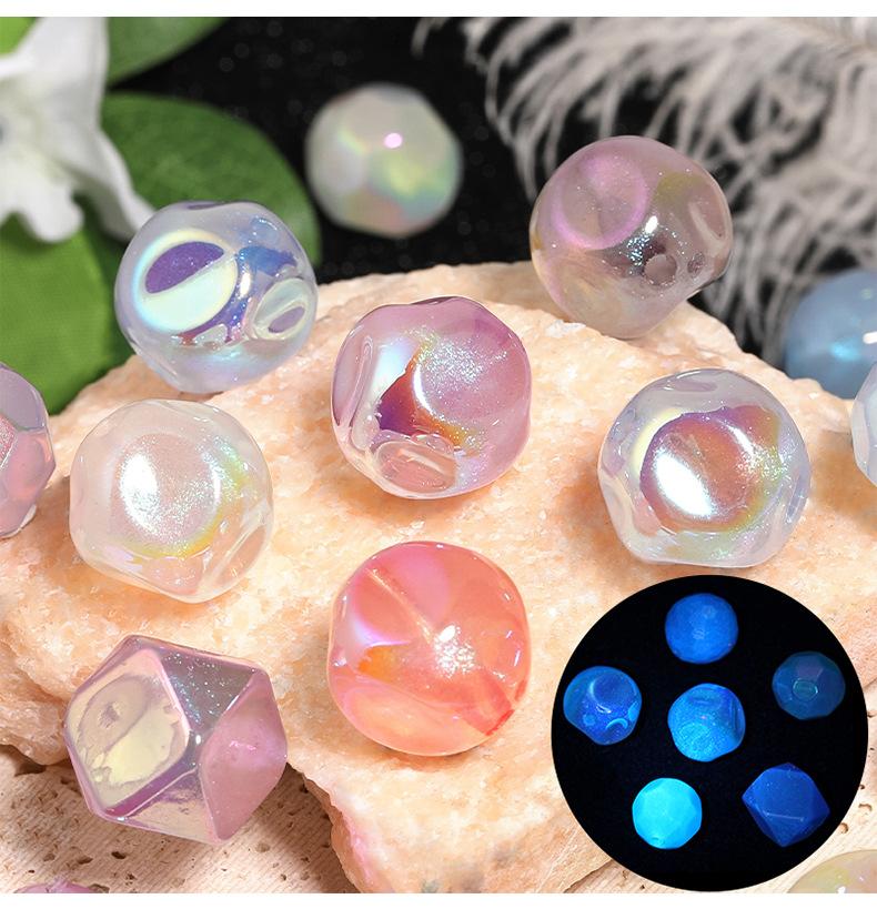18mm luminous fig beads, 16mm luminous corner beads, 16mm luminous disco beads, 14x15mm luminous faceted square beads