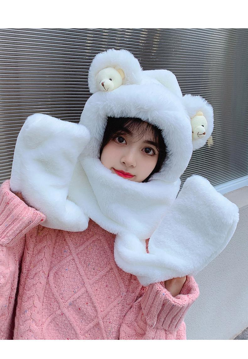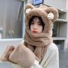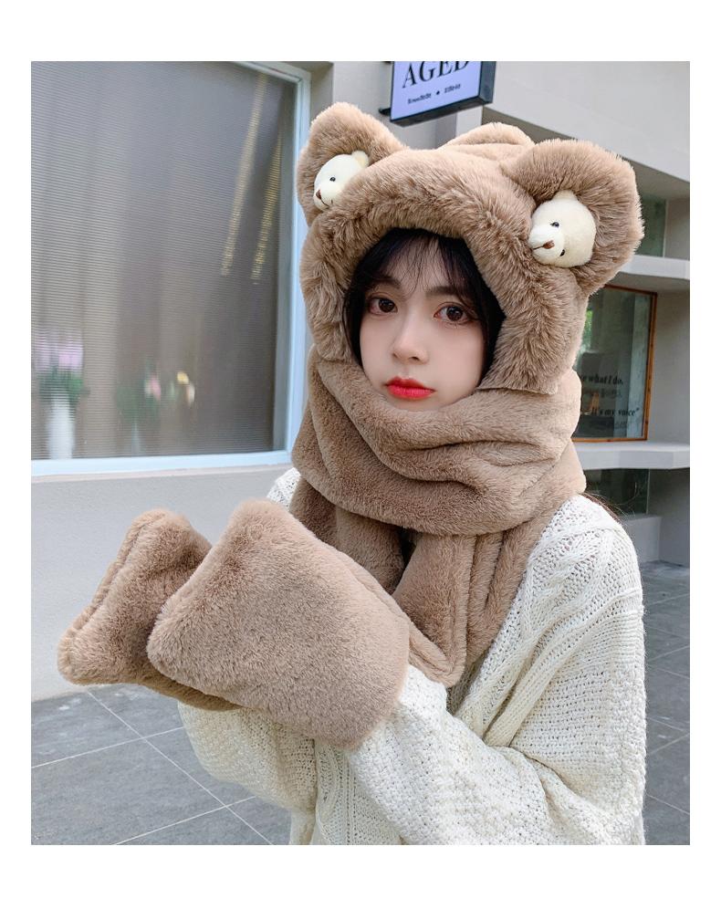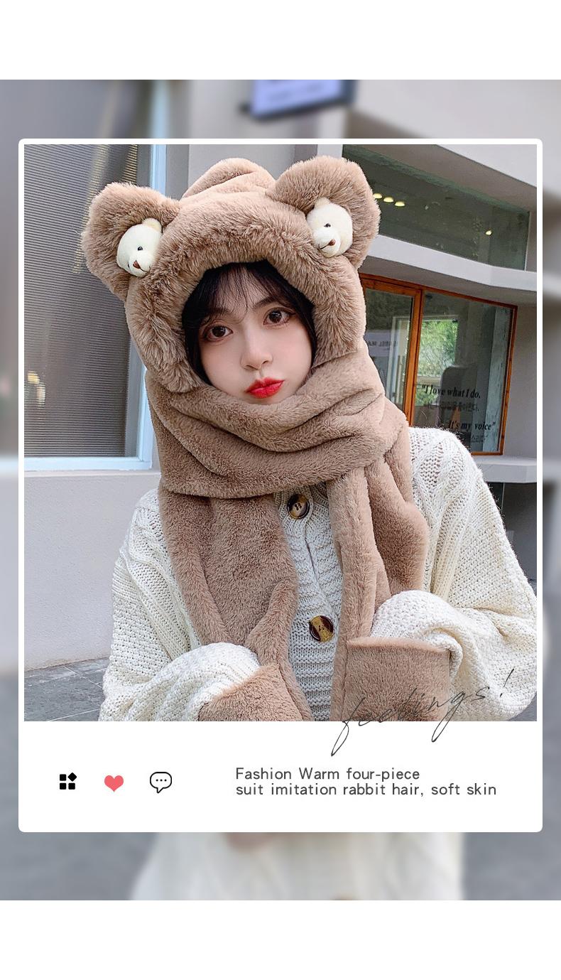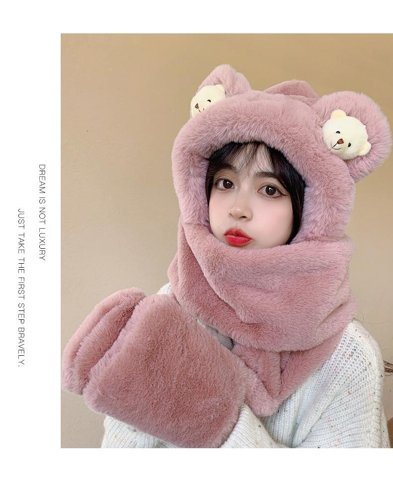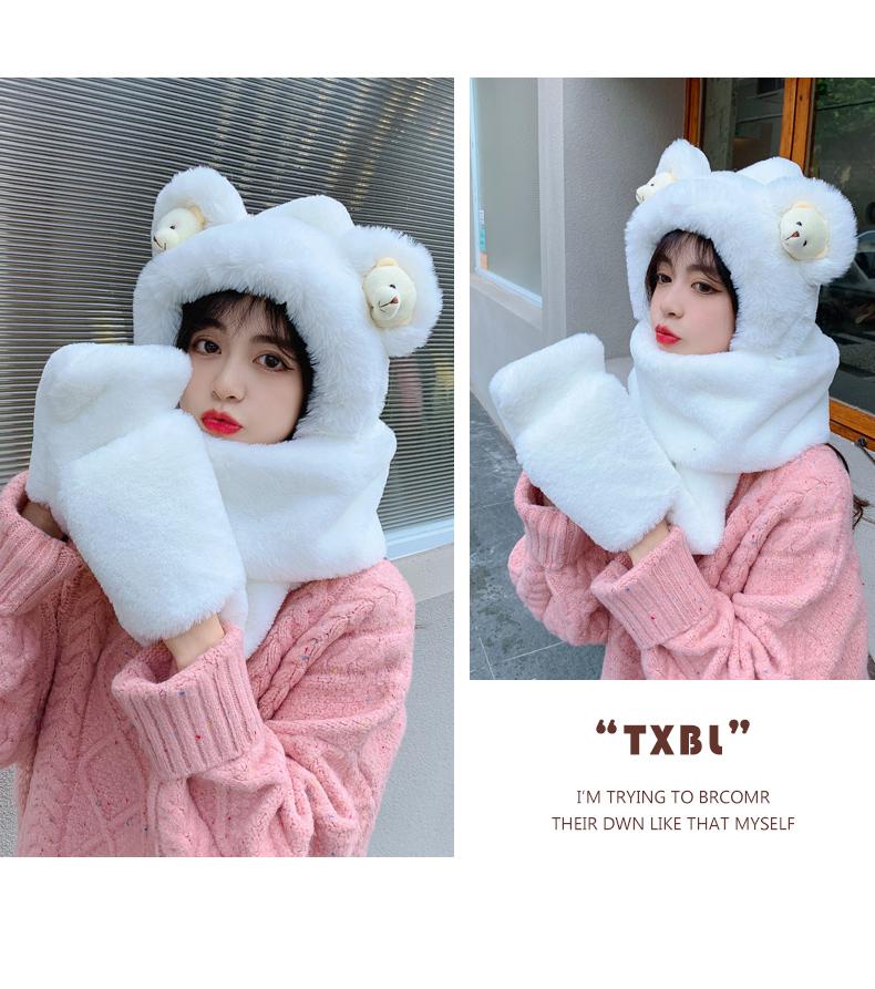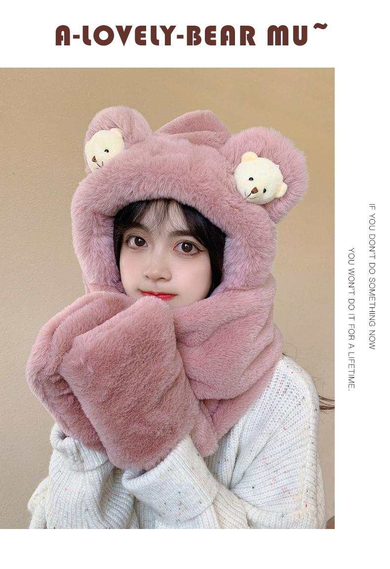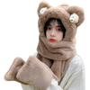 Gorro Cálido Grueso de Invierno, Bufanda y Guantes Todo en Uno Juego de Tres Piezas Lindo Oso Estudiante Ciclismo Protección para las Orejas Gorro de Felpa