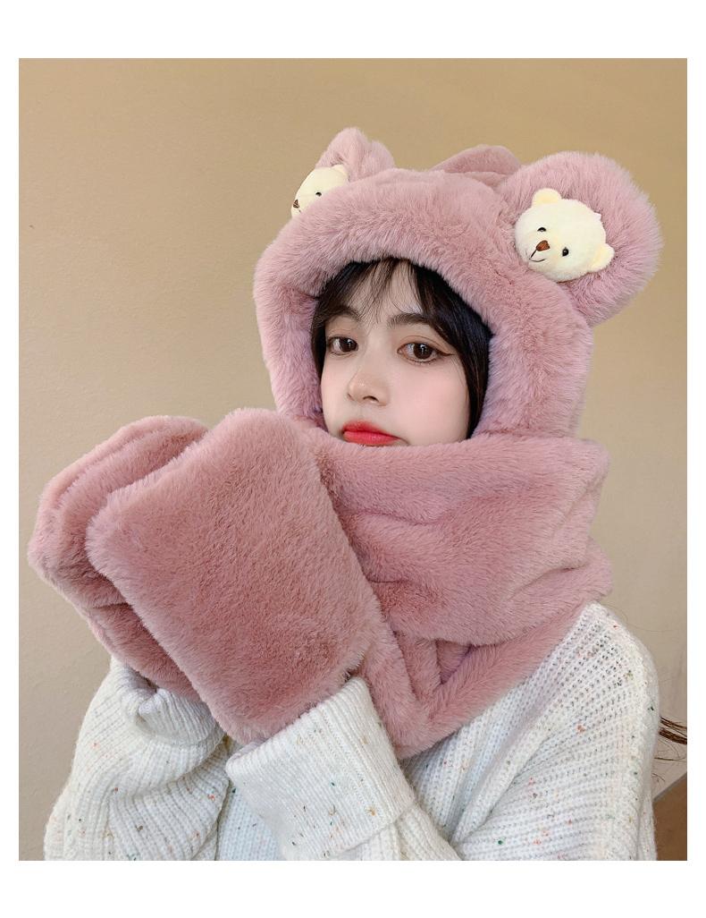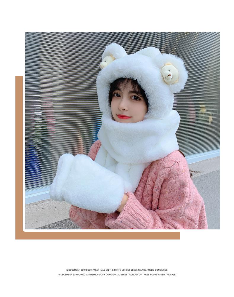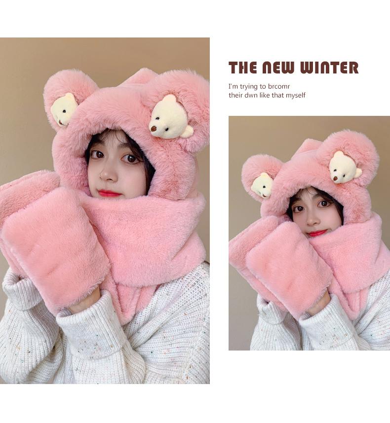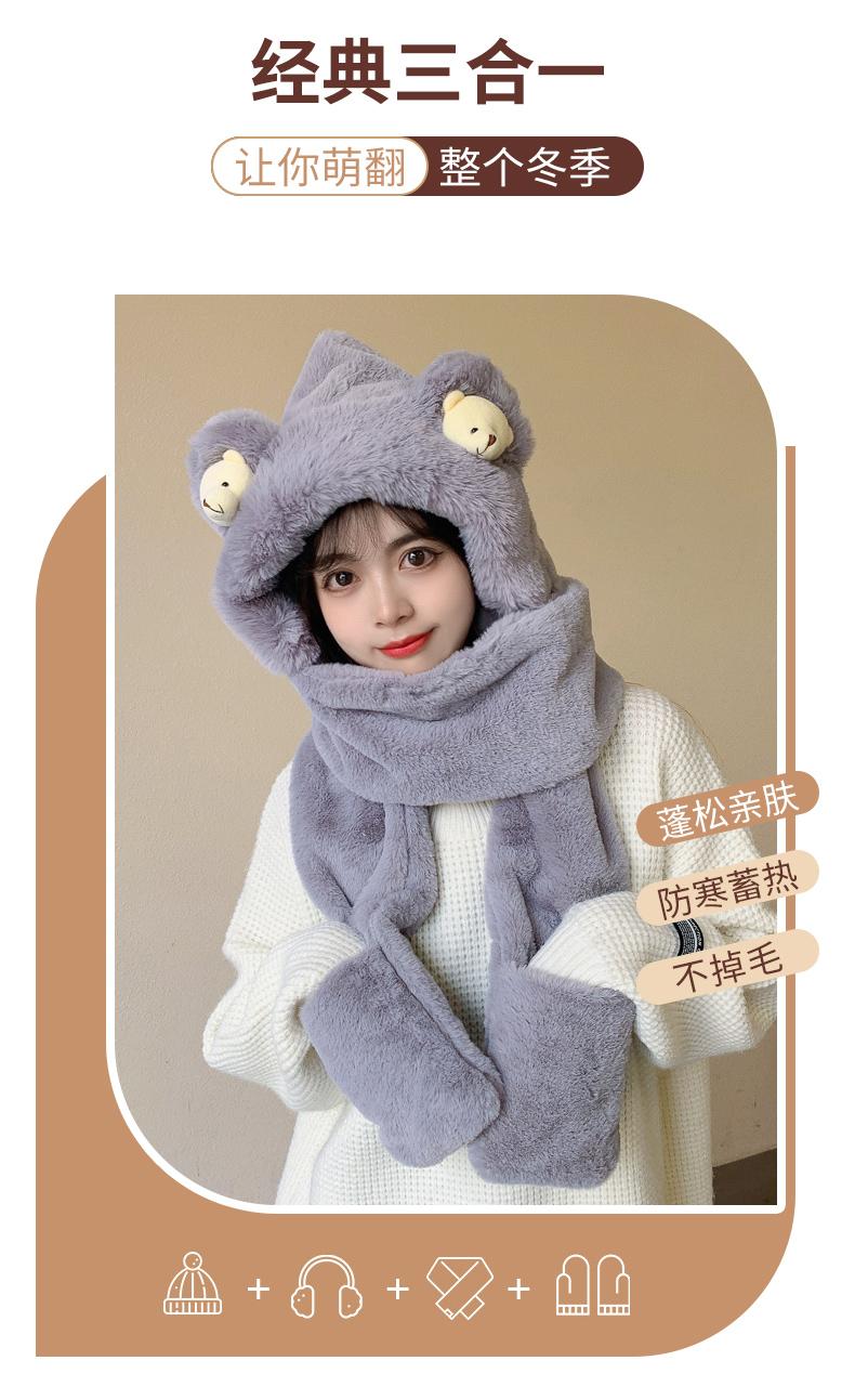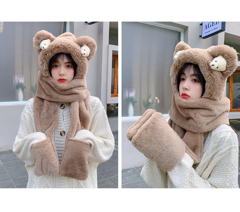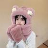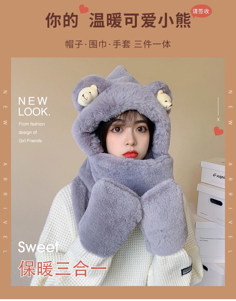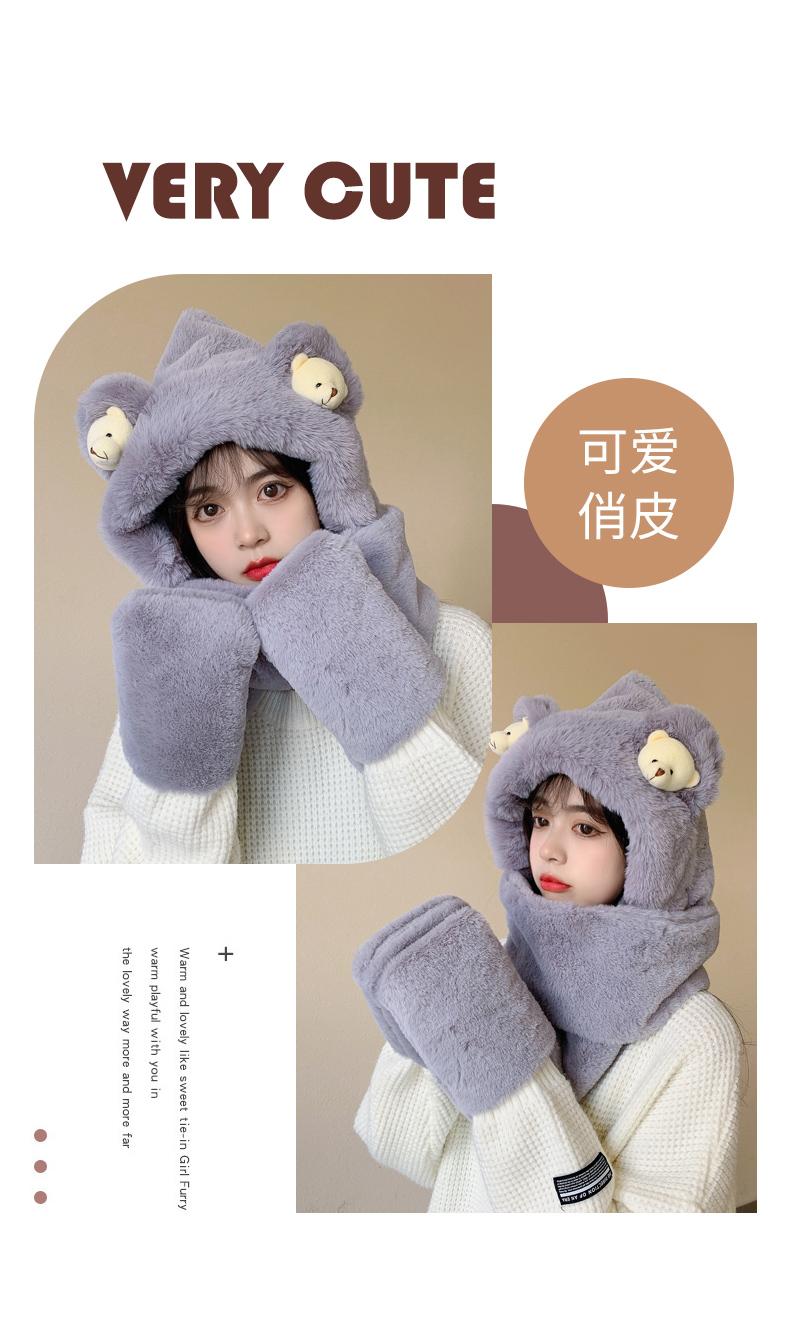 Gorro Cálido Grueso de Invierno, Bufanda y Guantes Todo en Uno Juego de Tres Piezas Lindo Oso Estudiante Ciclismo Protección para las Orejas Gorro de Felpa