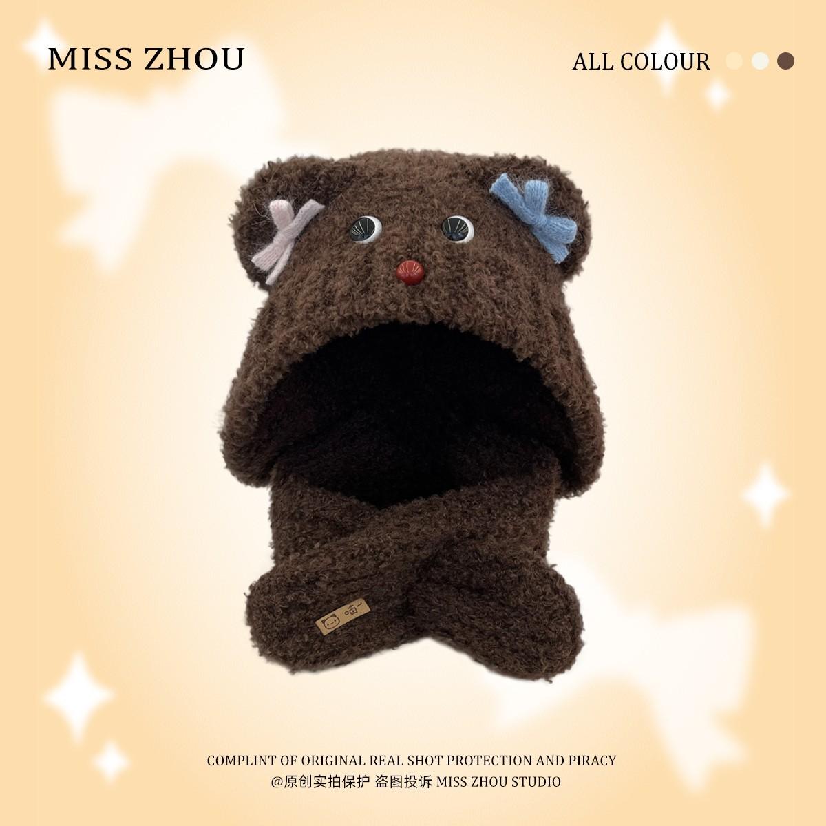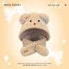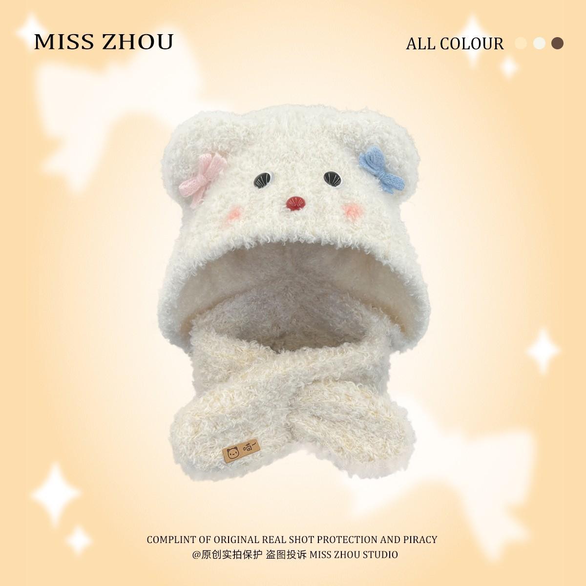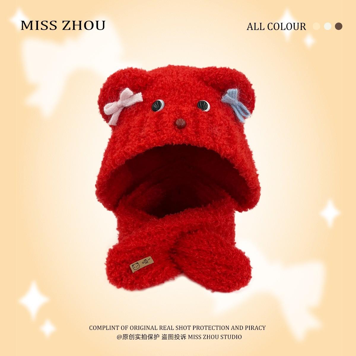 Lindo Gorro de Punto de Oso Sonrojado de Dibujos Animados para Mujer Invierno Felpa Protección para las Orejas Calentador de Cabeza Bufanda Conjunto de Dos Piezas de Una Pieza
