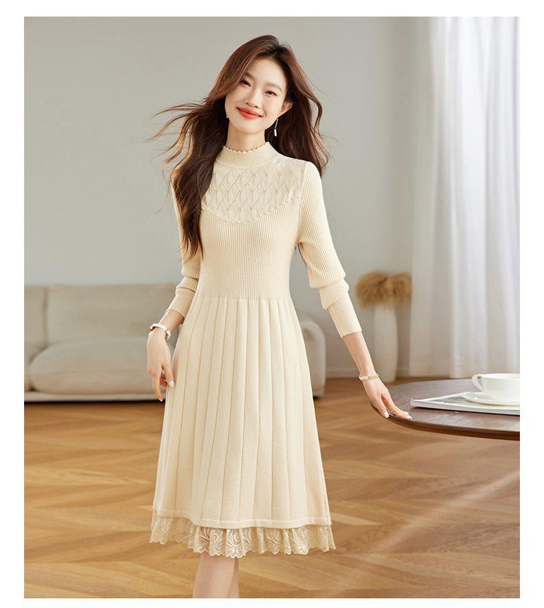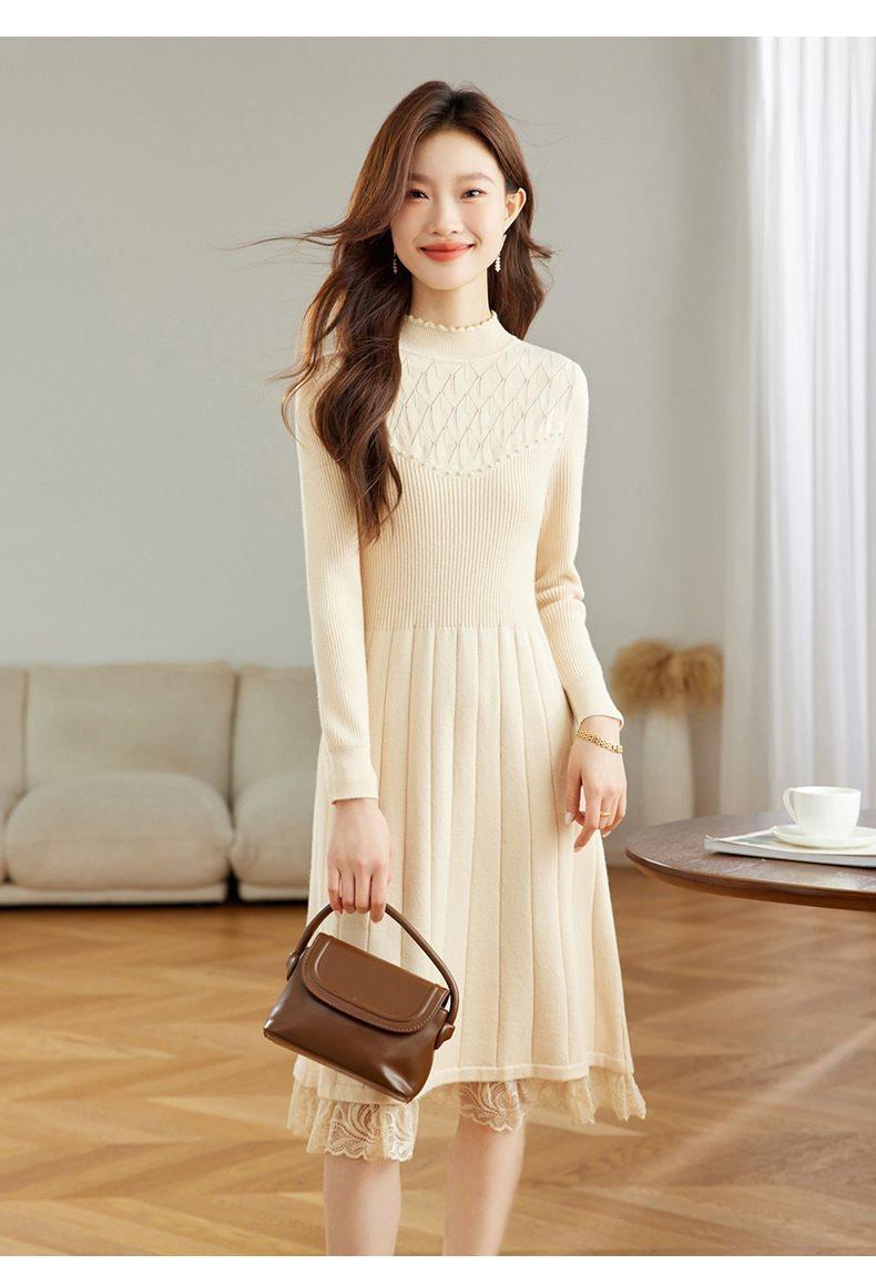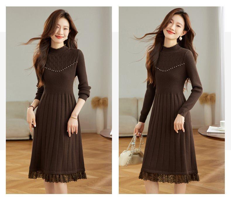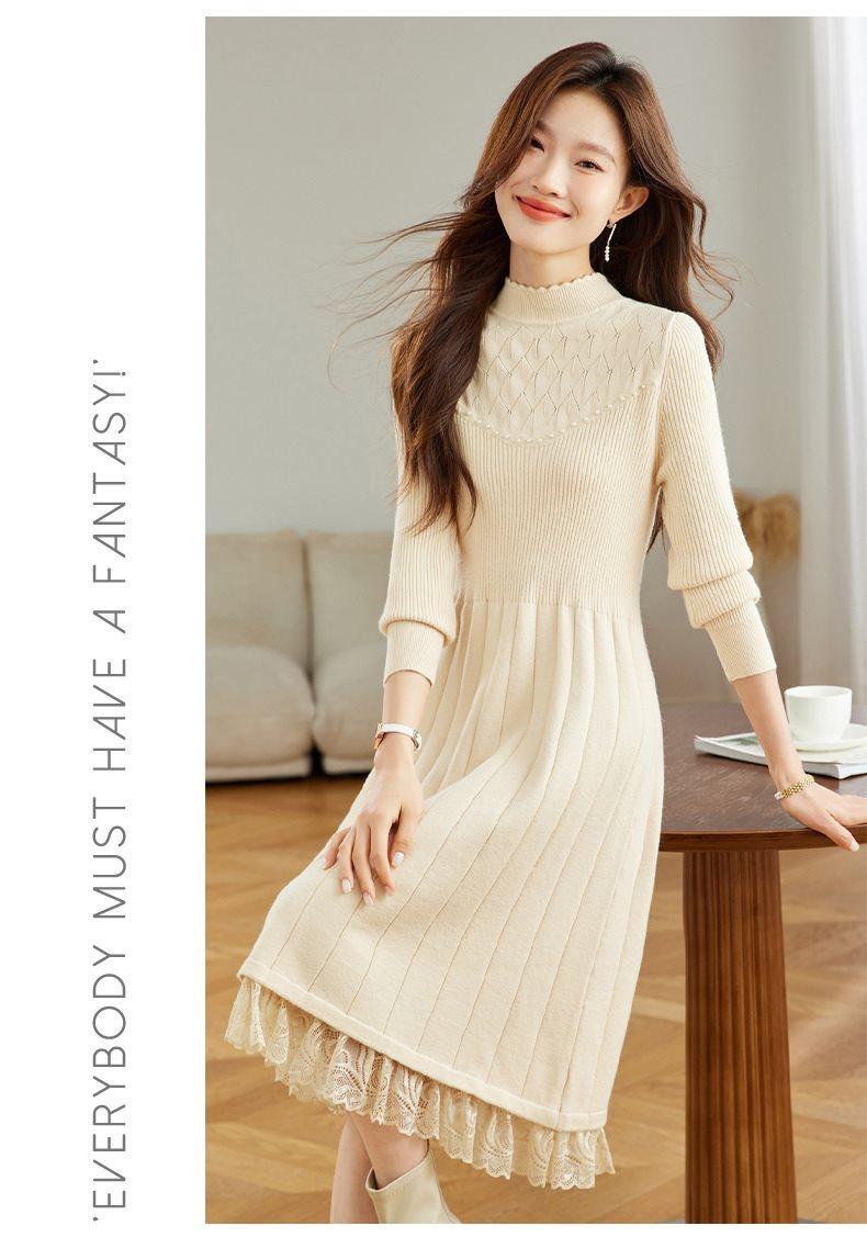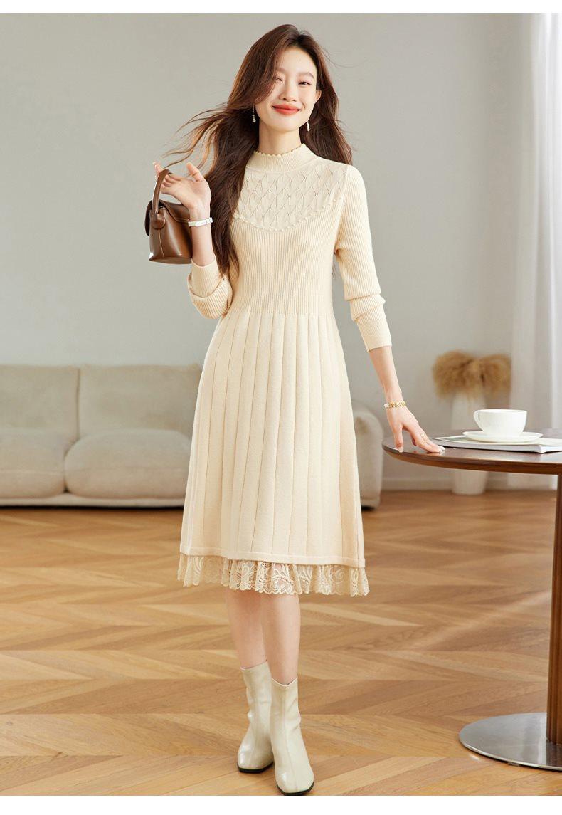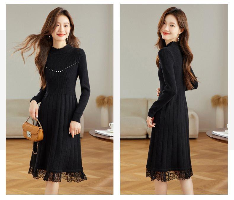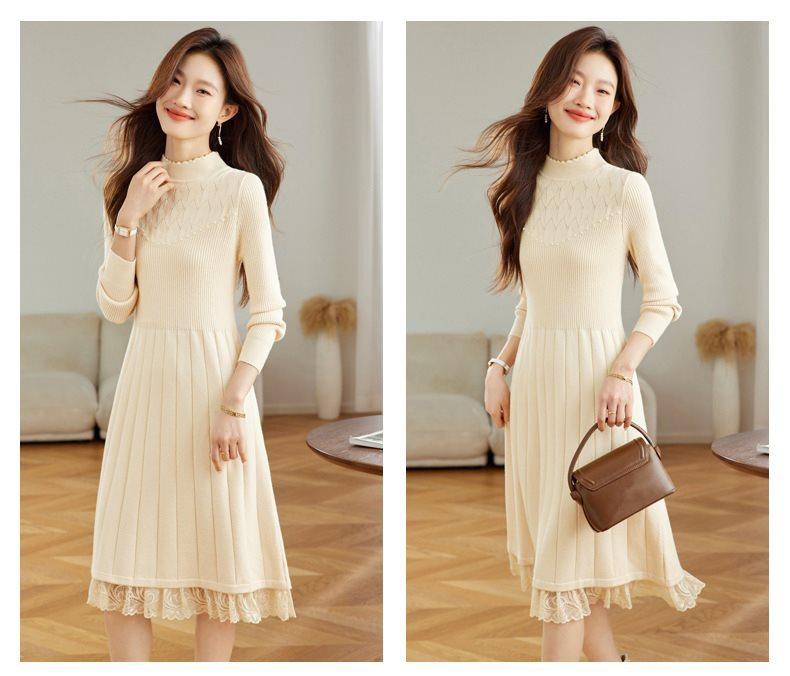 Vestido de punto elegante de otoño e invierno, nuevo, de color liso, cintura alta, manga larga, con costuras de encaje, corte A, base tipo suéter.