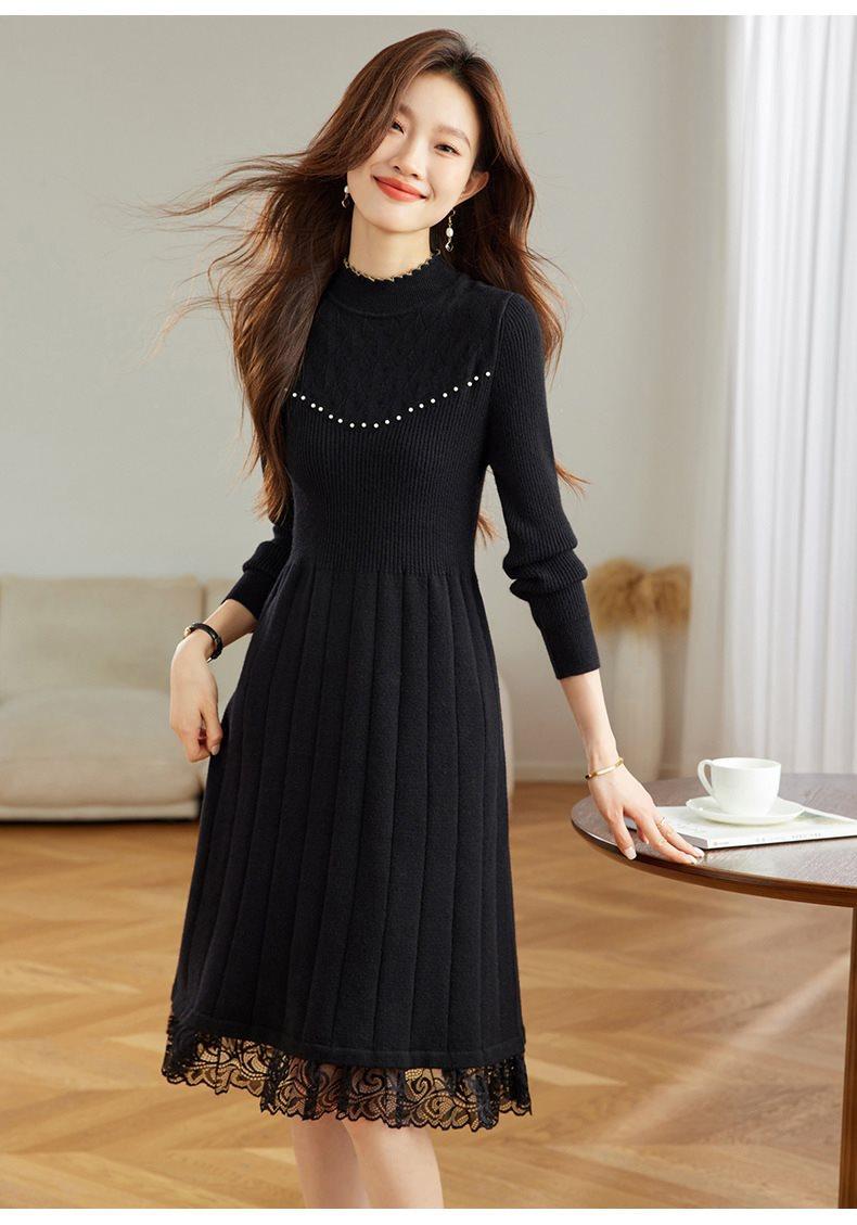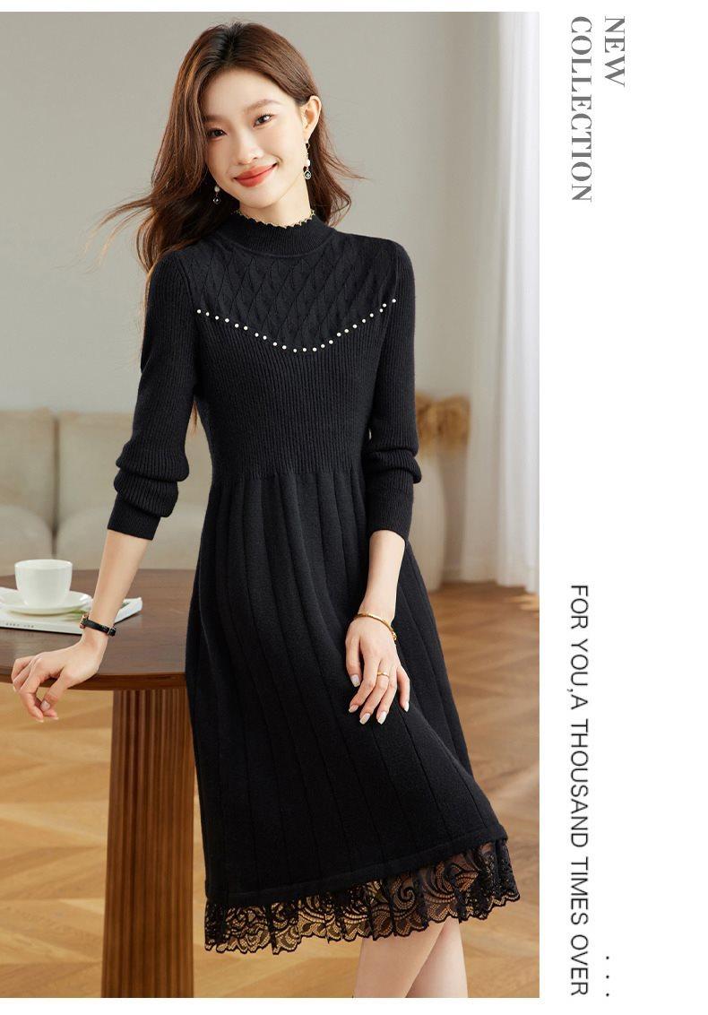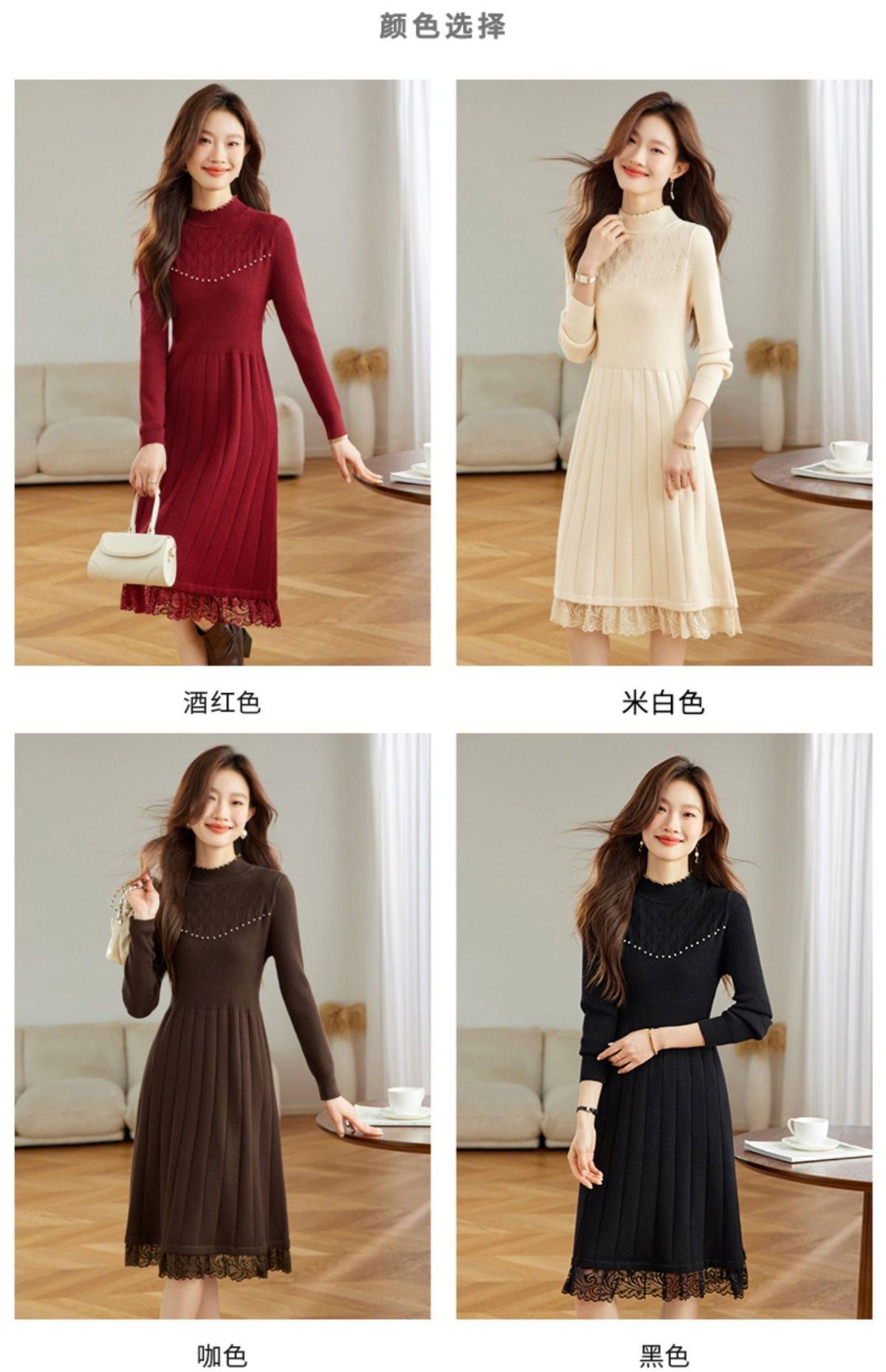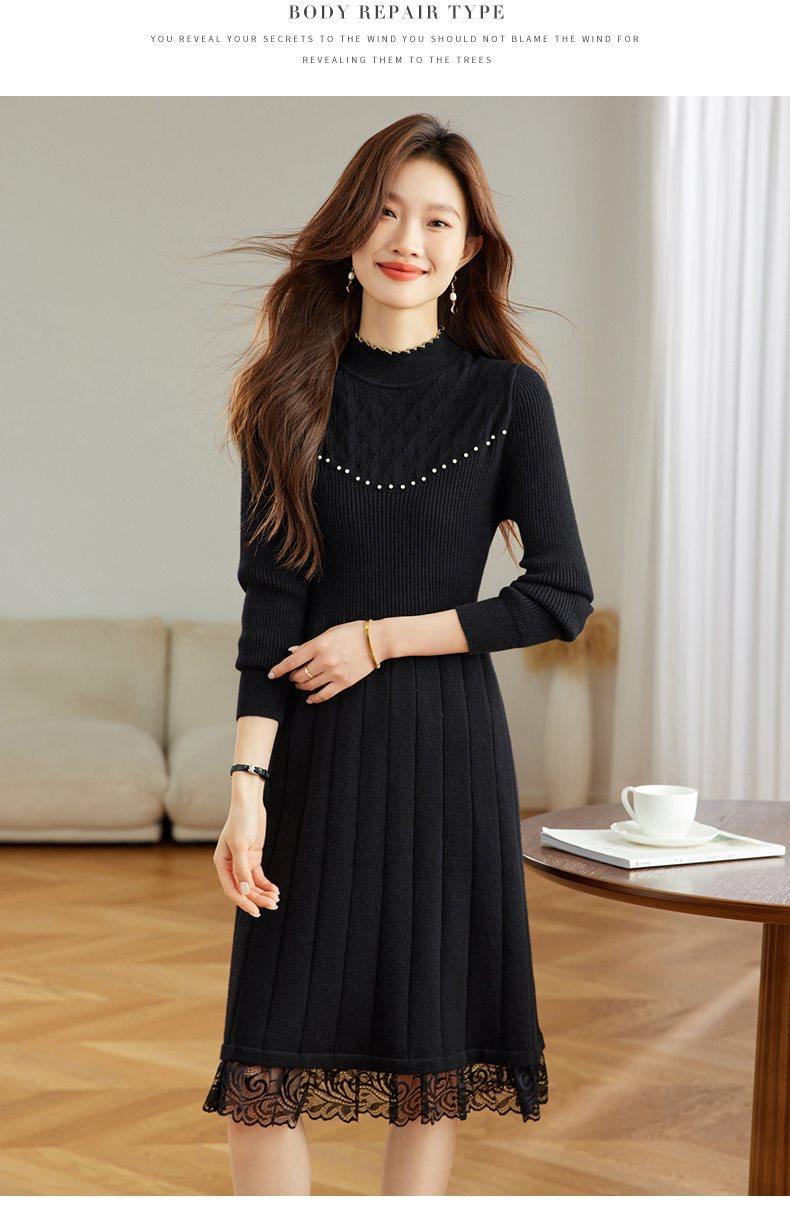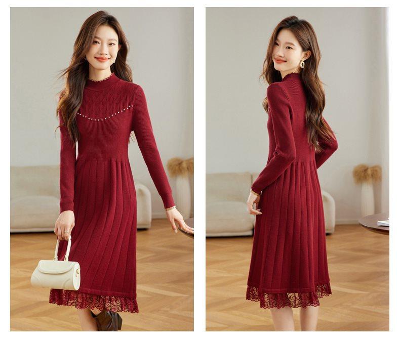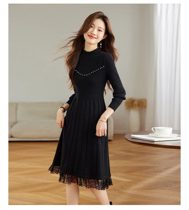 Vestido de punto elegante de otoño e invierno, nuevo, de color liso, cintura alta, manga larga, con costuras de encaje, corte A, base tipo suéter.