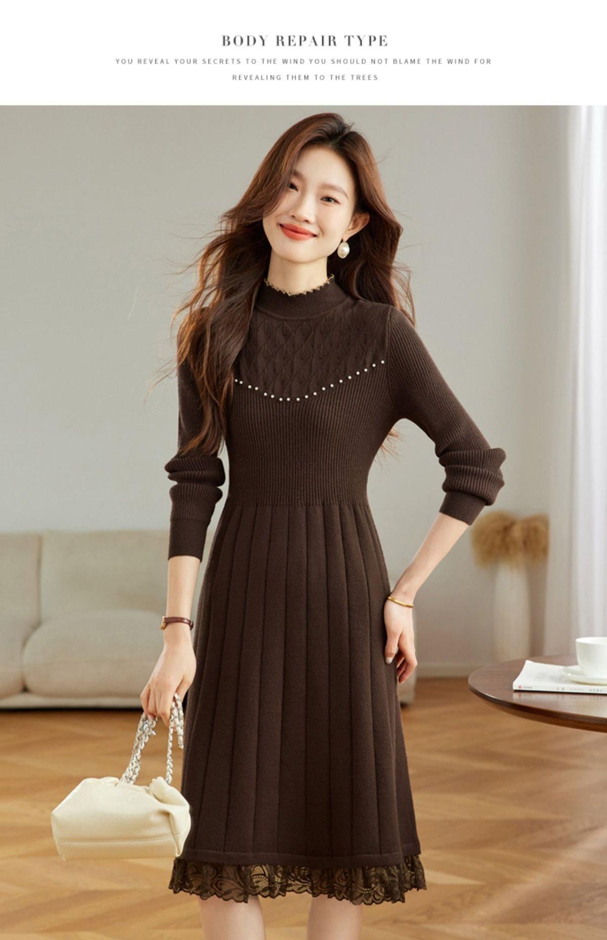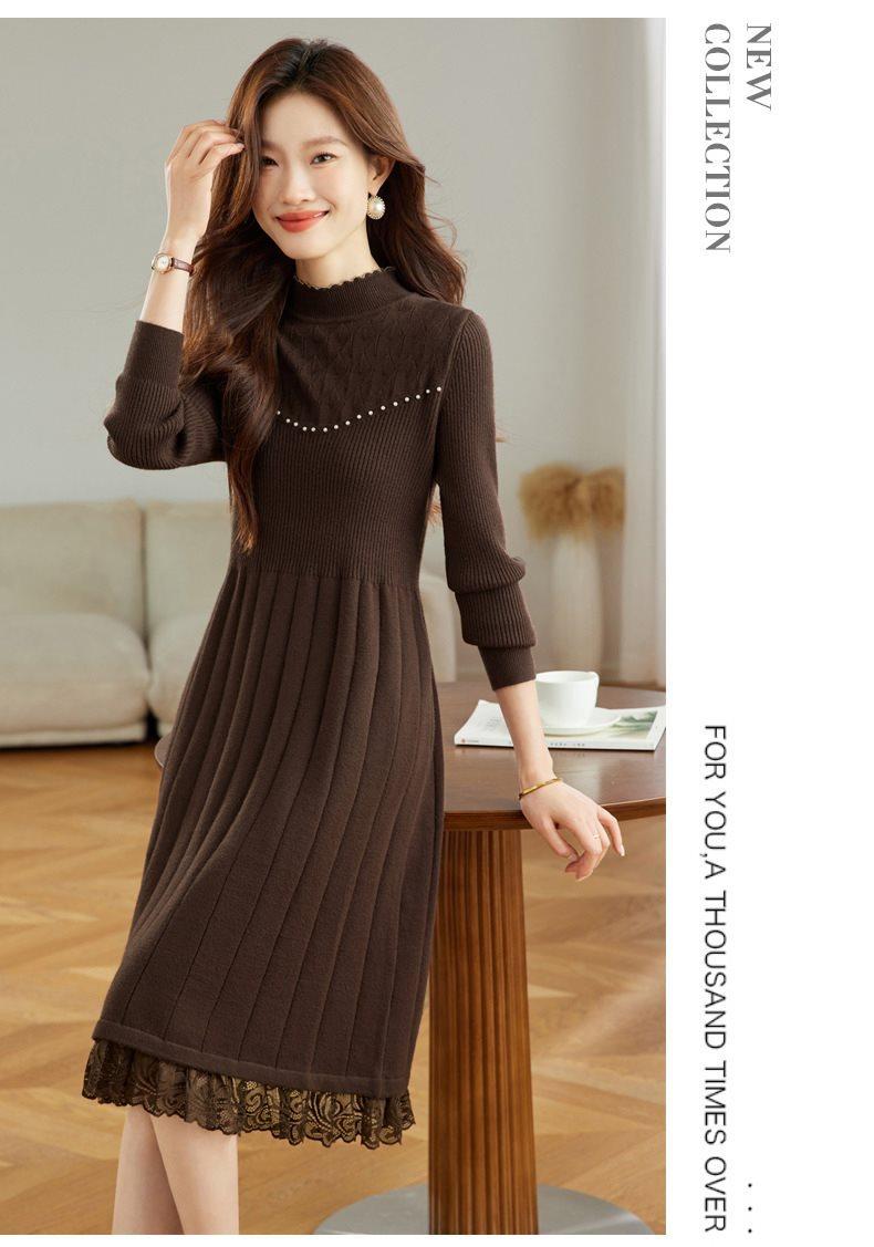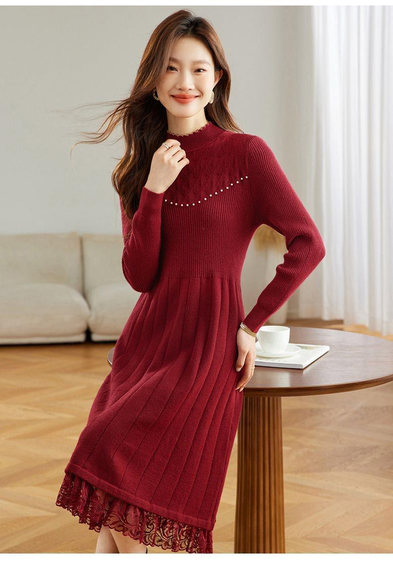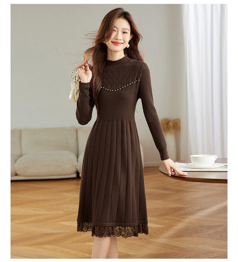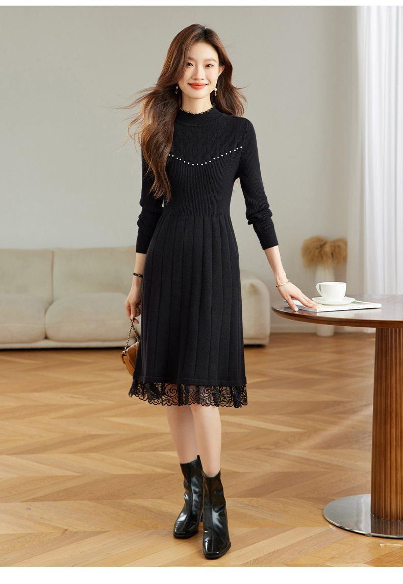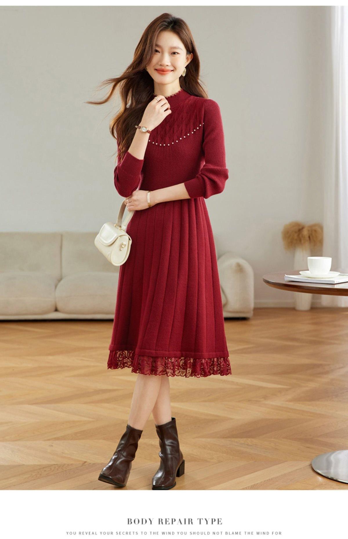 Vestido de punto elegante de otoño e invierno, nuevo, de color liso, cintura alta, manga larga, con costuras de encaje, corte A, base tipo suéter.