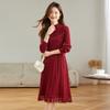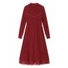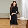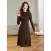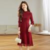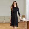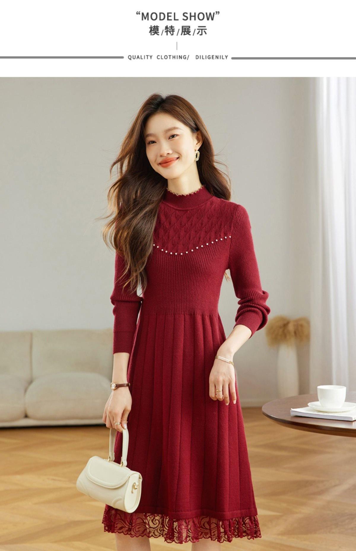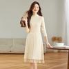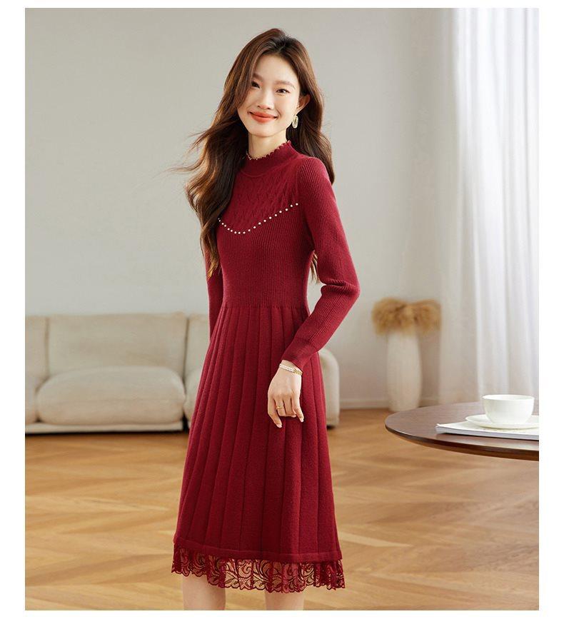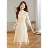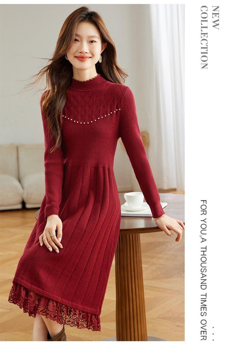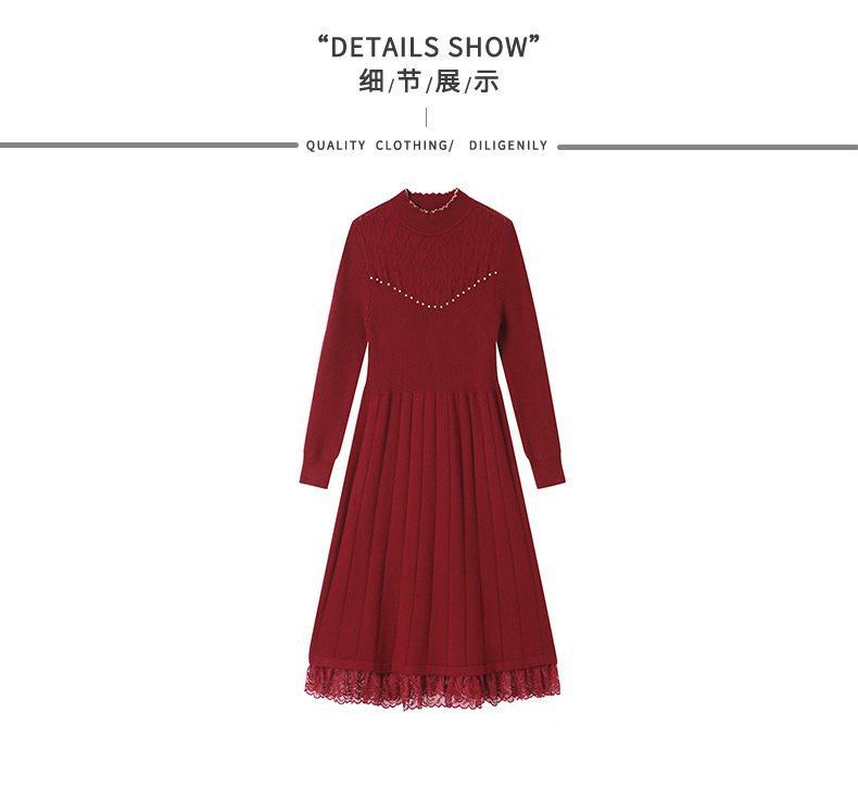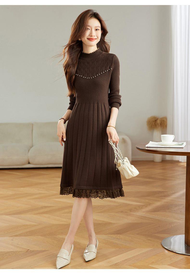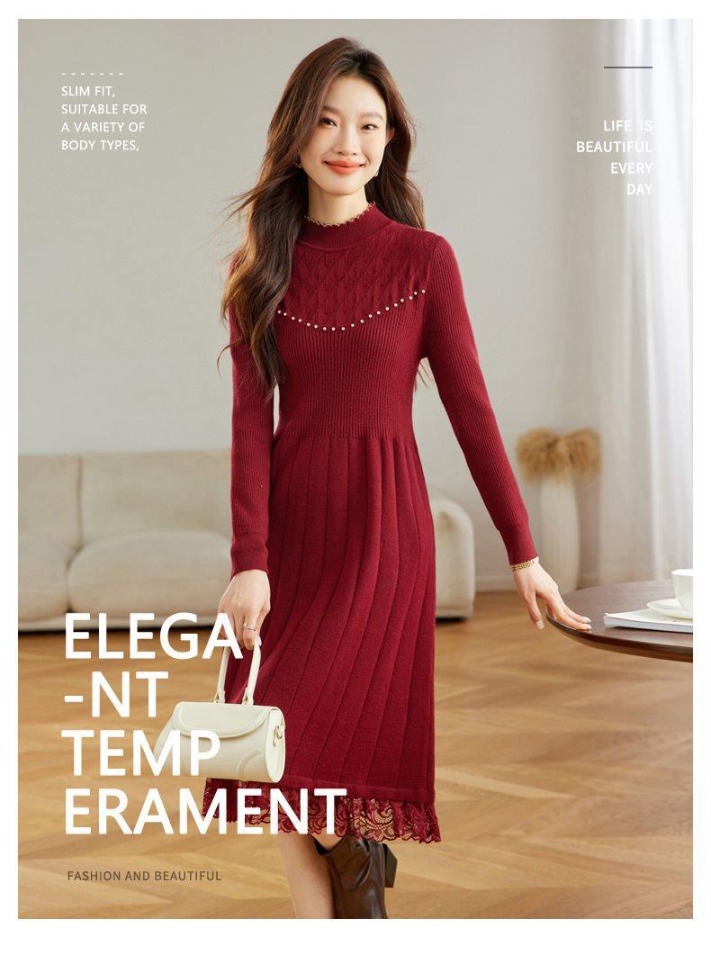 Vestido de punto elegante de otoño e invierno, nuevo, de color liso, cintura alta, manga larga, con costuras de encaje, corte A, base tipo suéter.