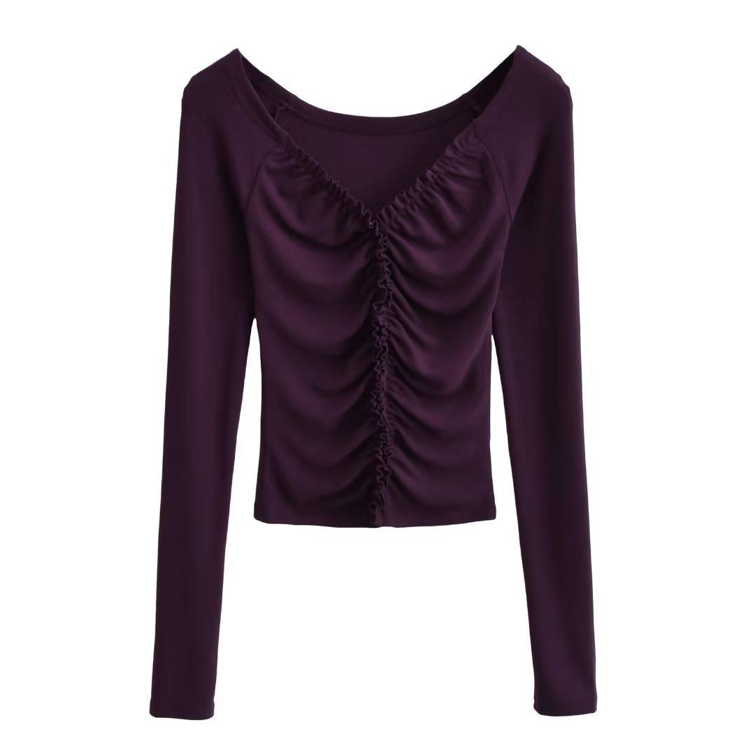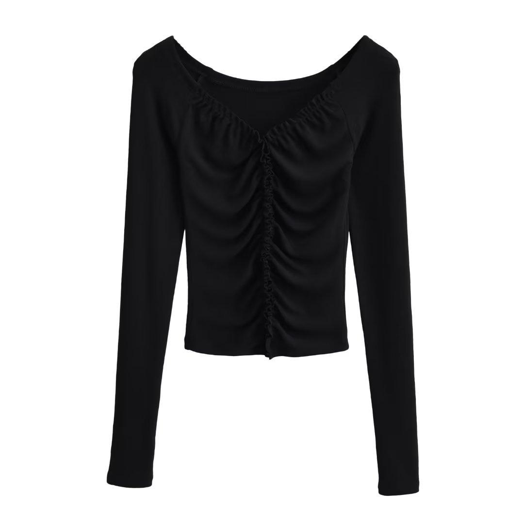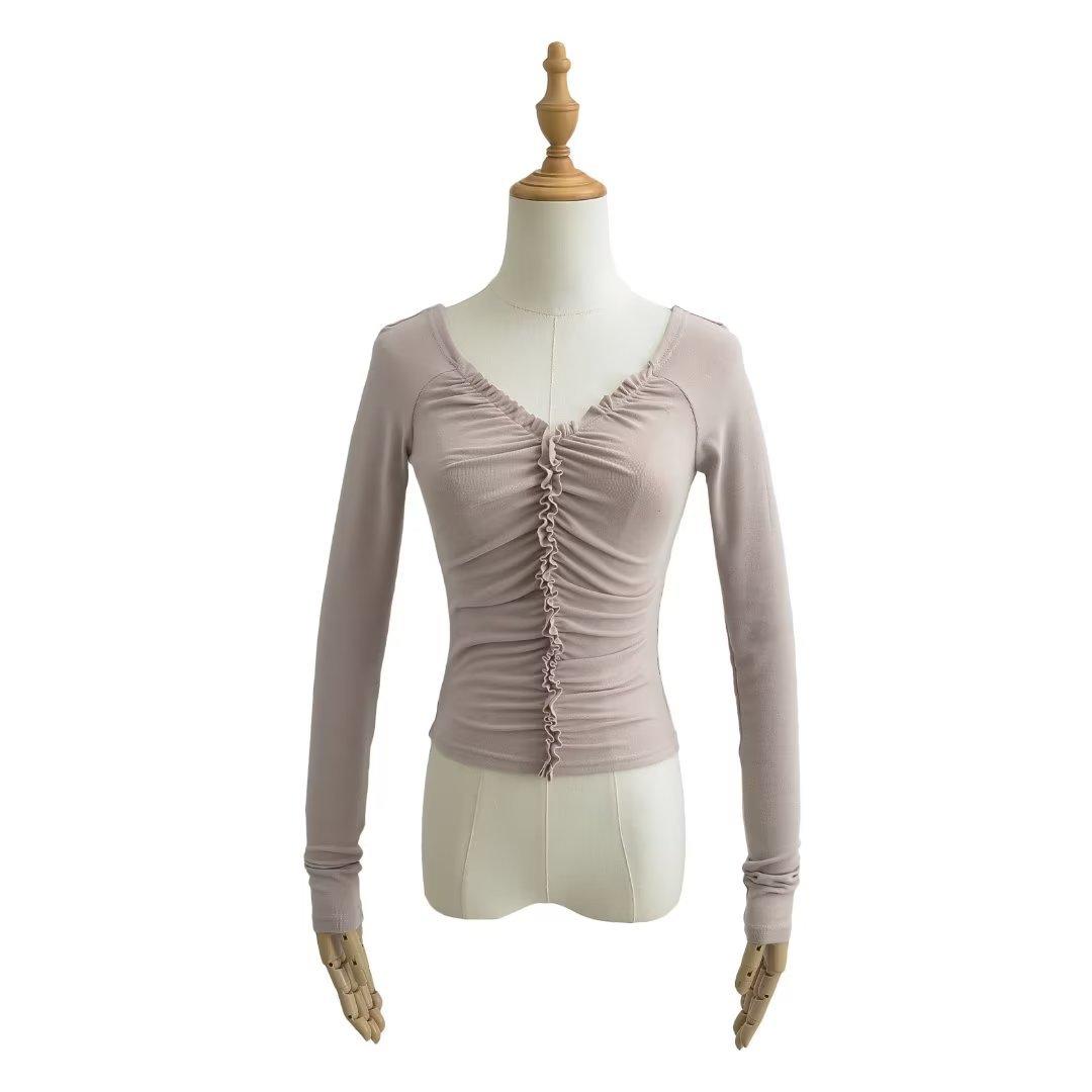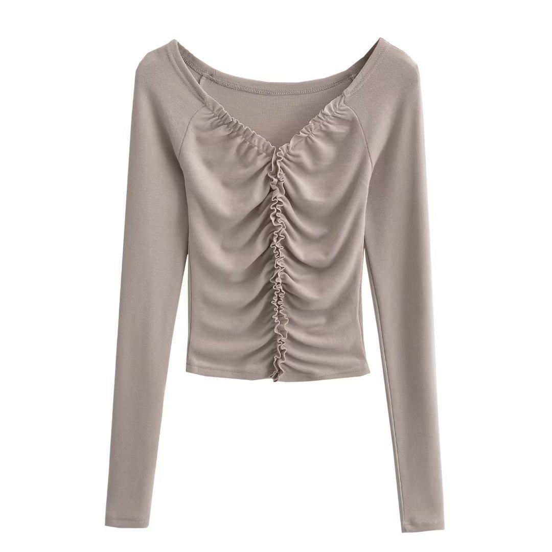 Camiseta de manga larga con escote en V profundo, elegante y corta, estilo chica sexy de otoño e invierno de 2023, con pliegues en el pecho y cintura alta