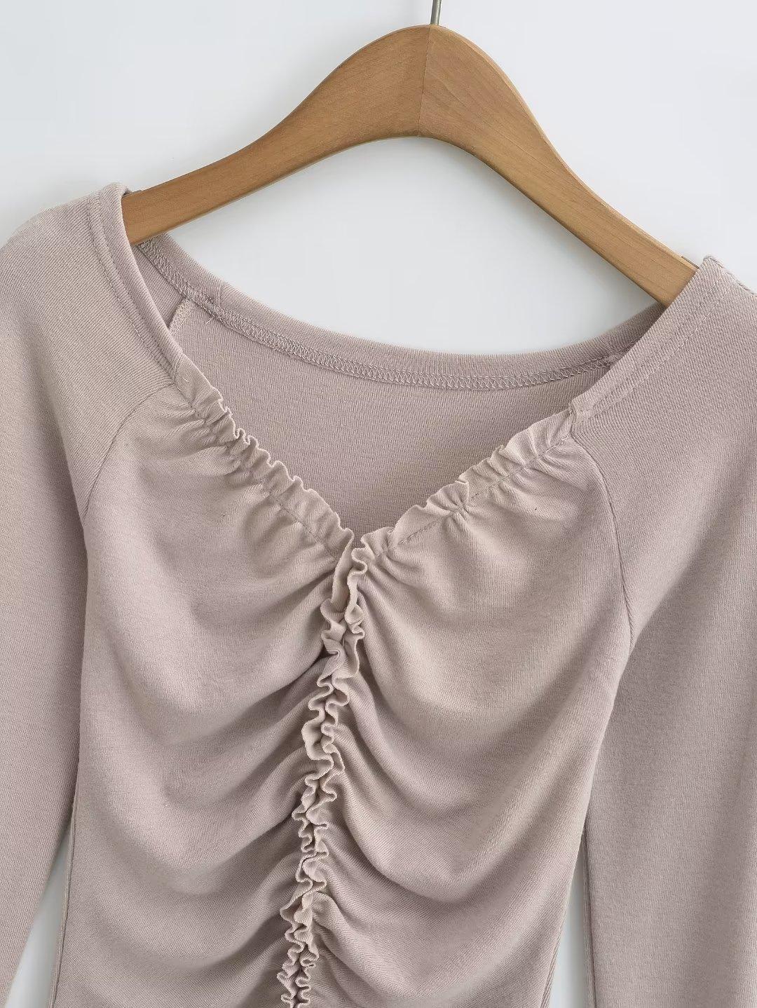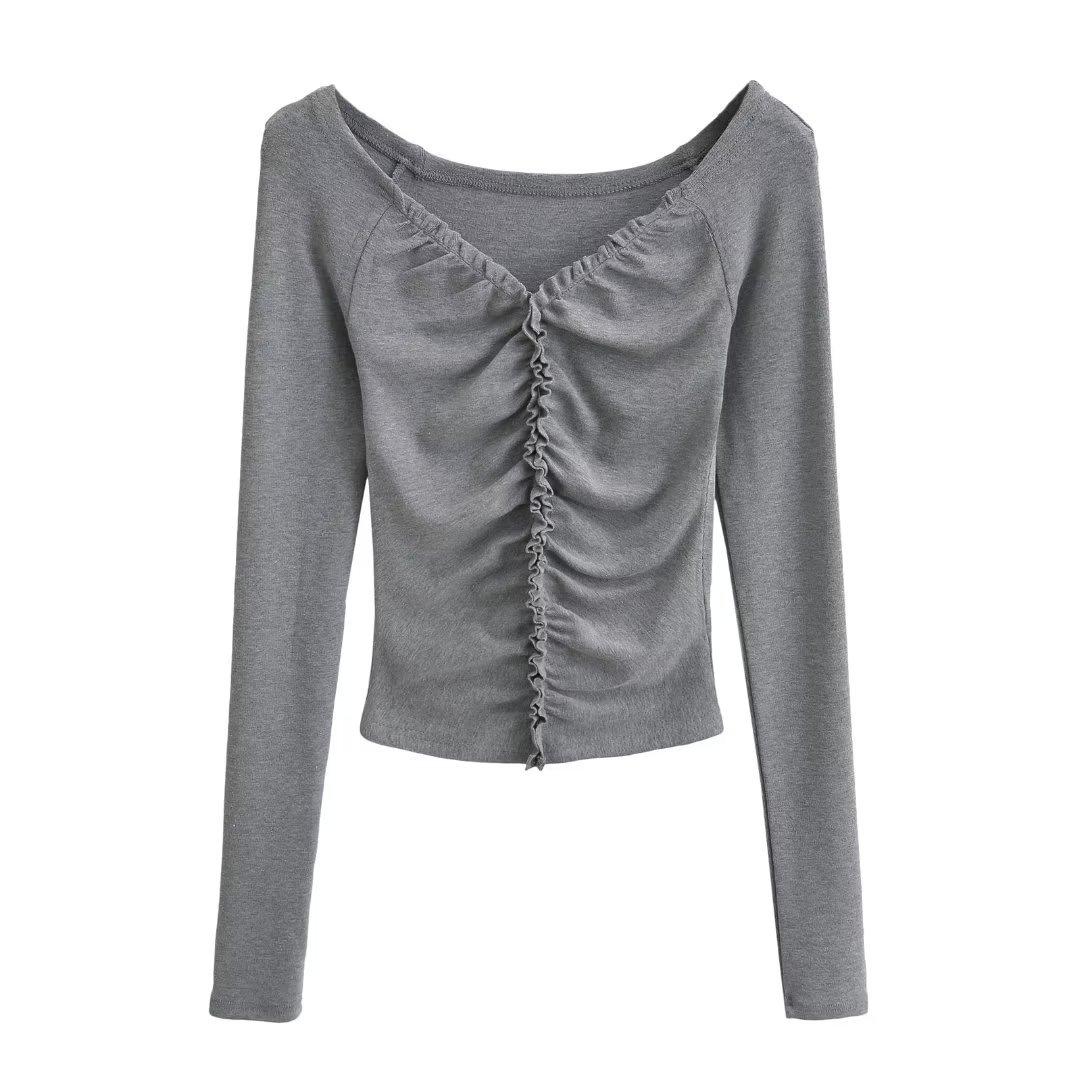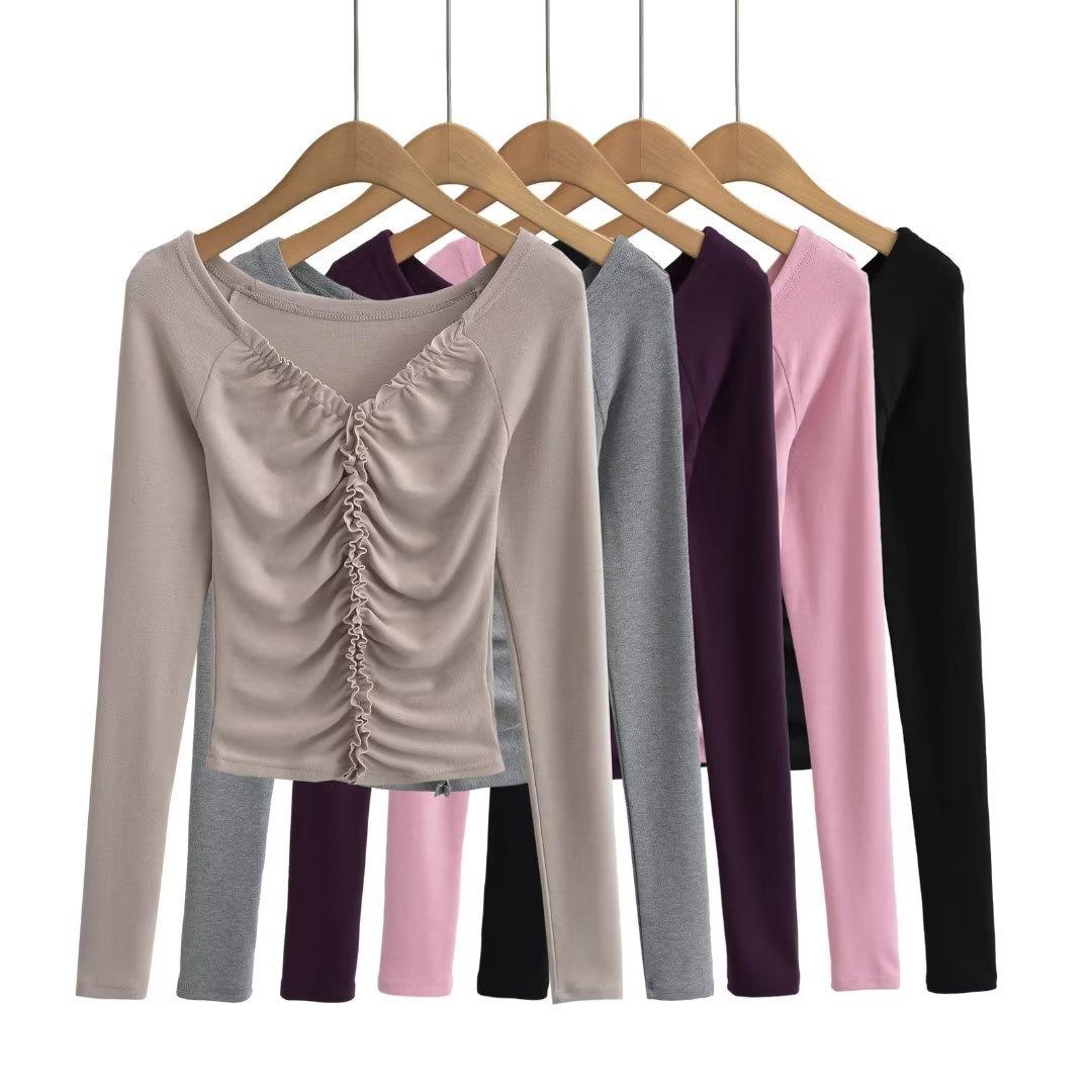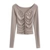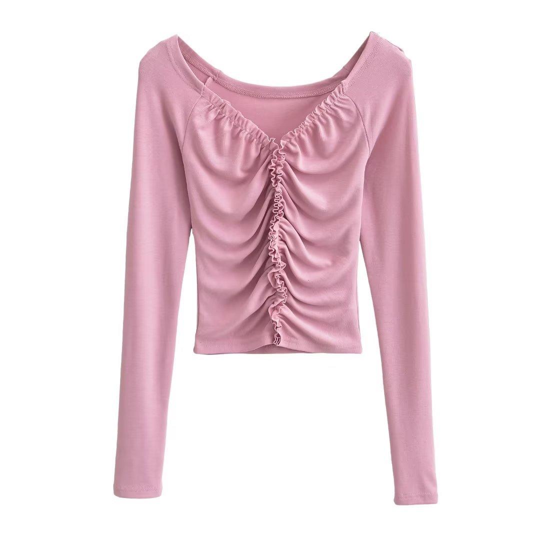 Camiseta de manga larga con escote en V profundo, elegante y corta, estilo chica sexy de otoño e invierno de 2023, con pliegues en el pecho y cintura alta