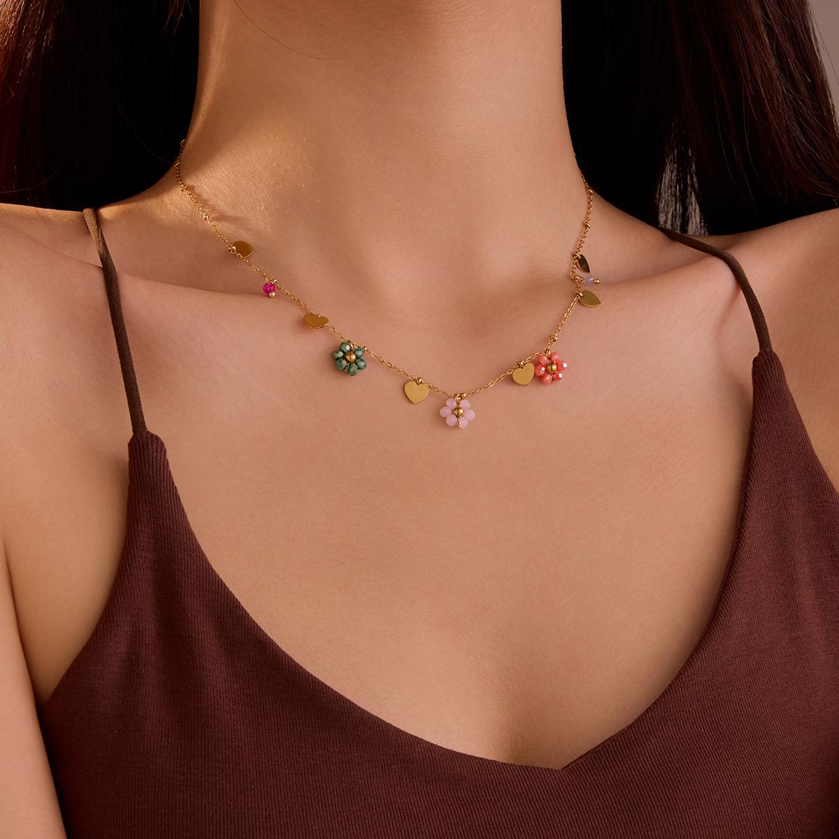 Productos Nuevos Europeos y Americanos Estilo Pequeño Fresco Acero Inoxidable No se Desvanece Cristal Colorido Zircón Flor Amor Colgante Collar