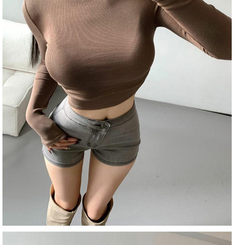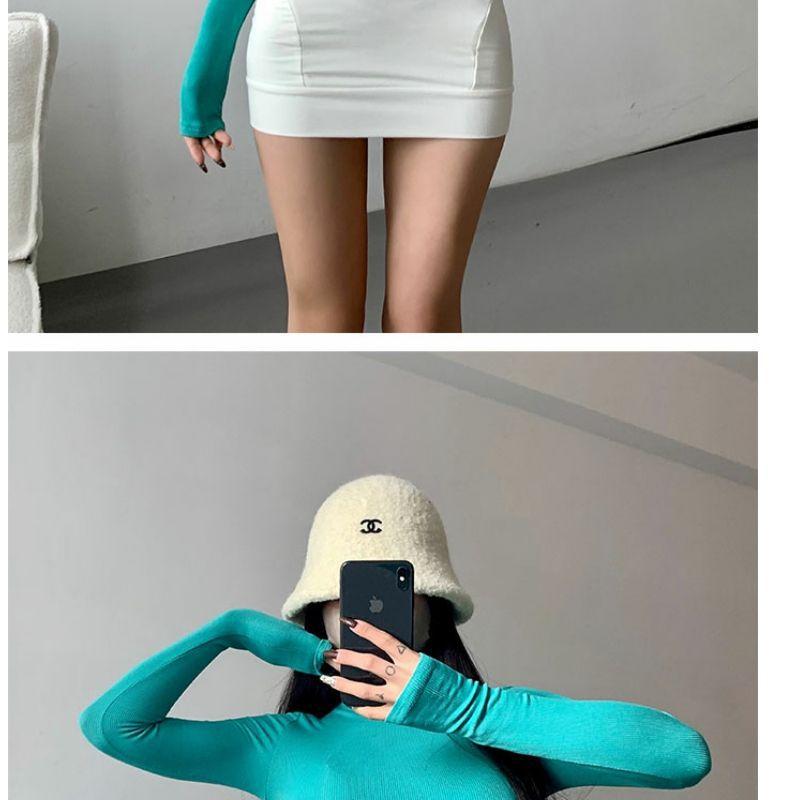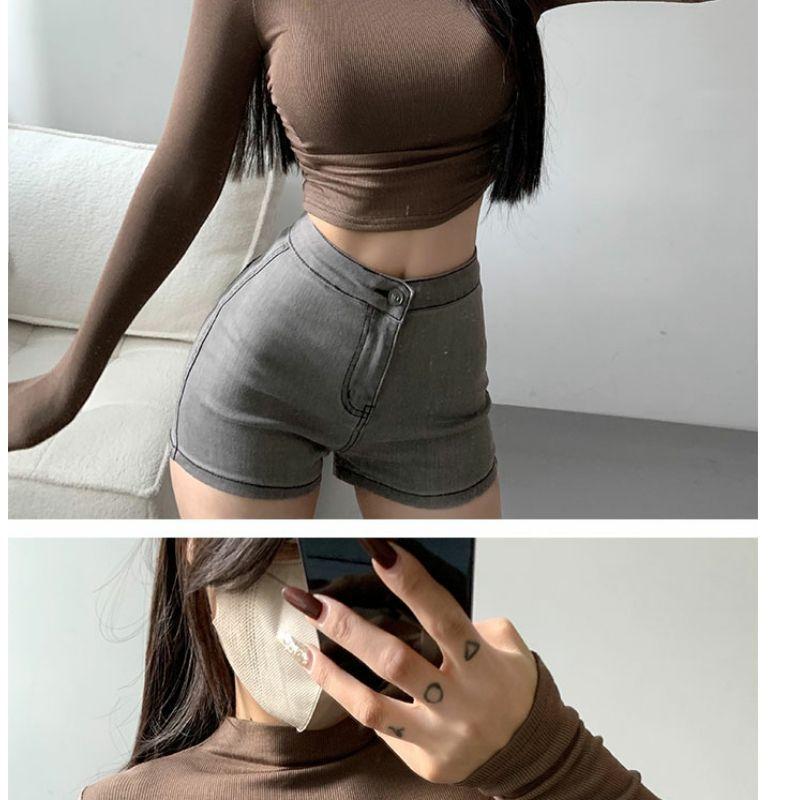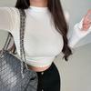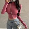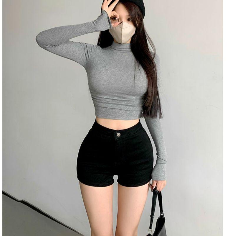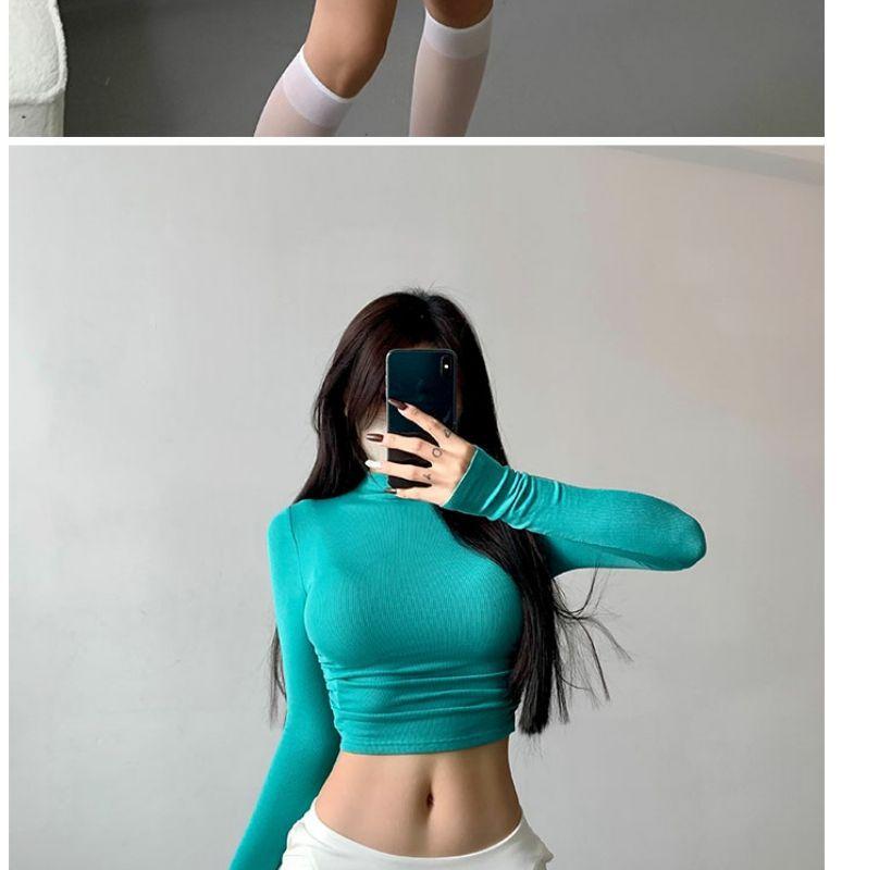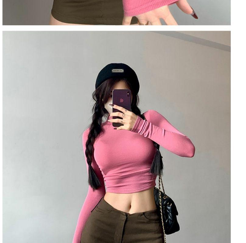 Camiseta de manga larga estilo Spice Girl, estilo europeo y americano, con cuello alto, corte entallado y diseño plisado lateral para mujer, color liso
