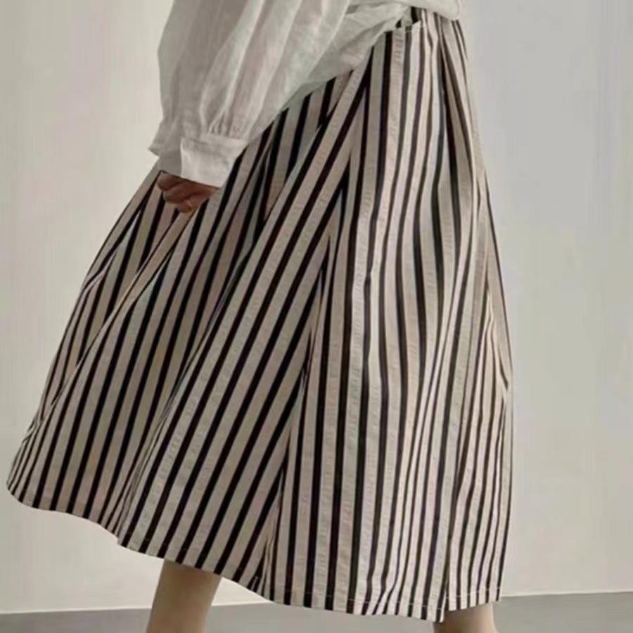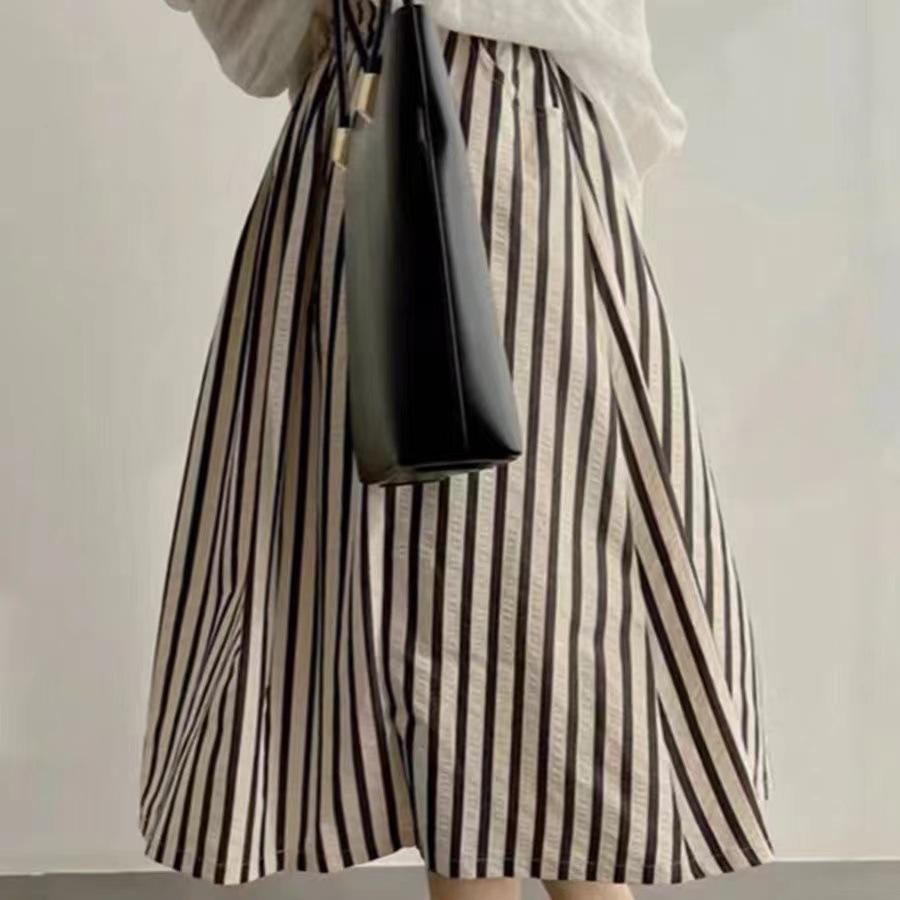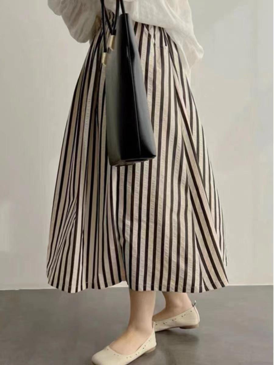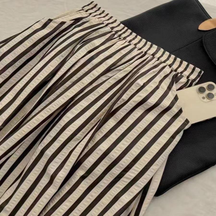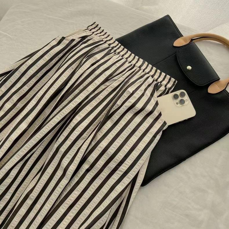 Falda Elástica Midi Línea A Falda Grande con Vuelo Falda Paraguas para Mujer Verano Nuevo Estampado a Rayas Color Cintura Alta Versátil