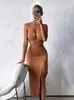 Vestido de Fiesta de Verano Europeo y Americano para Mujer Sexy Hueco con Cordones en el Cuello Abertura Alta Vestido Largo