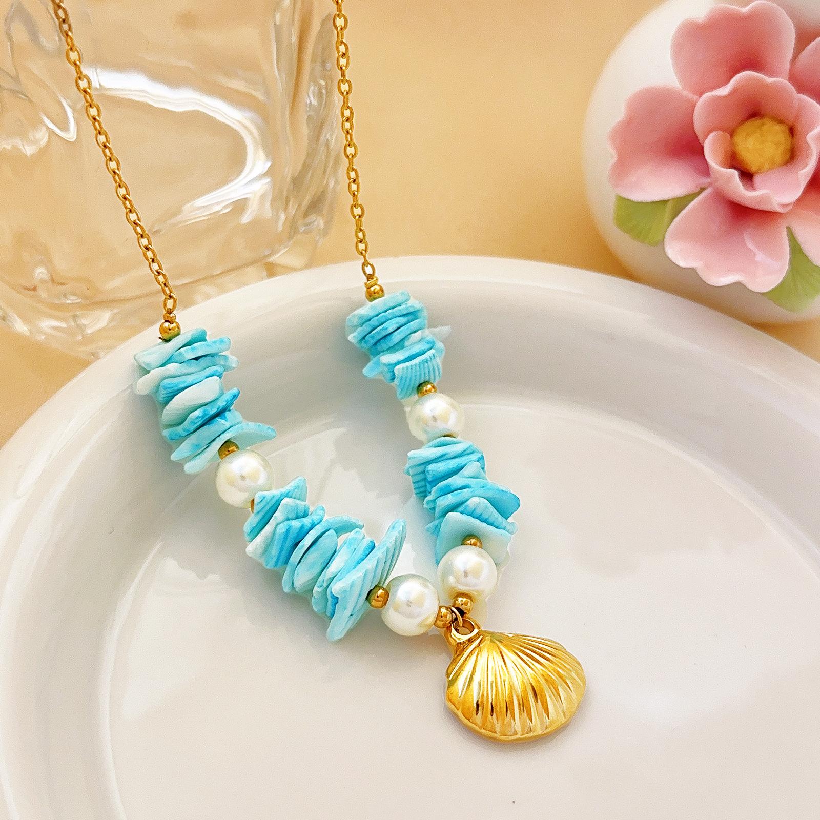 Collar de acero inoxidable con colgante de oro de 18 quilates de alta gama, estilo retro, sencillo, de moda transfronteriza europea y americana, con piedra de concha de color