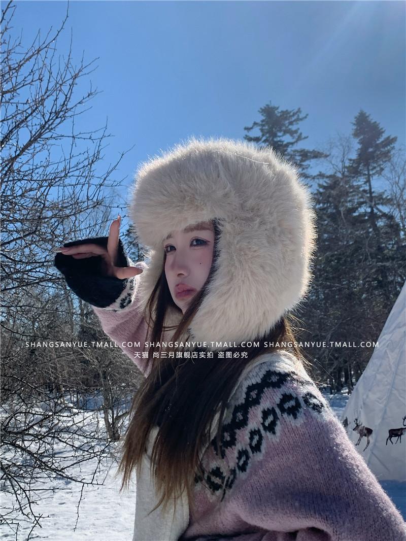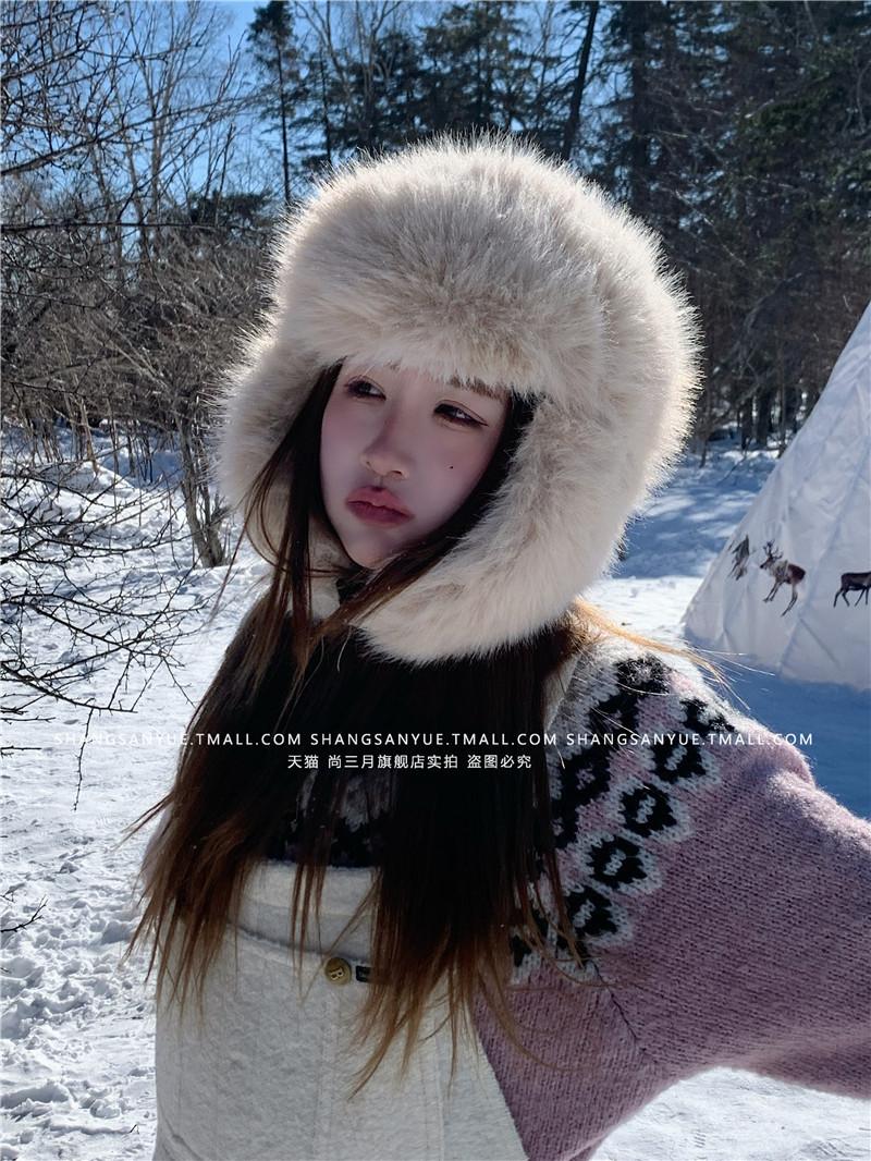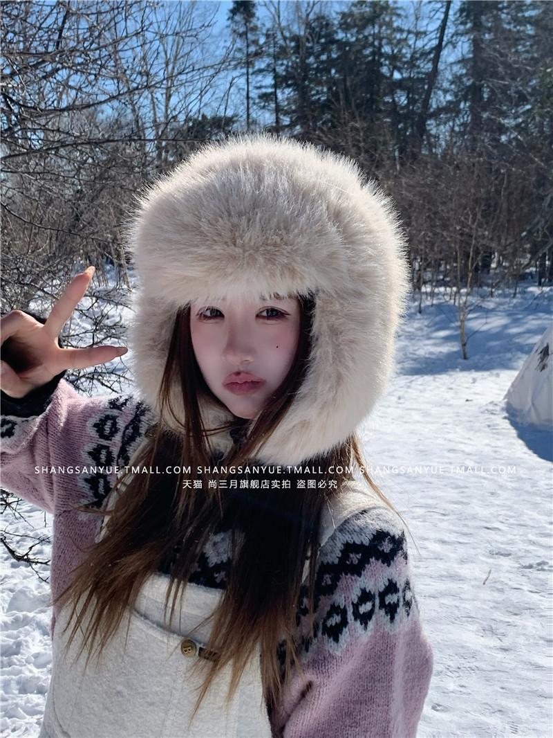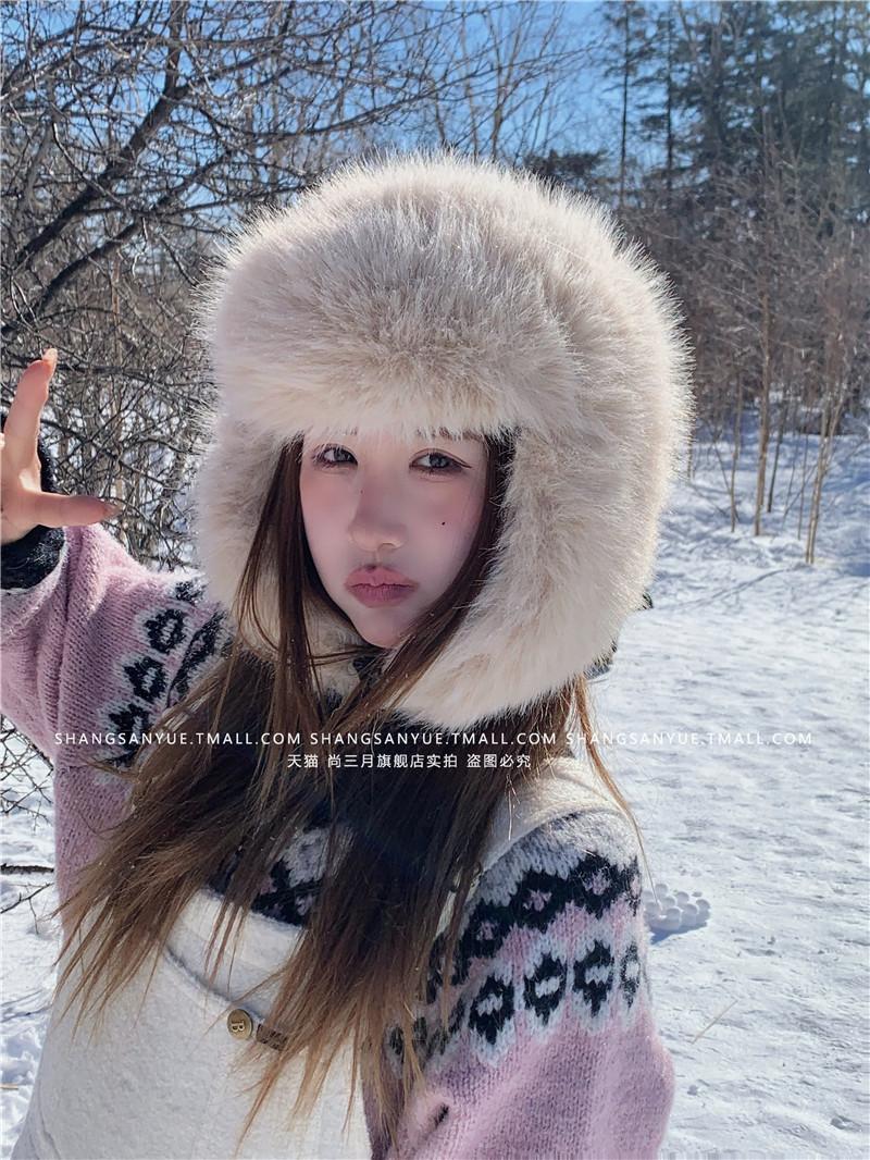 Gorro de Lei Feng de felpa con hebilla de cuerno para mujer, grueso y cálido, con protección para los oídos, para esquí del noreste, para ciclismo al aire libre y frío.