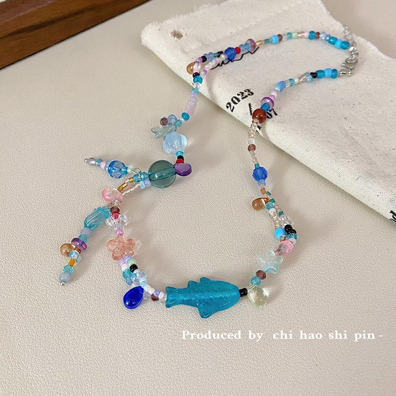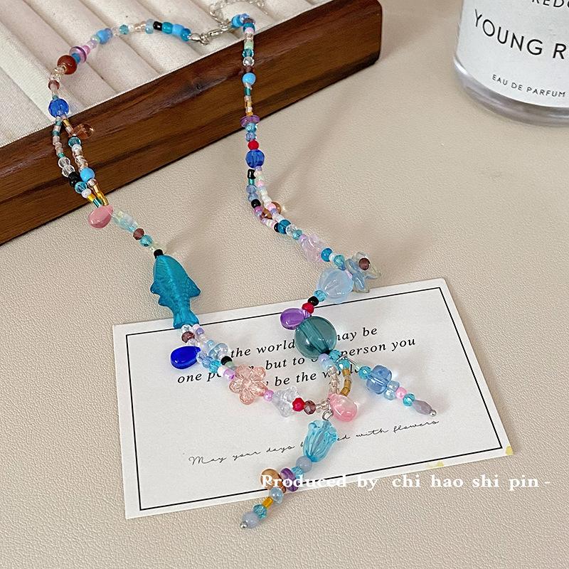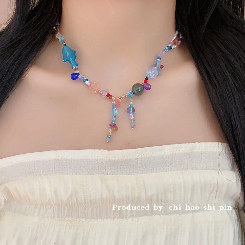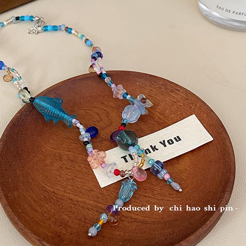 Collar de cuentas de color de pez azul y mariposa mágica del lago espiritual, personalidad de nicho, alta belleza, dulce cadena de clavícula