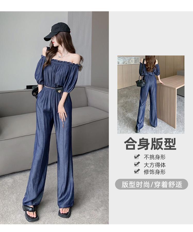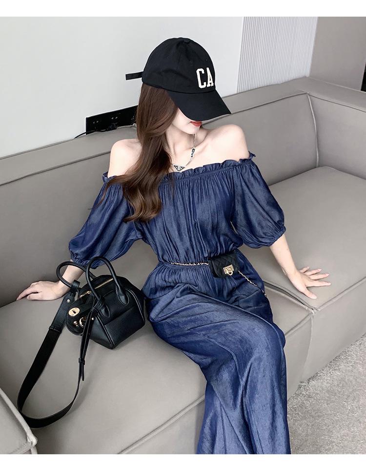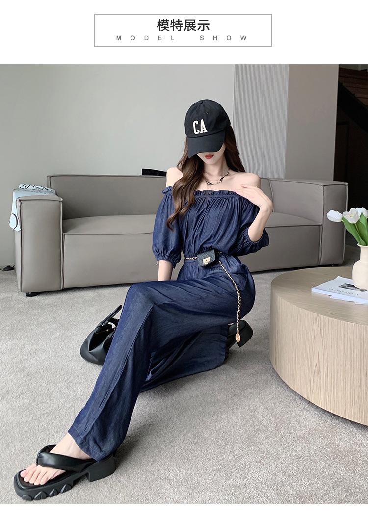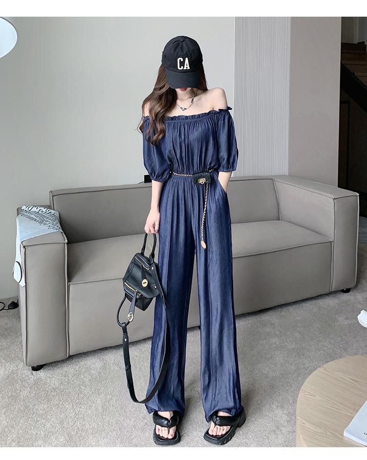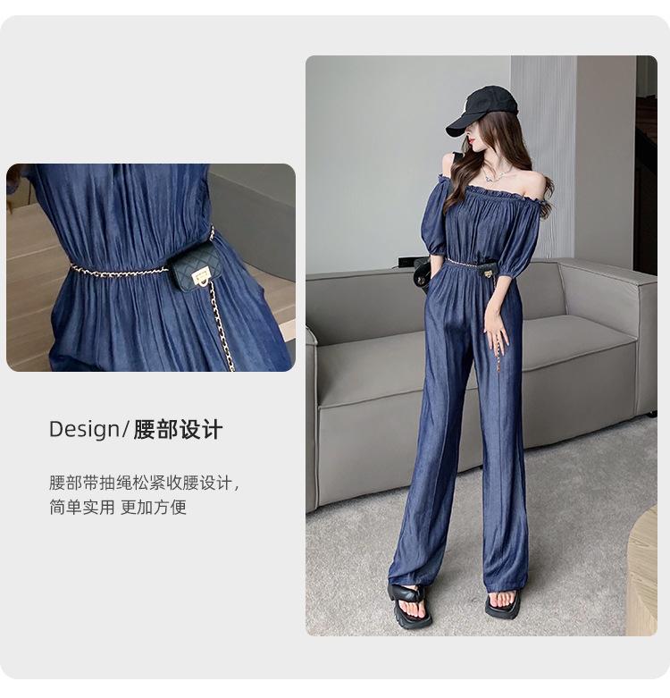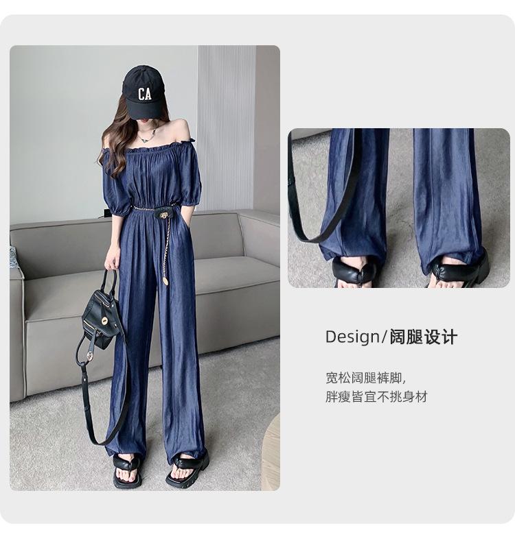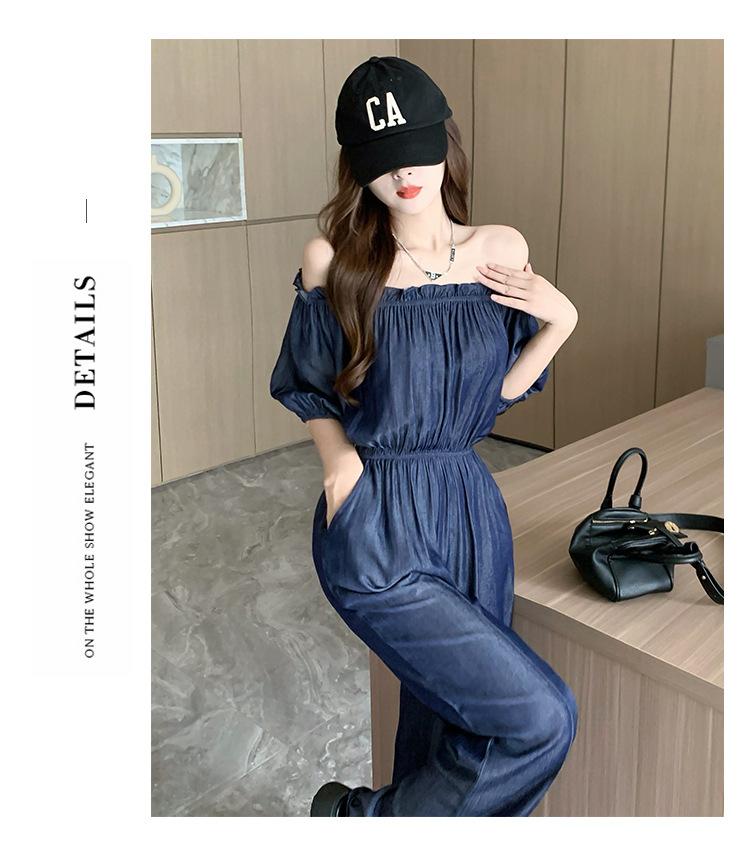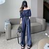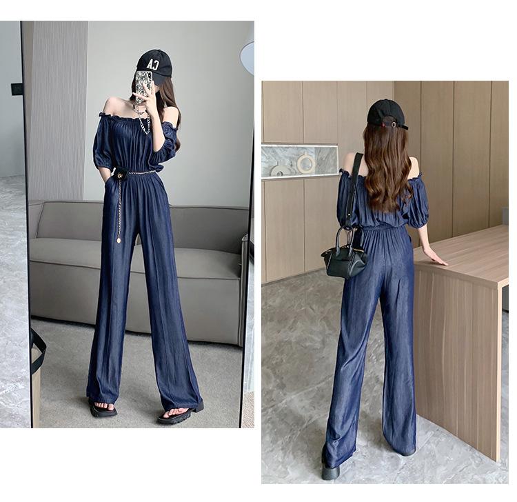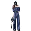 Mono azul de alta gama con hombros descubiertos, novedad de verano 2023, mono de pierna ancha drapeado de color denim adelgazante de cintura alta
