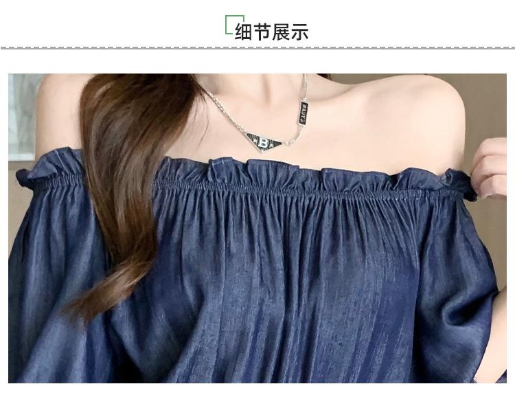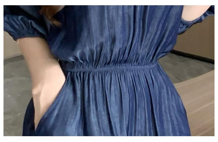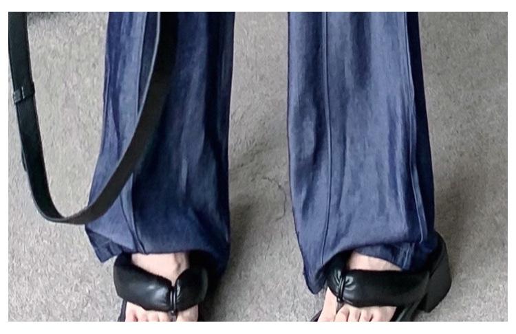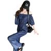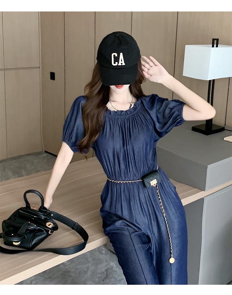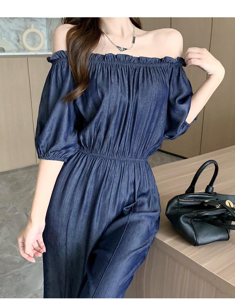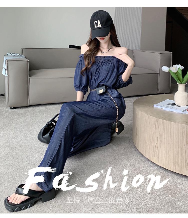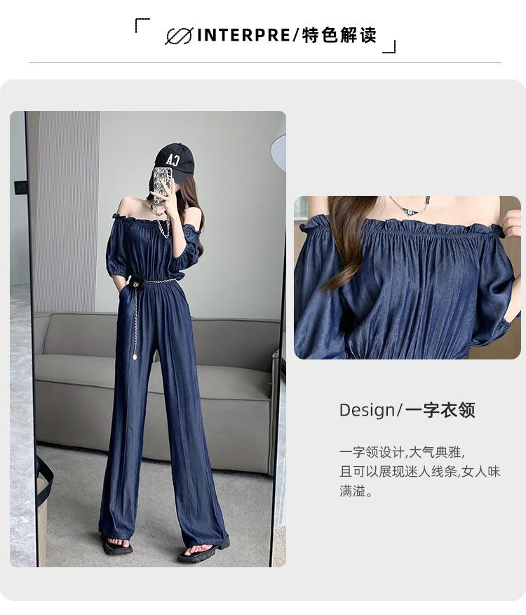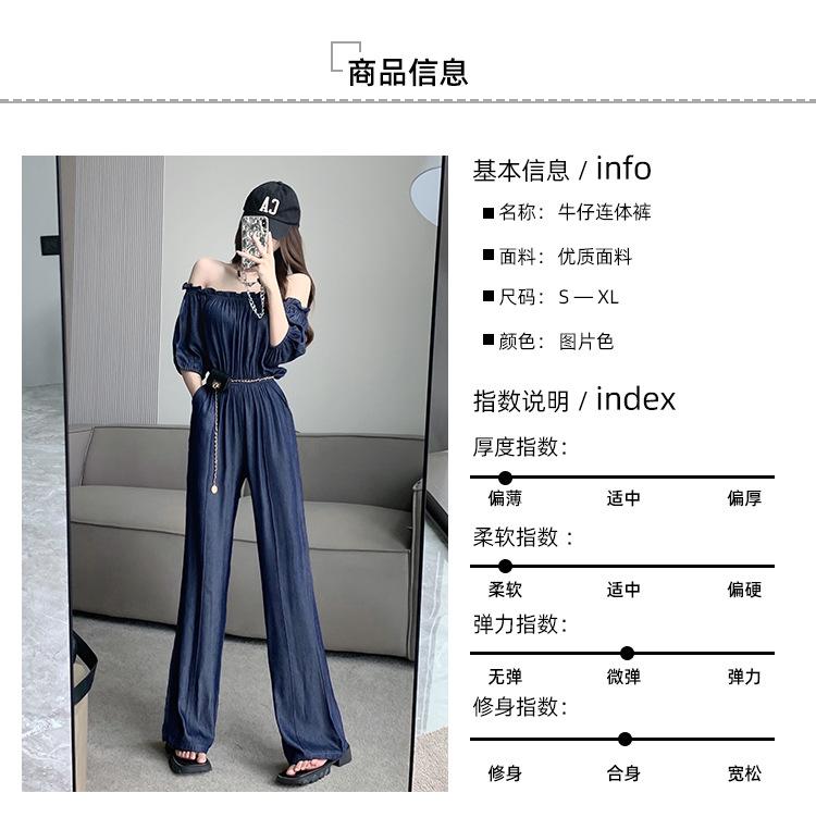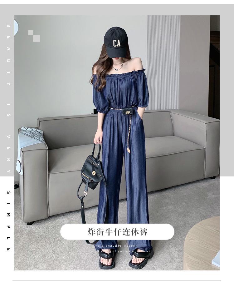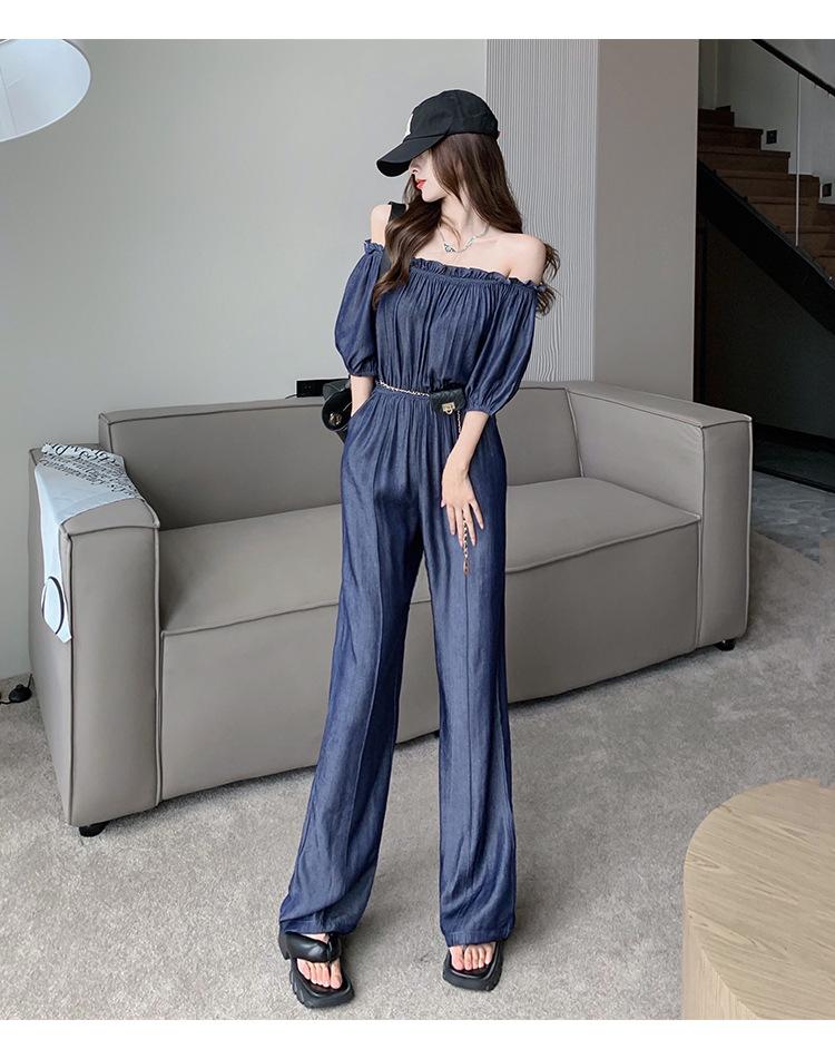 Mono azul de alta gama con hombros descubiertos, novedad de verano 2023, mono de pierna ancha drapeado de color denim adelgazante de cintura alta