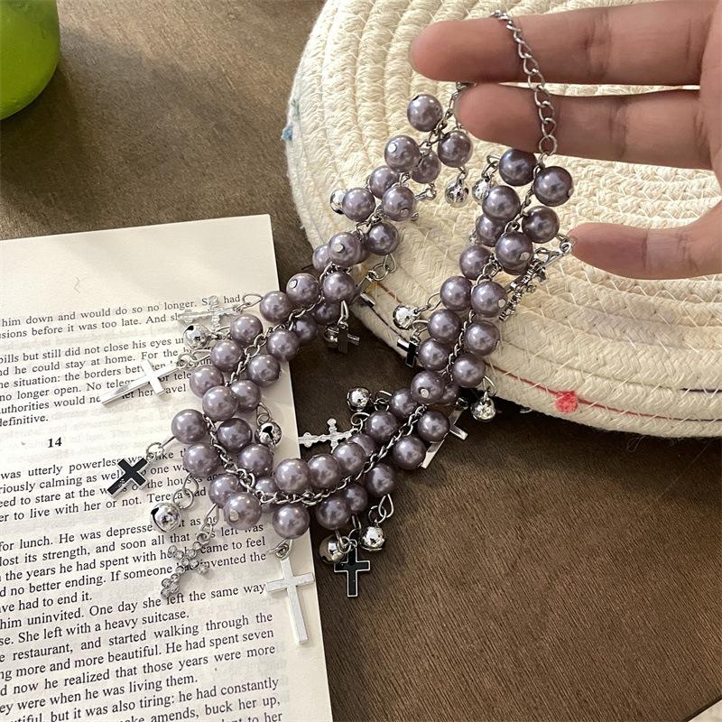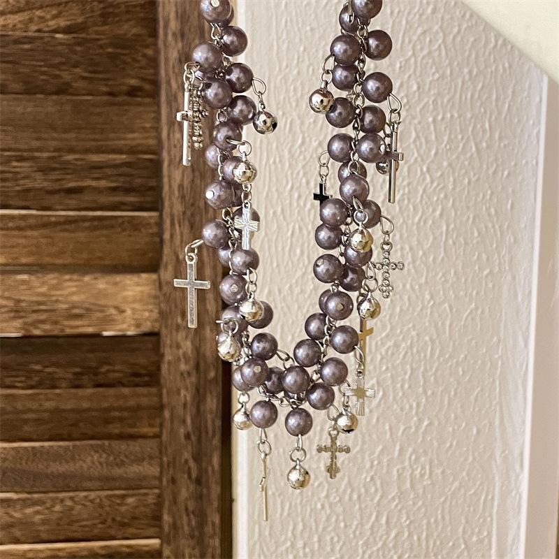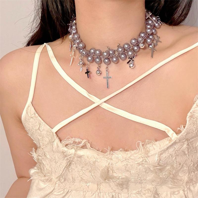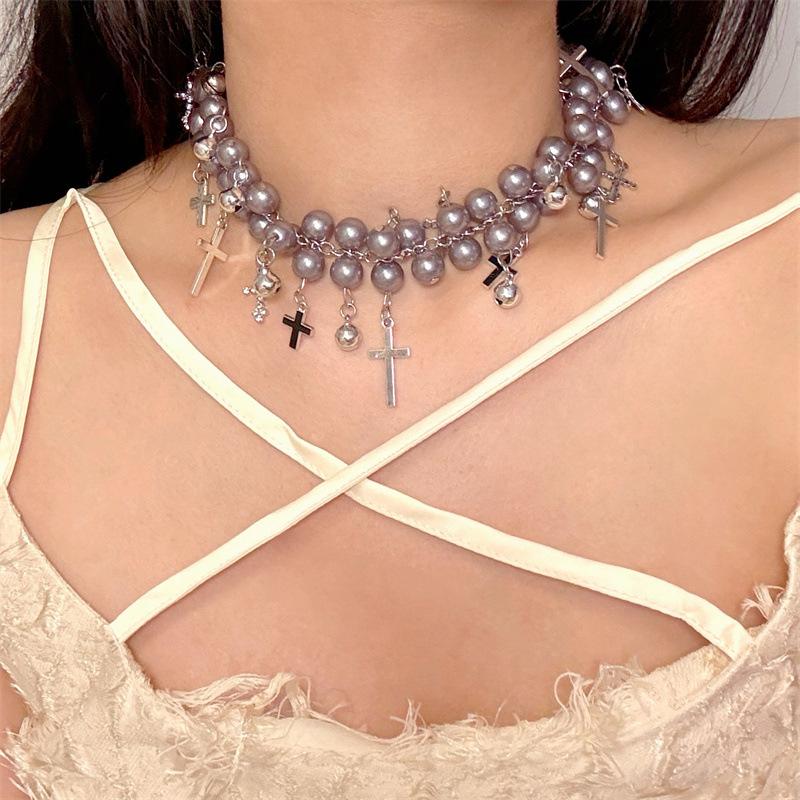 Collar de Cadena de Perlas de Doble Capa con Campana de Cruz Incrustada de Diamantes, Diseño Retro Niche, Cadena para Cuello, Collar de Moda