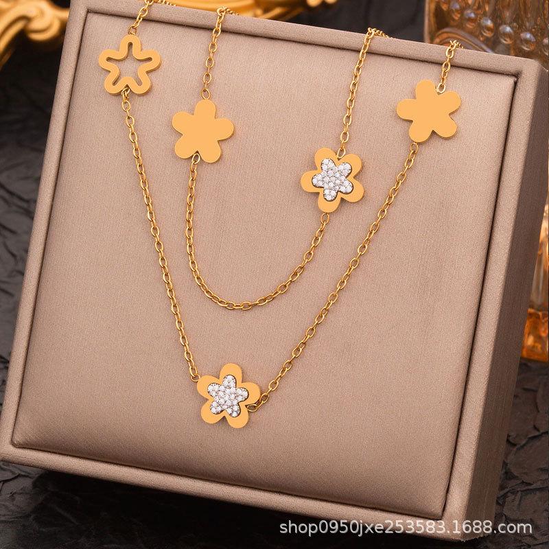Collar CDD de acero inoxidable con trébol de cuatro hojas y múltiples flores, cadena de suéter con flores huecas, joyería superpuesta de gran venta para mujeres