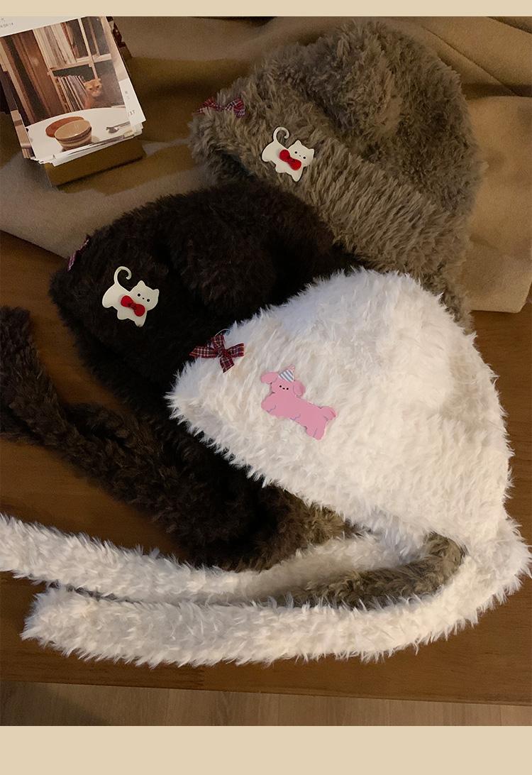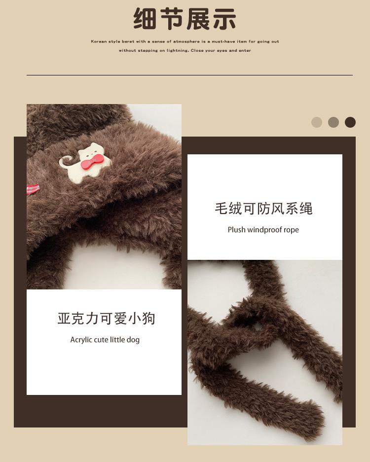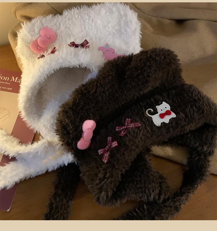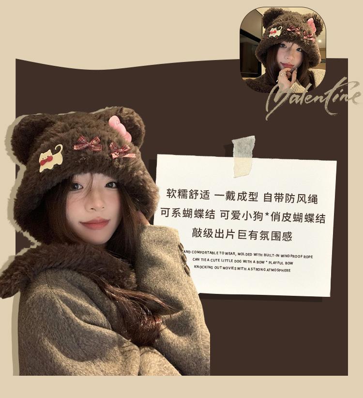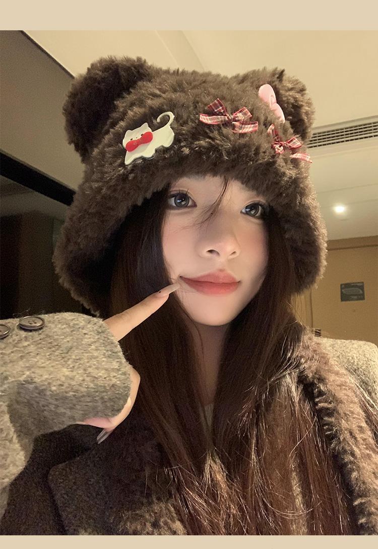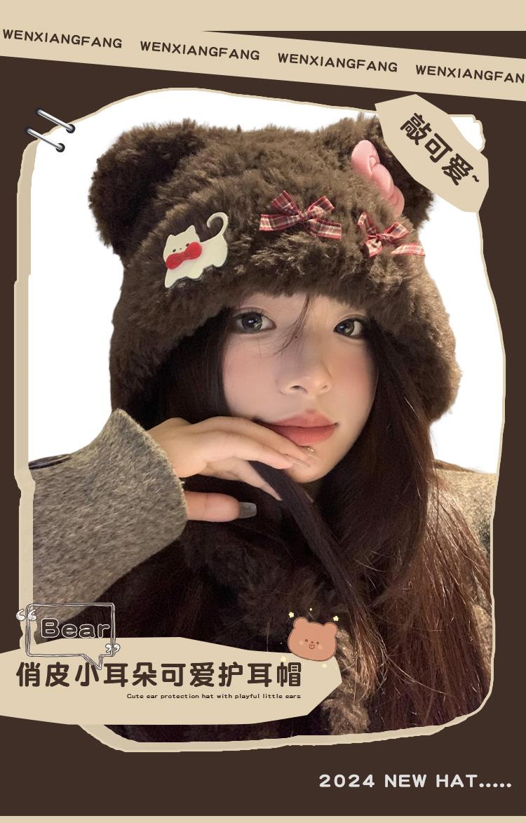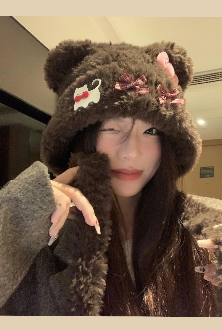 Lindo Sombrero de Oso con Orejas de Gato y Lazo, Sombrero Esponjoso para Mujer para Otoño e Invierno, Cálido, Protección para las Orejas, Sombrero Lei Feng, Sombrero que Muestra la Cara
