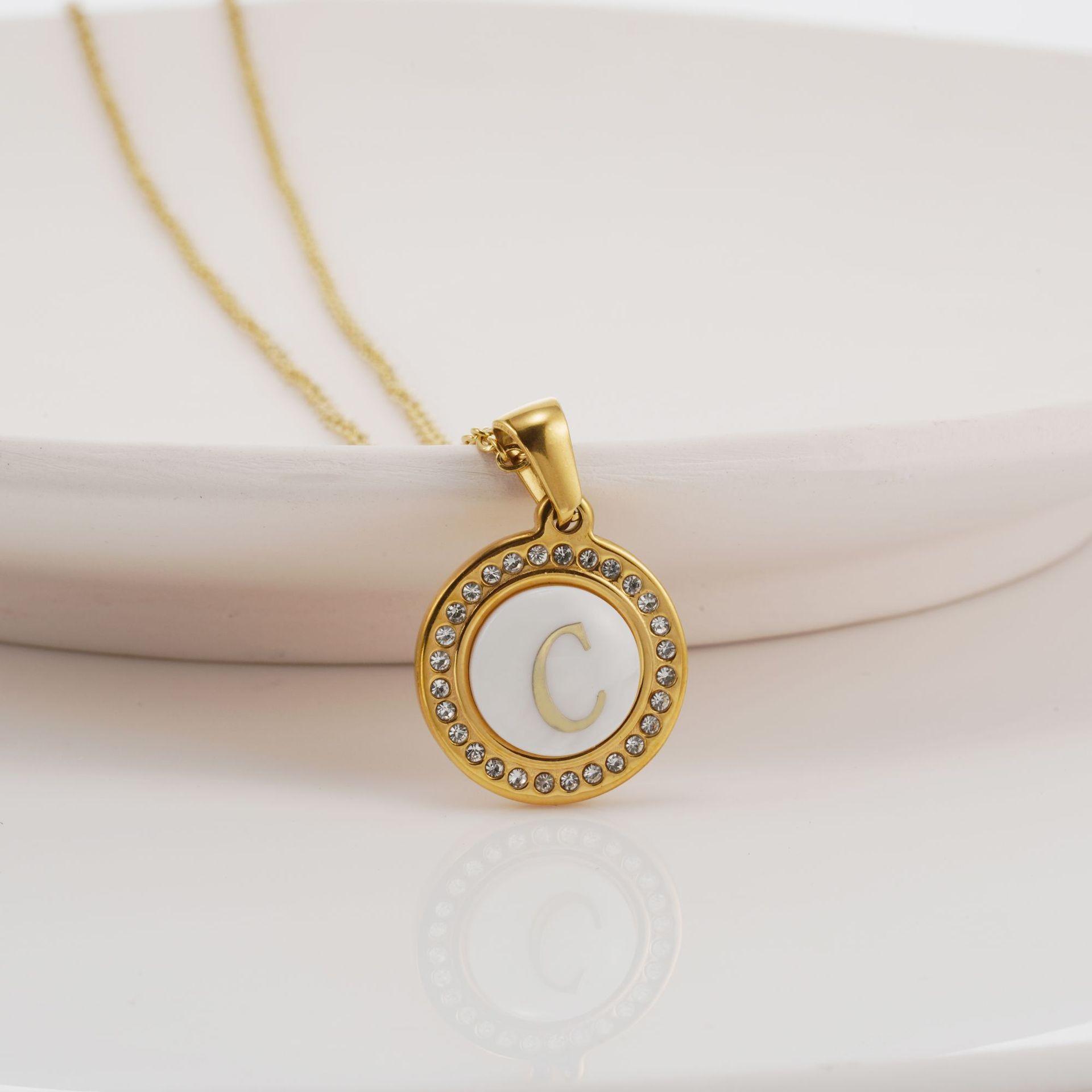 Collar con colgante de letra de diamante redondo de acero de titanio transfronterizo para mujer, estilo europeo y americano, con forma de concha de acero inoxidable de 18 quilates