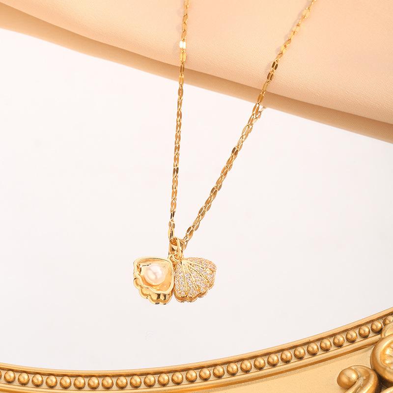 Collar de Perlas Shell de Moda con Incrustaciones de Diamantes Estilo Coreano Collar de Acero Titanio sin Color Joyería de Celebridad de Internet con Colgante Elegante en Forma de Abanico para Mujer