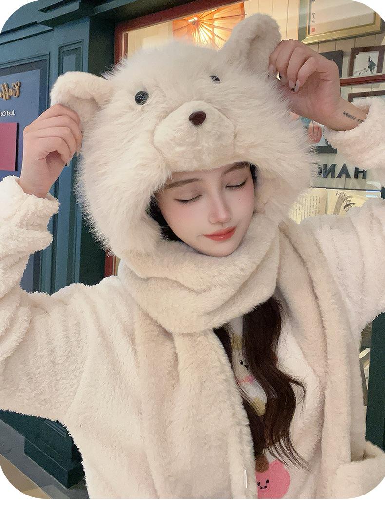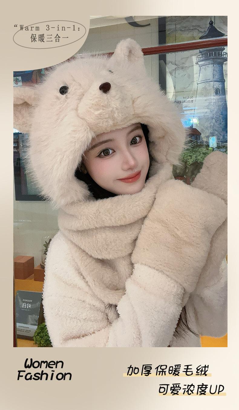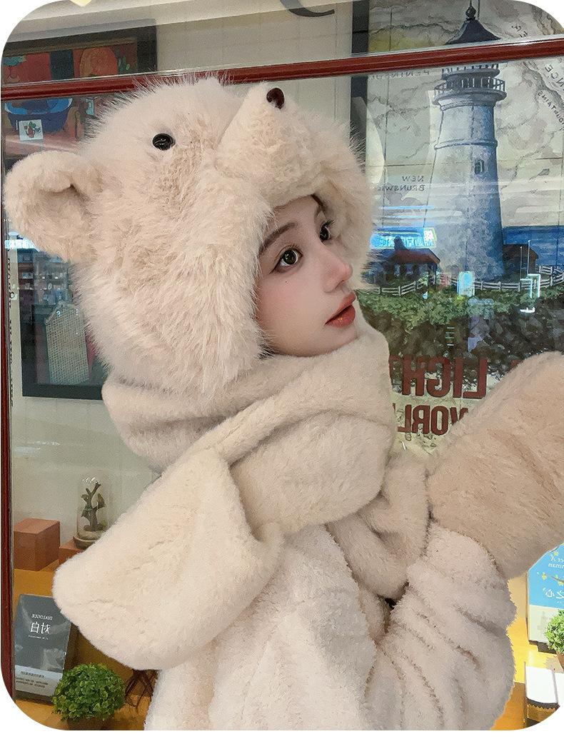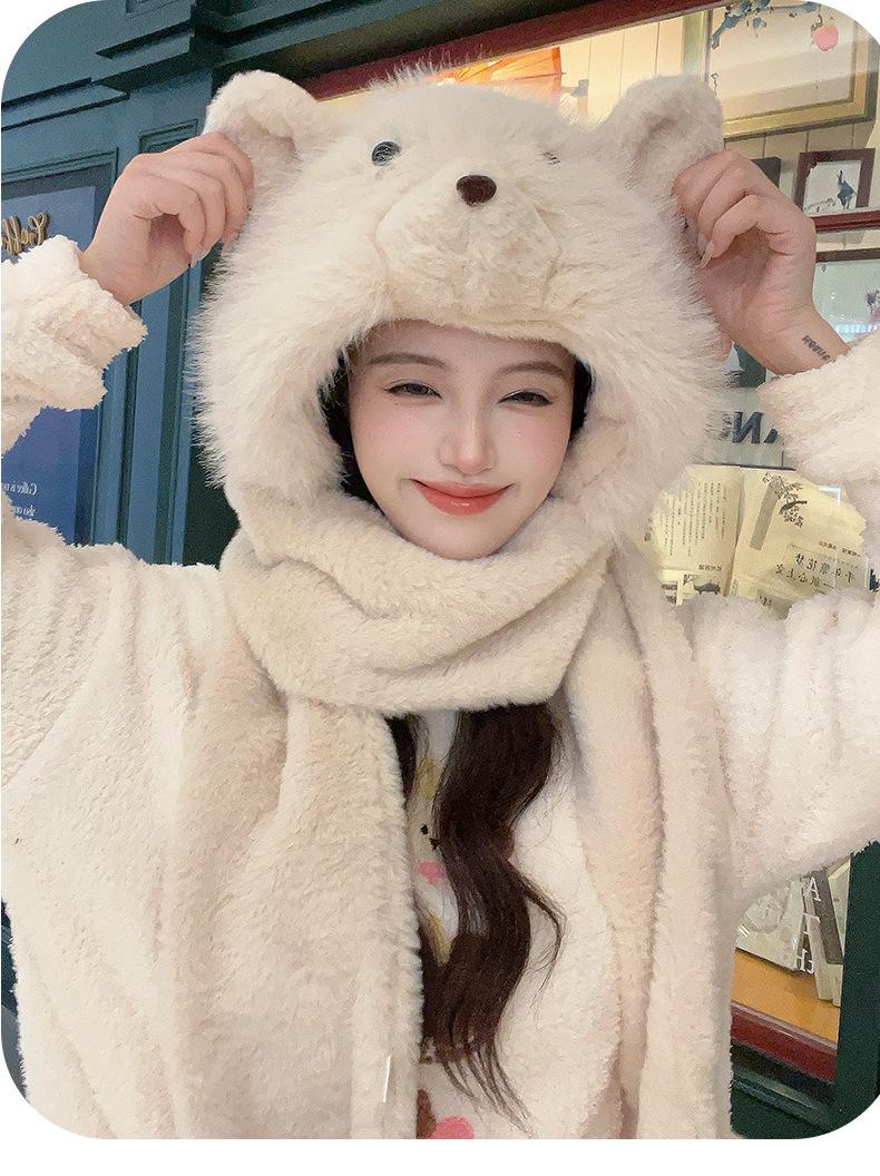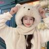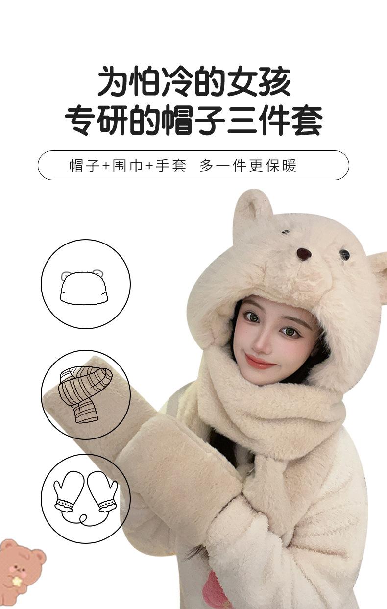 Set de tres piezas de babero, guantes y gorro, oso lindo, gorro de invierno de terciopelo, para mujer, grueso con forro polar, cálido para el frío