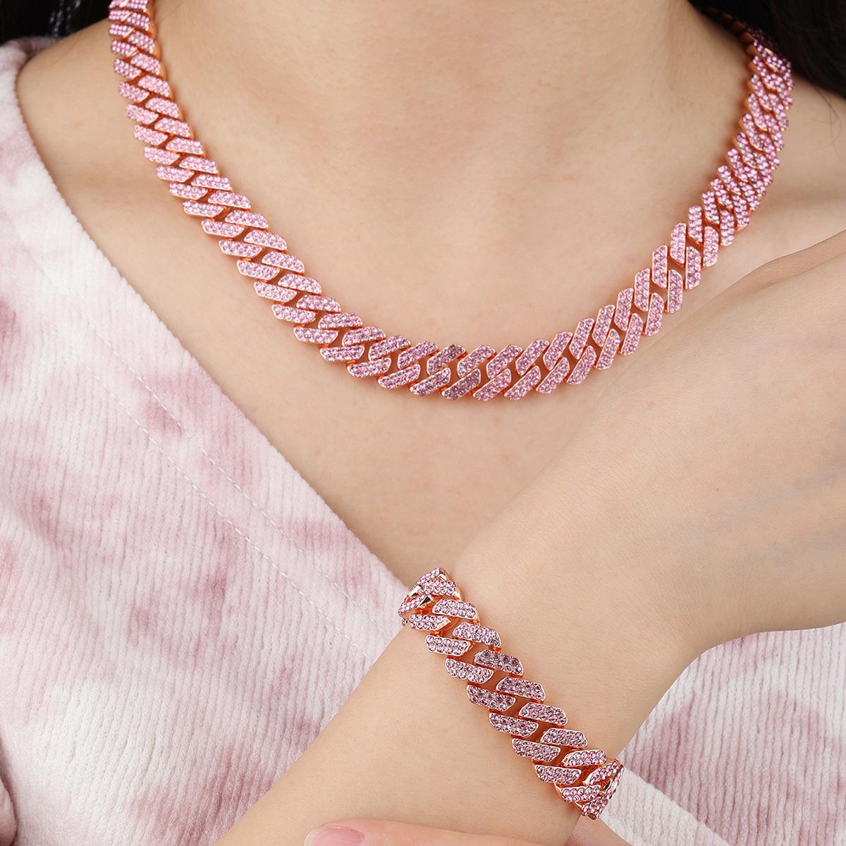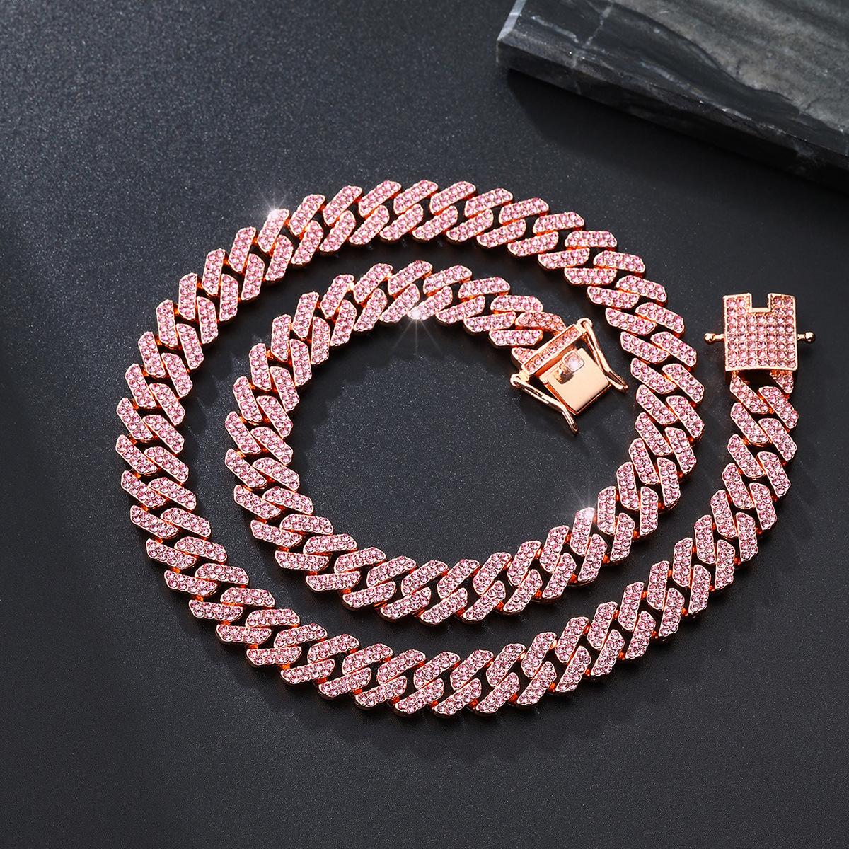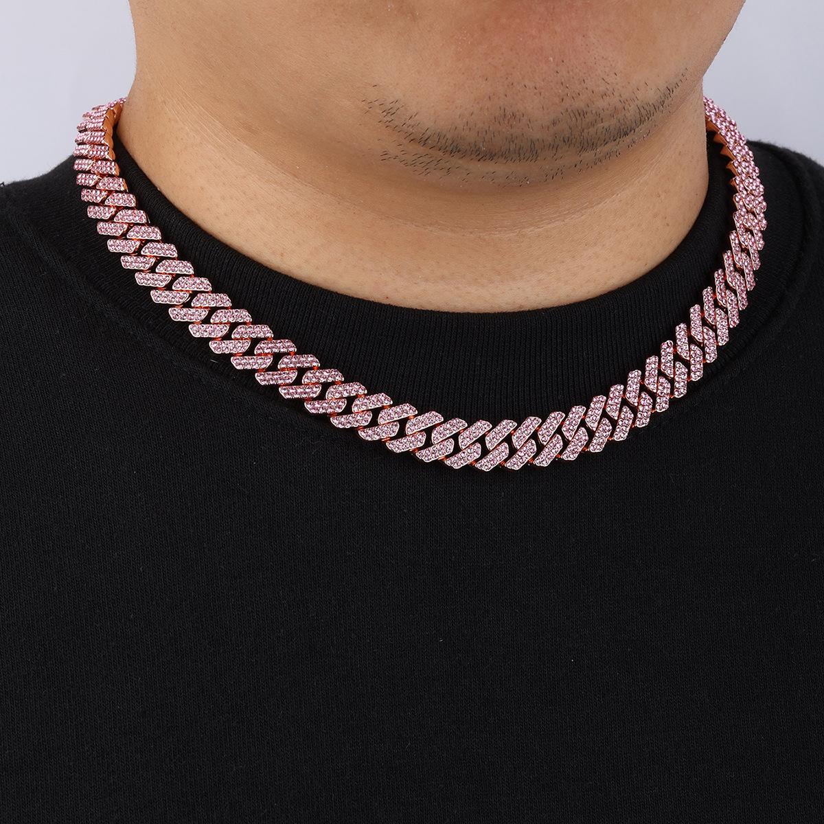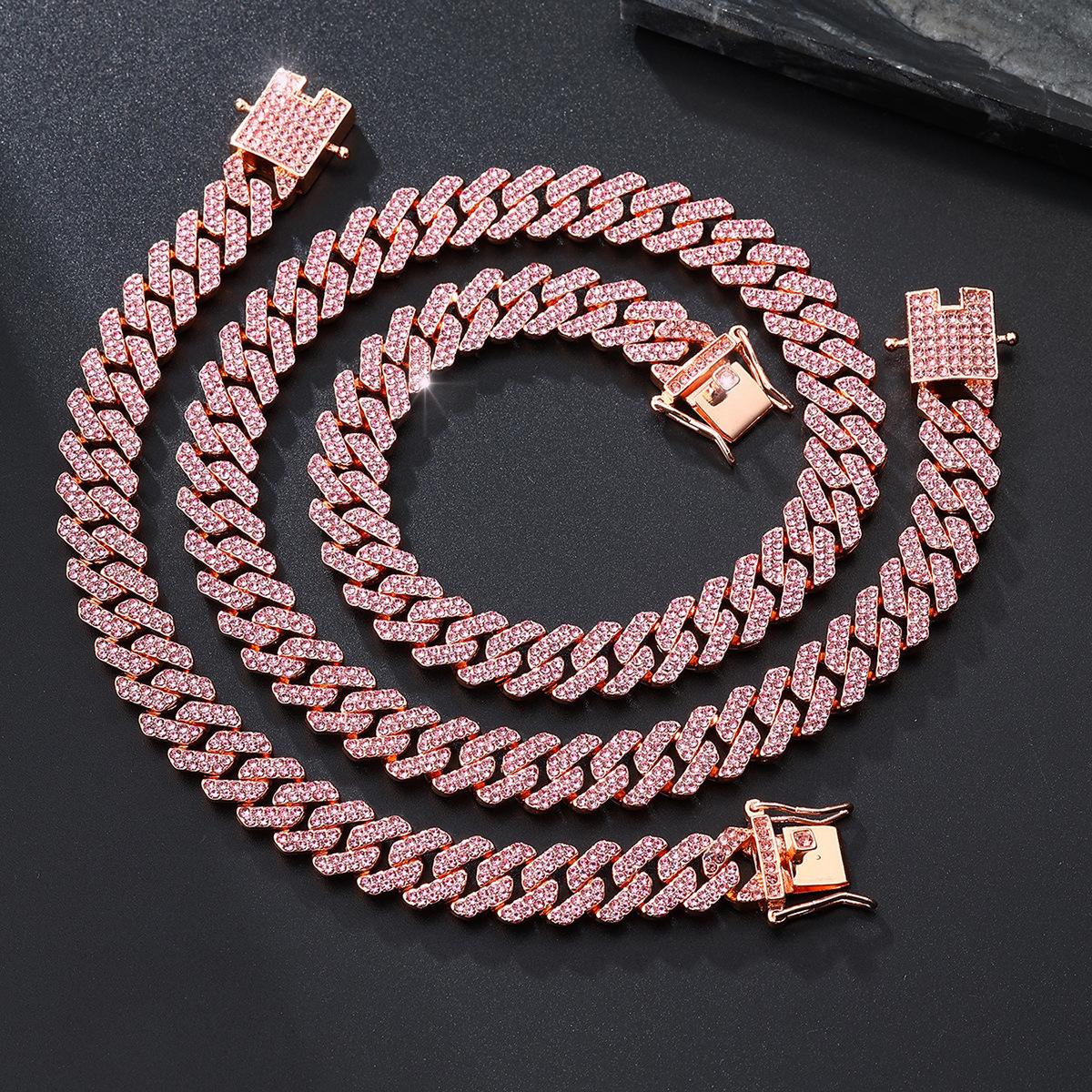 Hip-hop europeo y americano circonita rosa cadena cubana de diamantes completos aleación Miami diamante cadena cubana de doble fila para hombres y mujeres