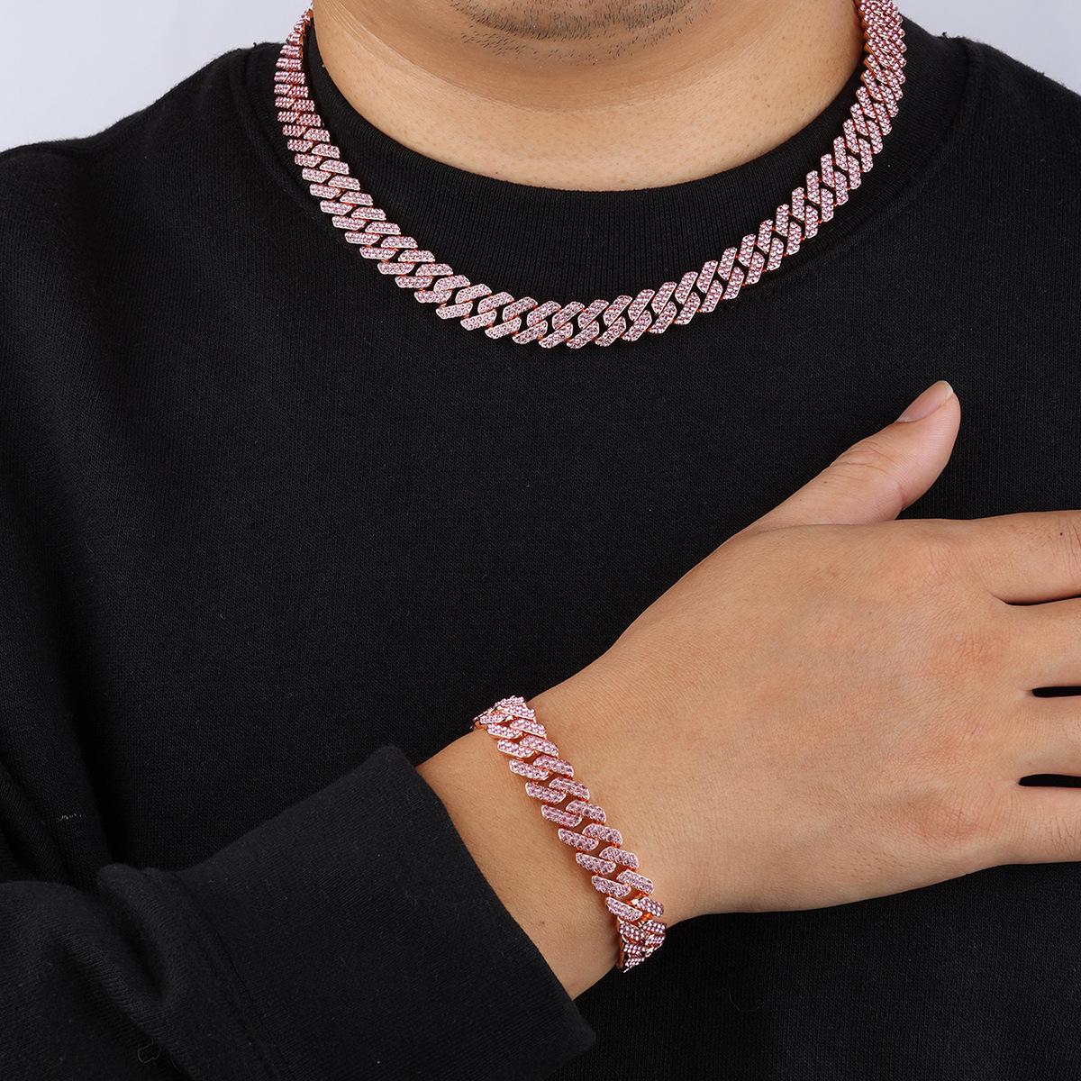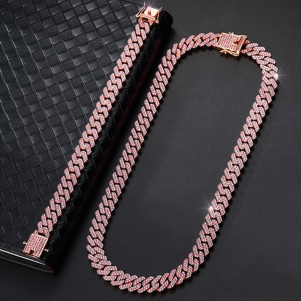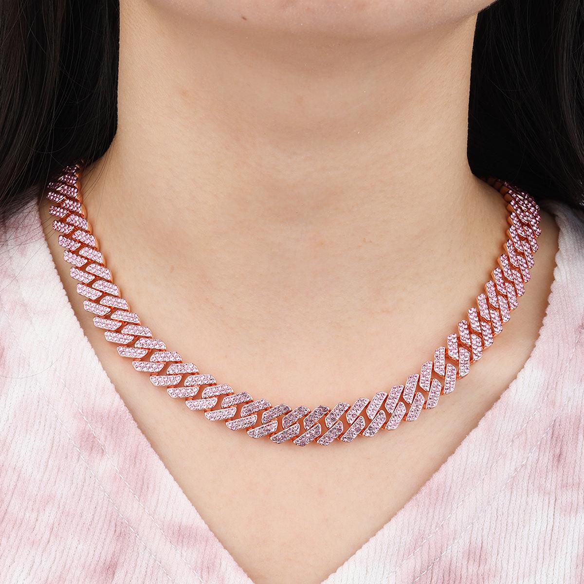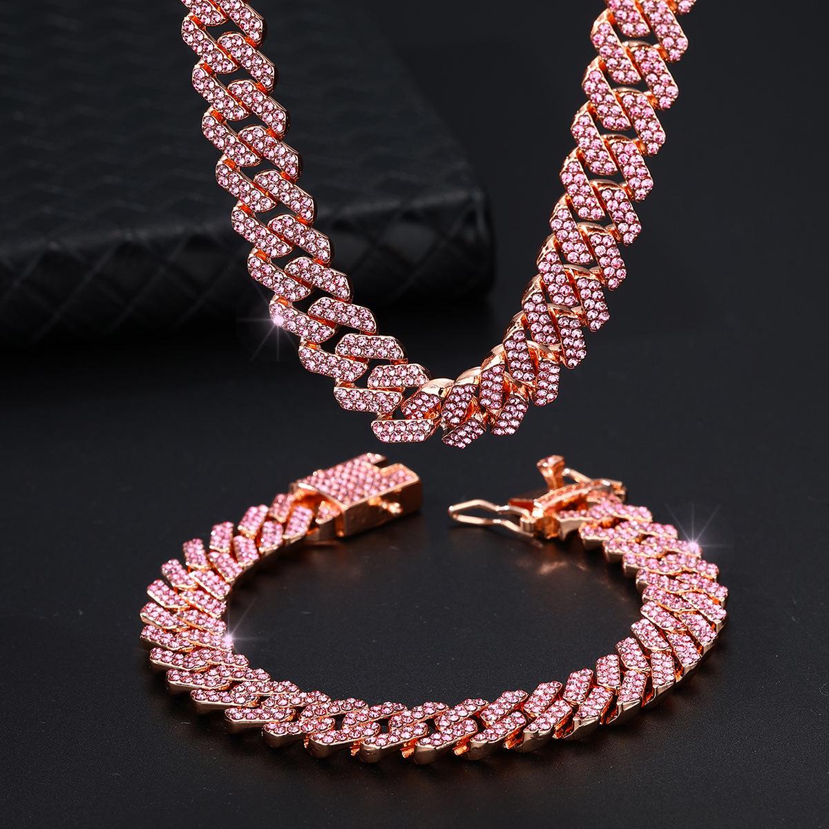 Hip-hop europeo y americano circonita rosa cadena cubana de diamantes completos aleación Miami diamante cadena cubana de doble fila para hombres y mujeres
