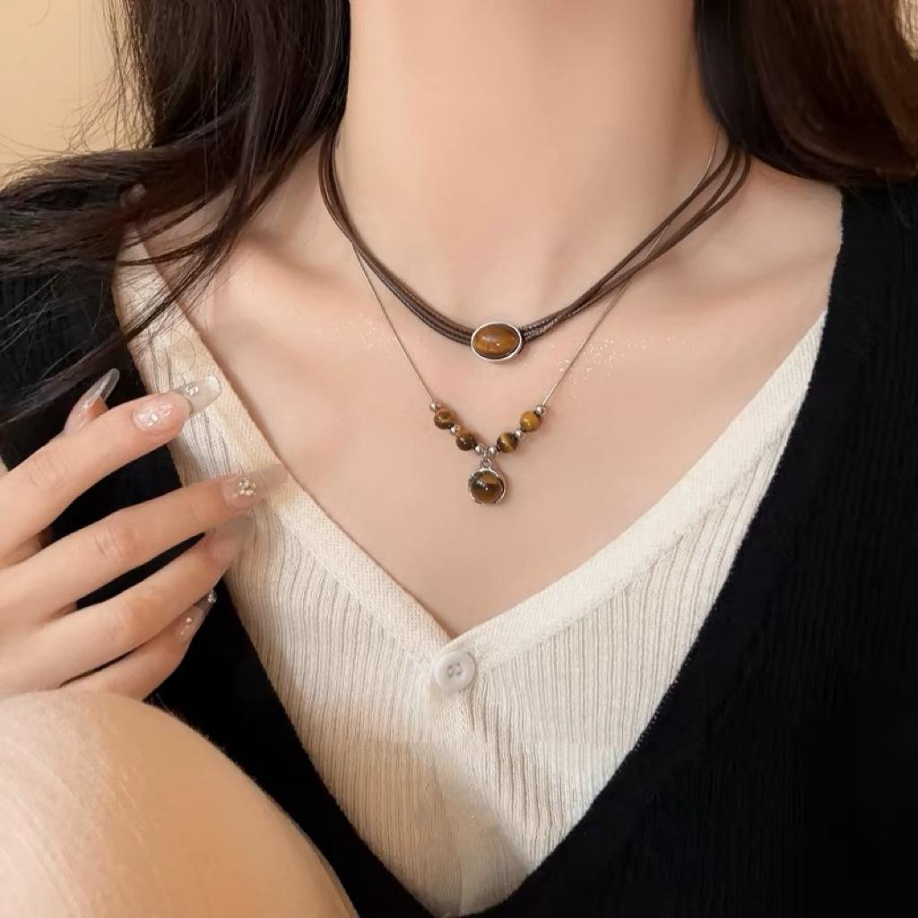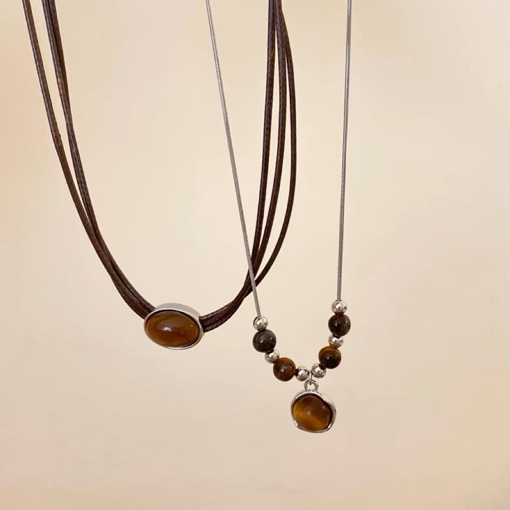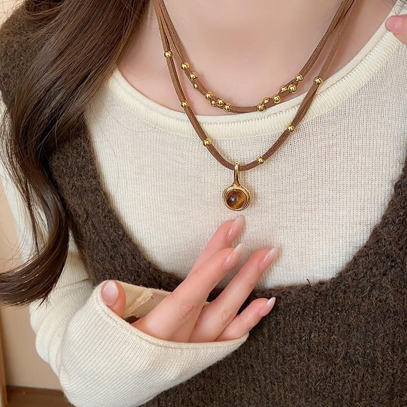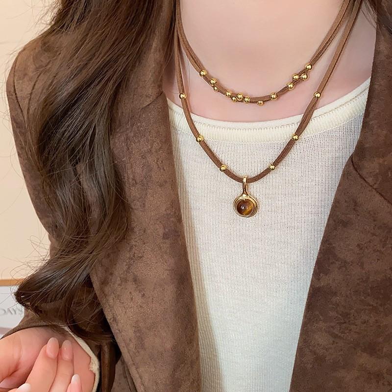 1#Necklace-gold-brown-round, 4#Necklace-silver-brown round, 6#Necklace-brown double-layer leather (two-piece s...