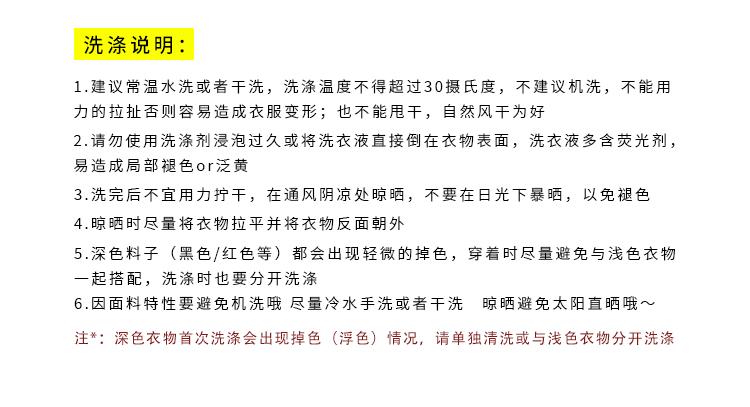 La ropa se puede lavar primero a mano o a máquina. Tanto si es de colores contrastantes como de un solo color, no debe remojarse durante mucho tiempo. Lávela inmediatamente después del remojo para evitar manchas o decoloración.