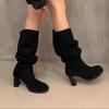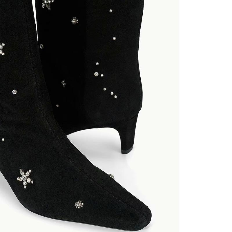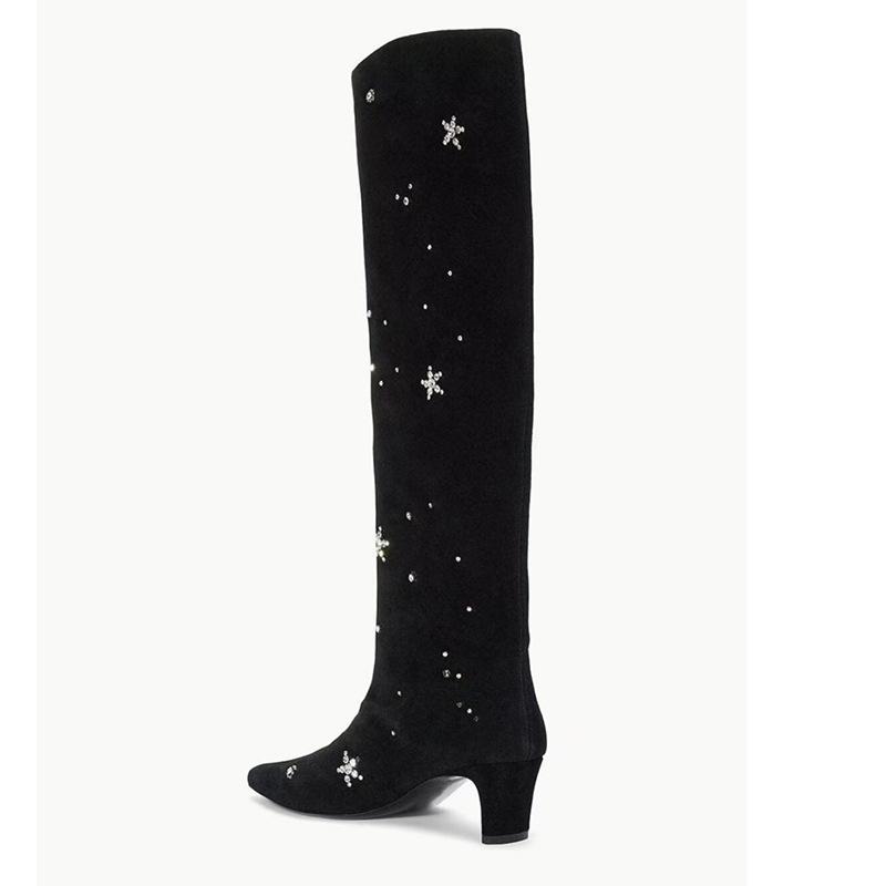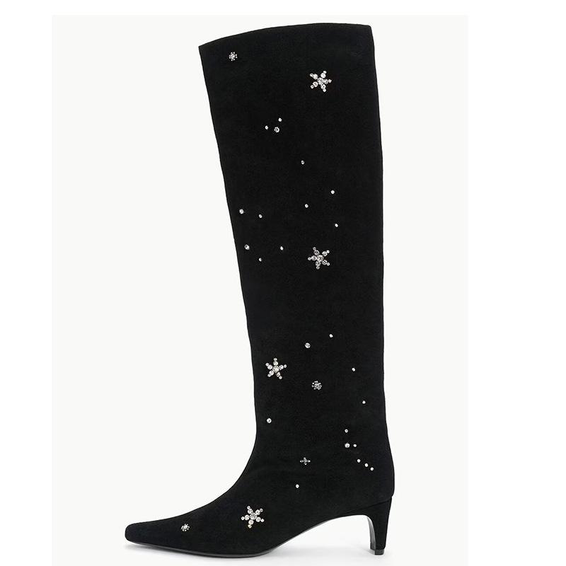 Pero Botas hasta la Rodilla de Tacón Grueso 2025 Invierno Exportación Nuevo Diseño Punta Cuadrada Pedrería Tacón Alto Delgado Botas de Caballero