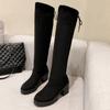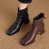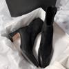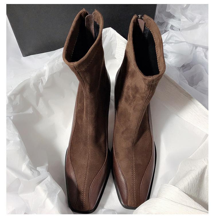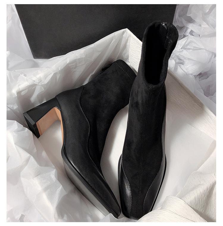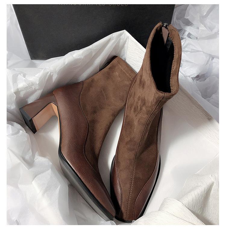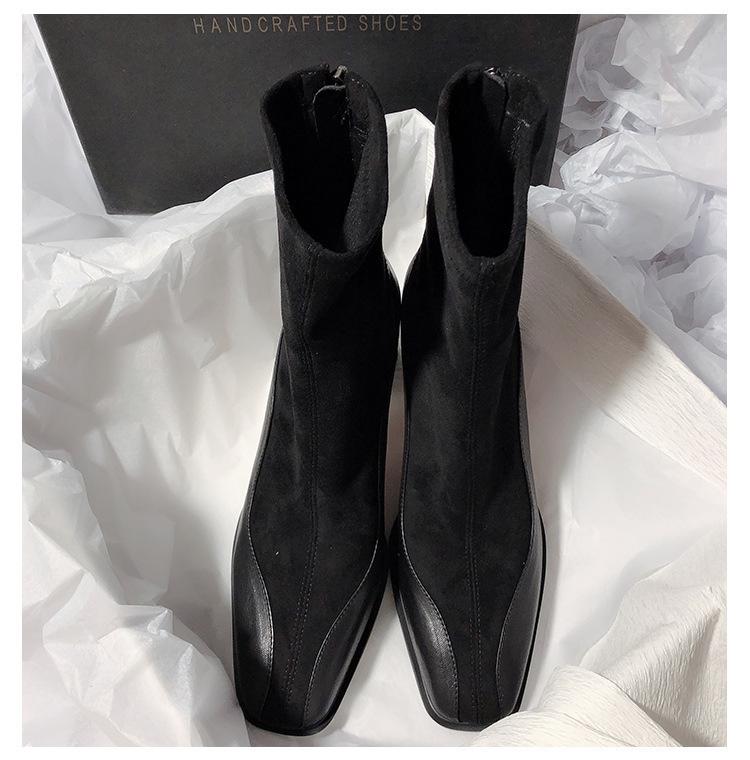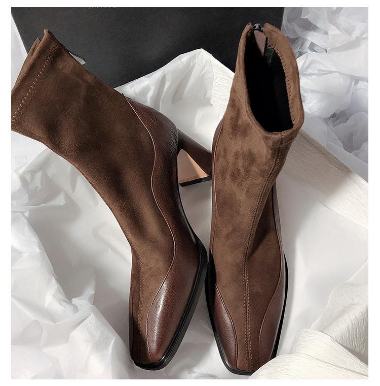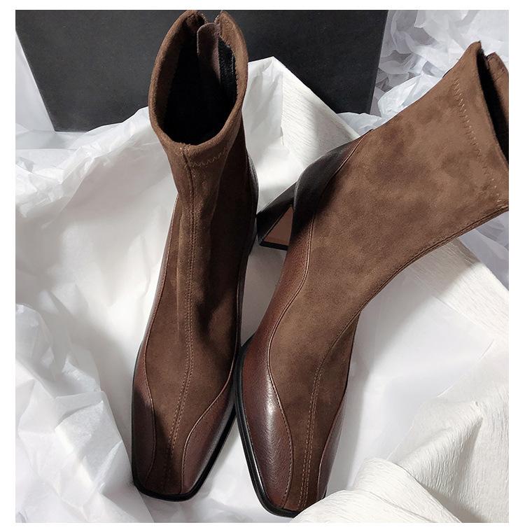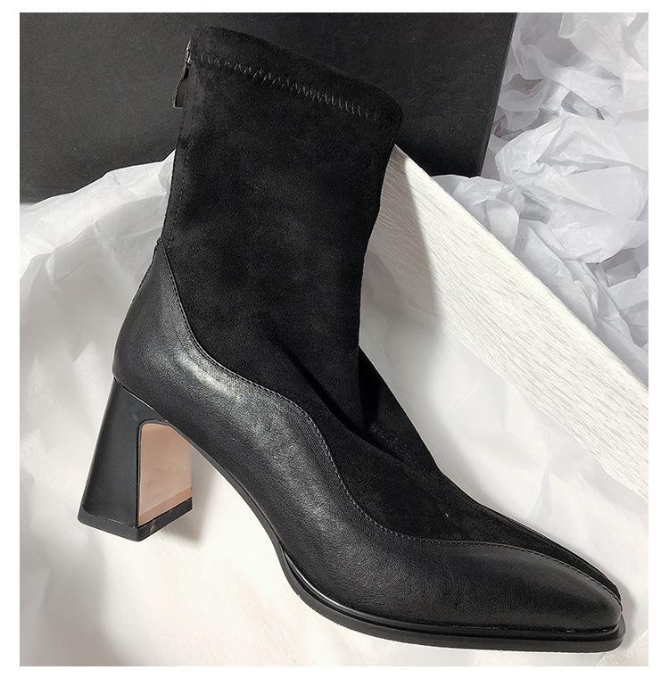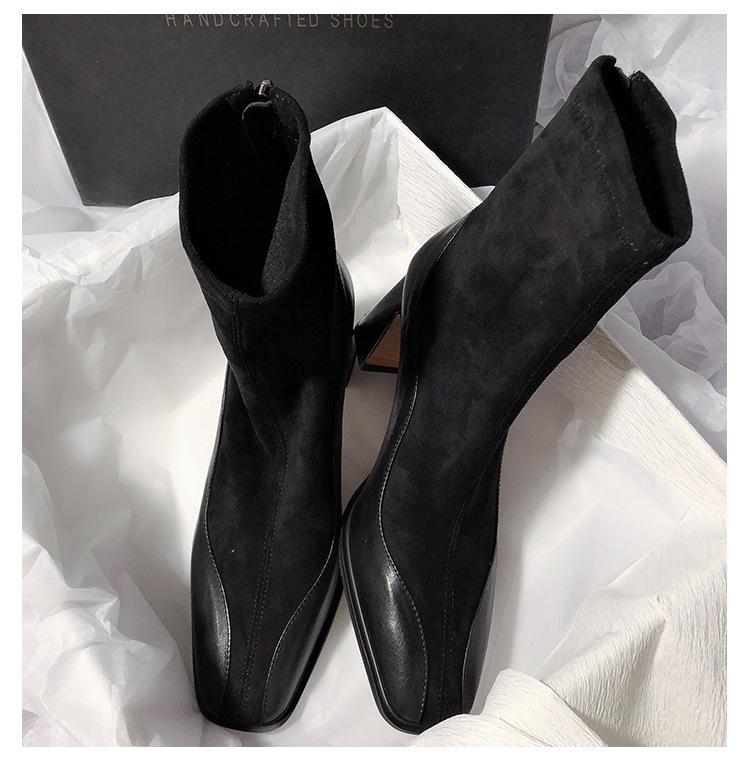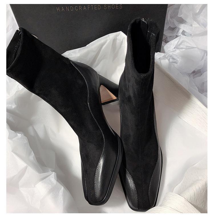 Botas Delgadas Elásticas Empalmadas de Tacón Grueso y Punta Cuadrada 2025 Otoño e Invierno Nuevas Botas Cortas de Tacón Alto Populares Delgadas Botas Cortas Botas de Mujer
