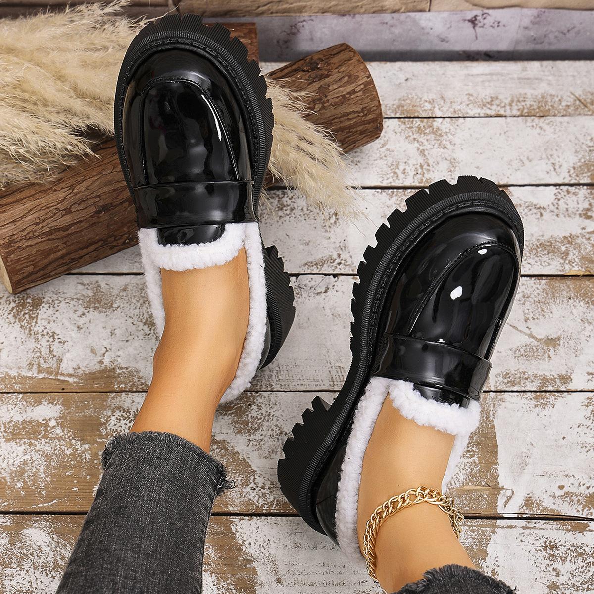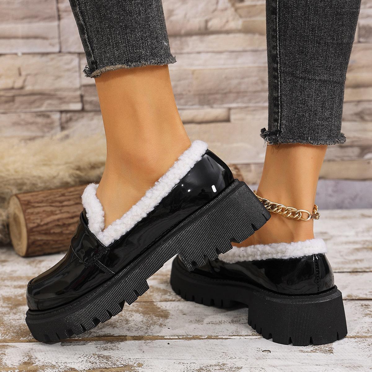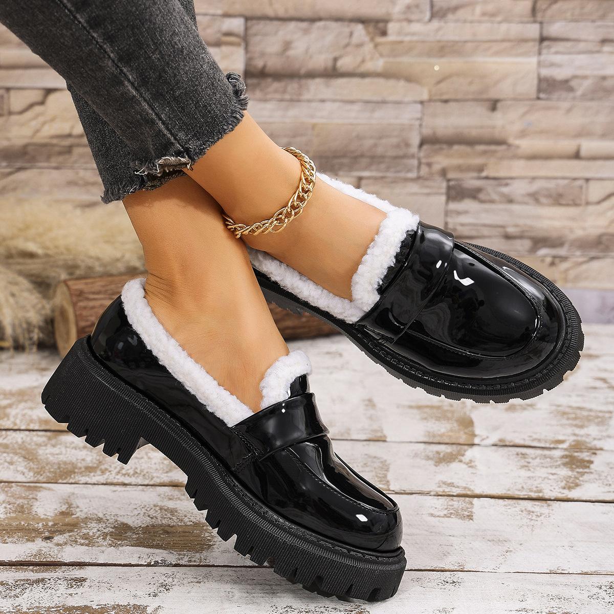 Zapatos de comercio exterior forrados de vellón para mujer 2024 otoño e invierno nuevos viento británico punta redonda cálidos mocasines de pedal al por mayor