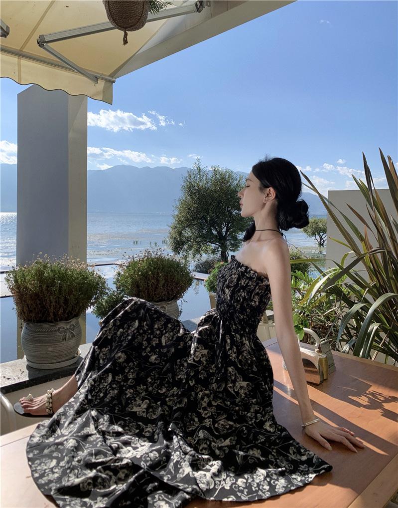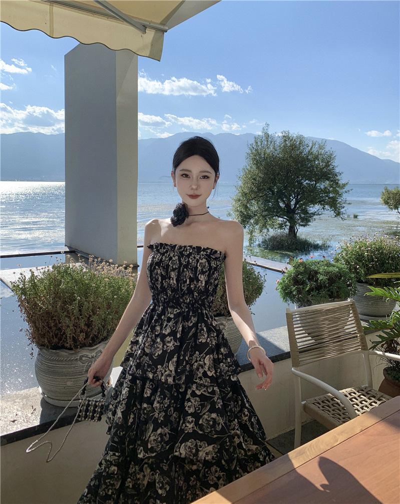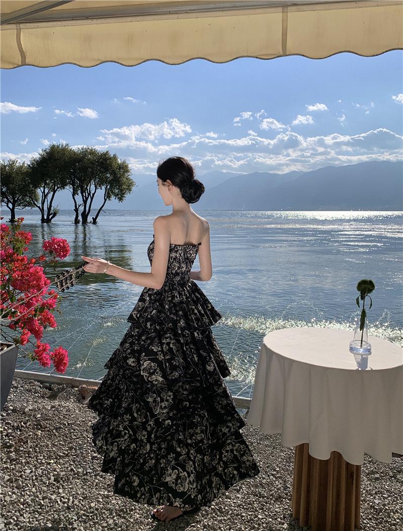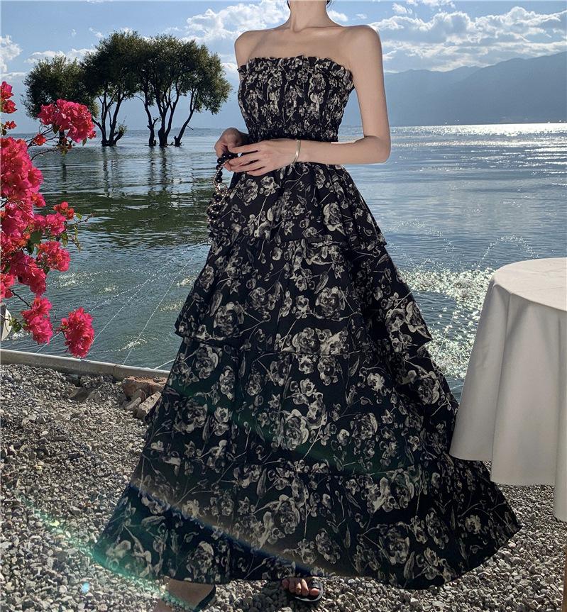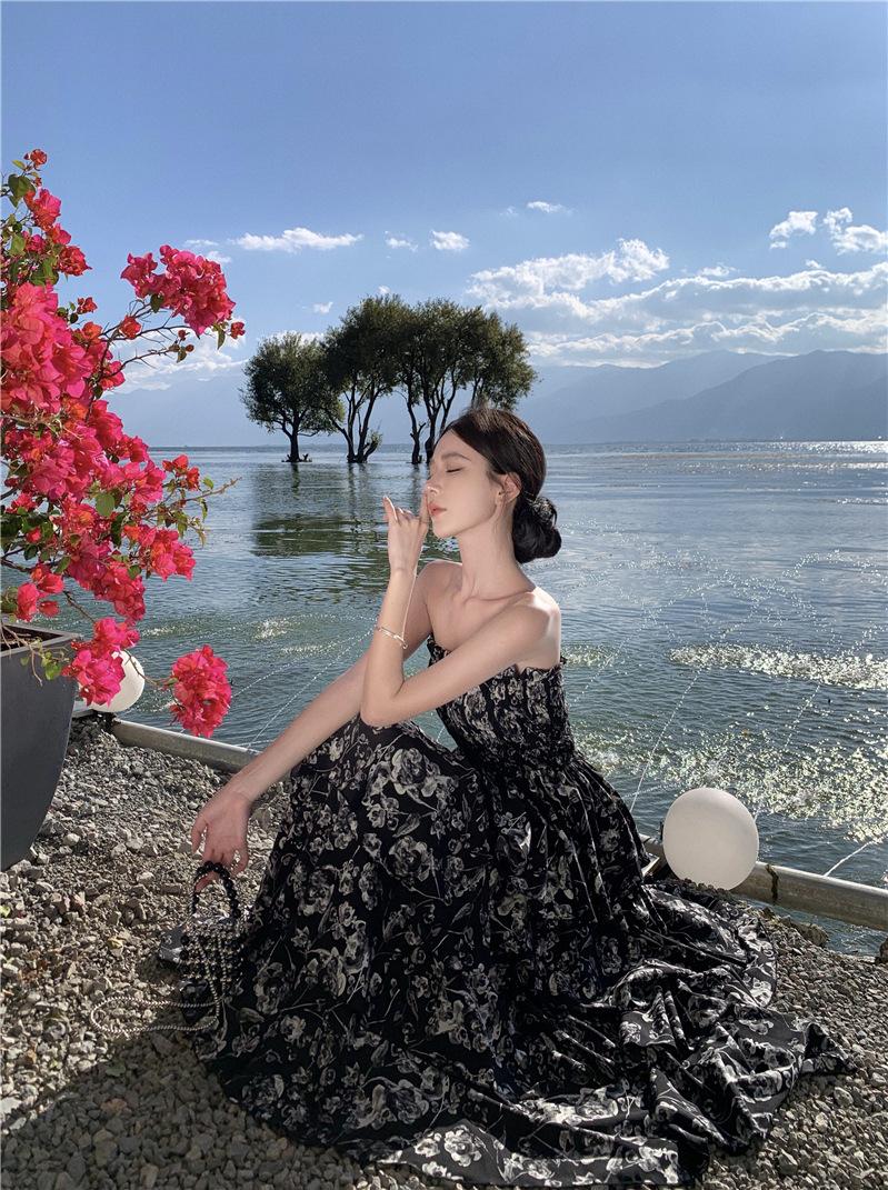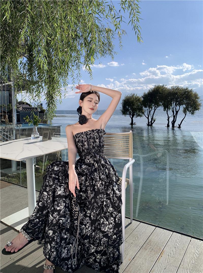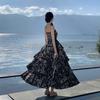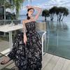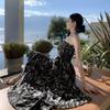 Vestido largo de verano estilo francés con hombros descubiertos, estampado negro, cruzado en el pecho, falda adelgazante con forma de pastel, vestido playero de fiesta