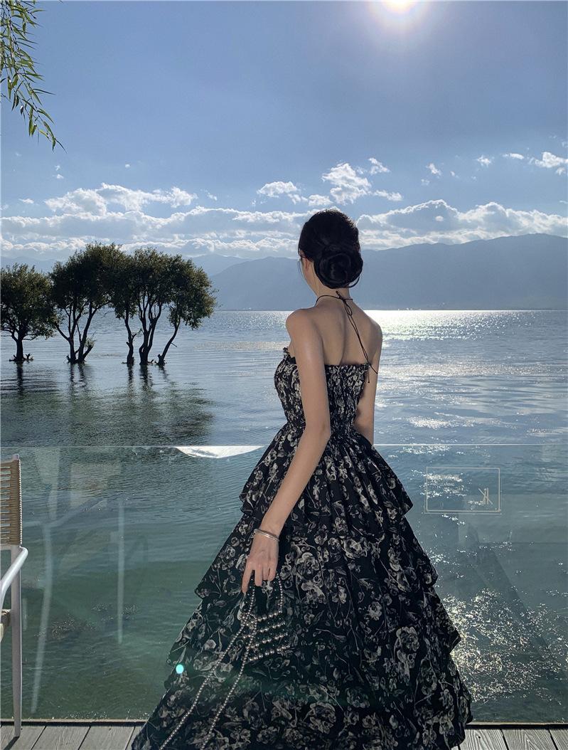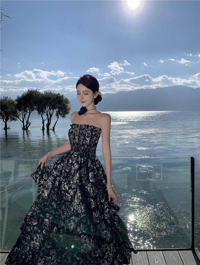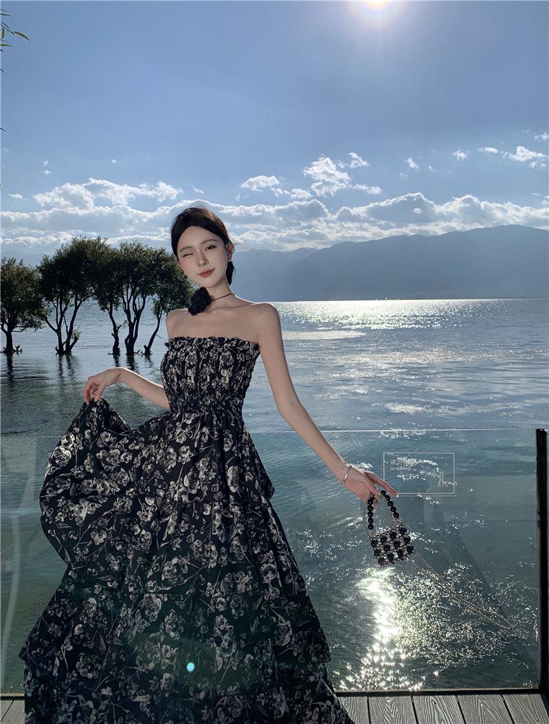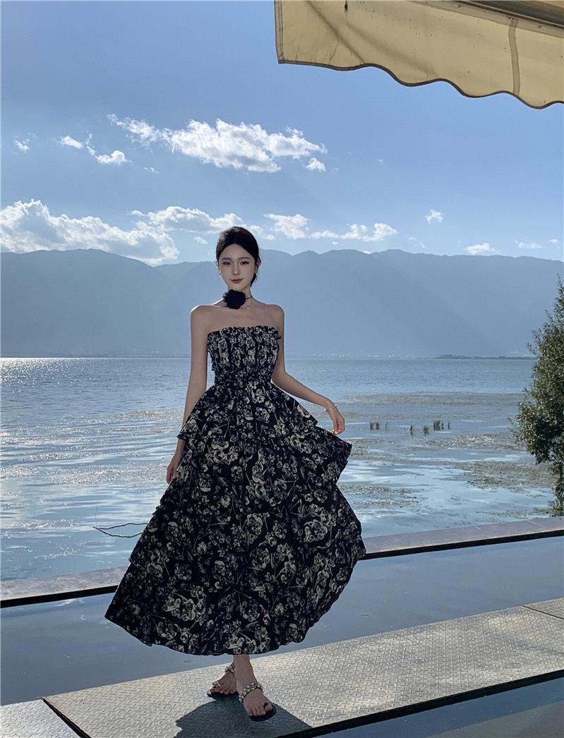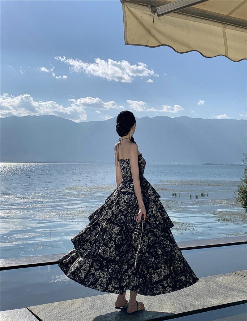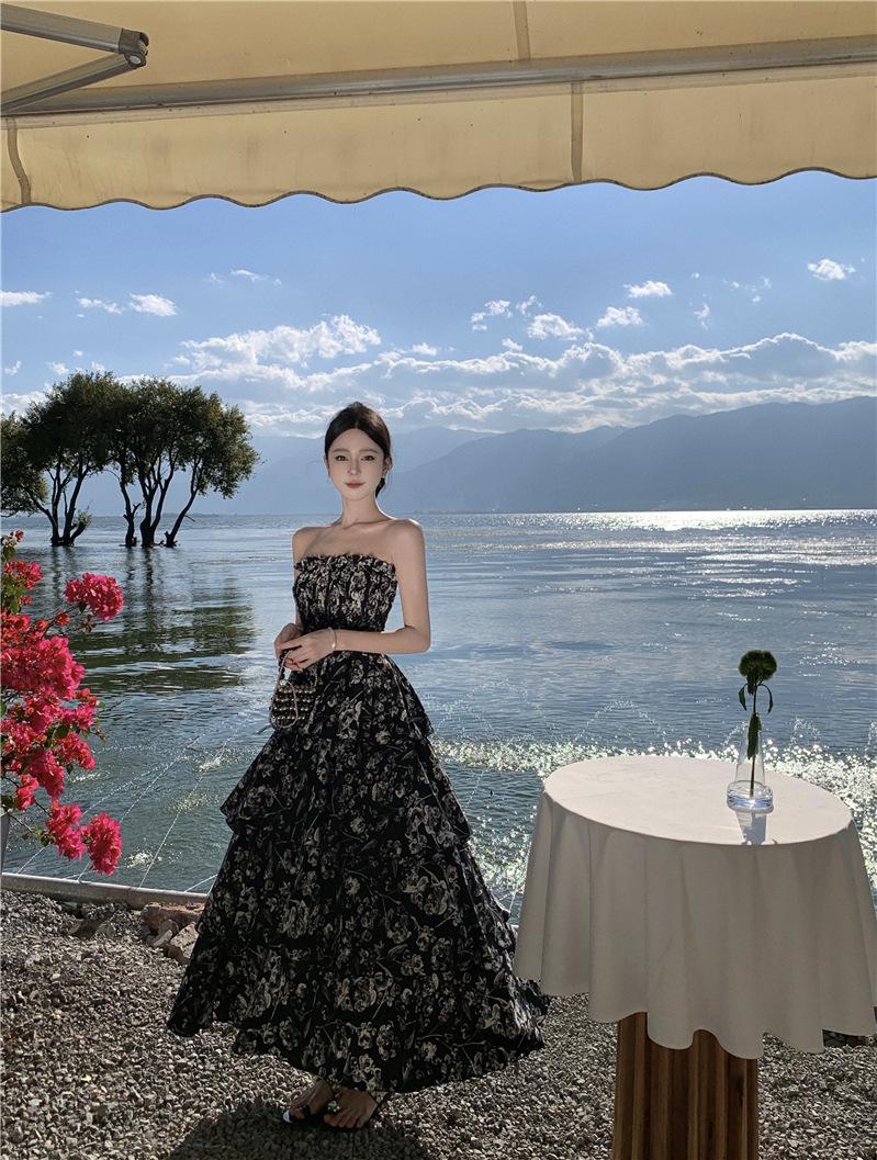 Vestido largo de verano estilo francés con hombros descubiertos, estampado negro, cruzado en el pecho, falda adelgazante con forma de pastel, vestido playero de fiesta