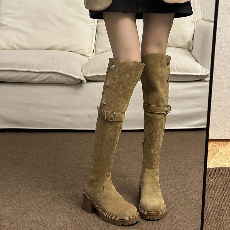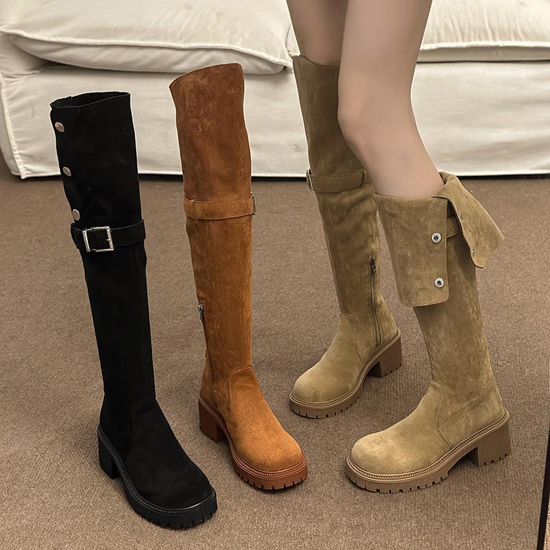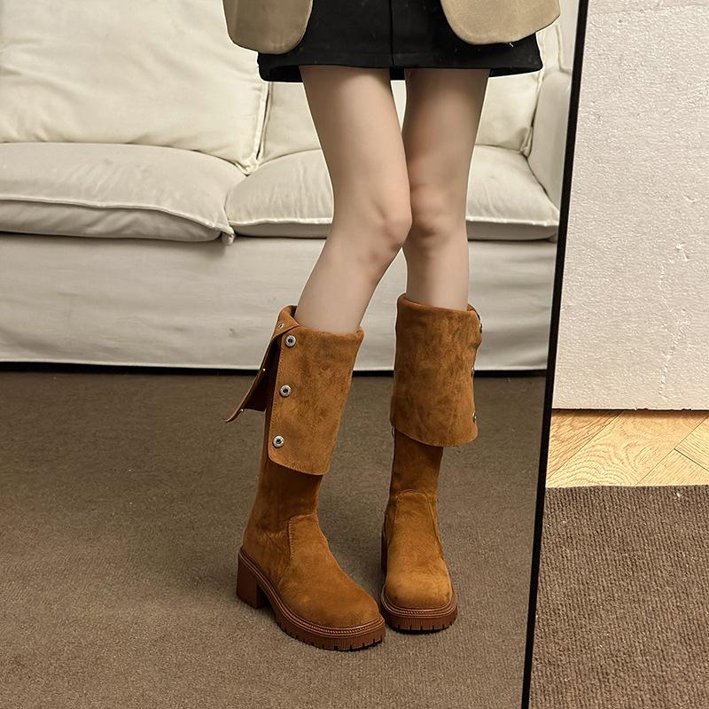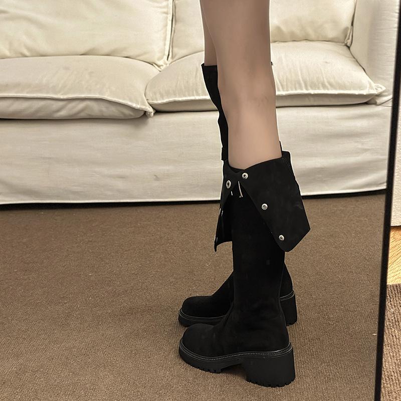 Botas elásticas plegables de dos rodillas para mujer, nuevas botas de caballero elegantes retro de gamuza de estilo coreano 2024, botas de moda de tacón grueso